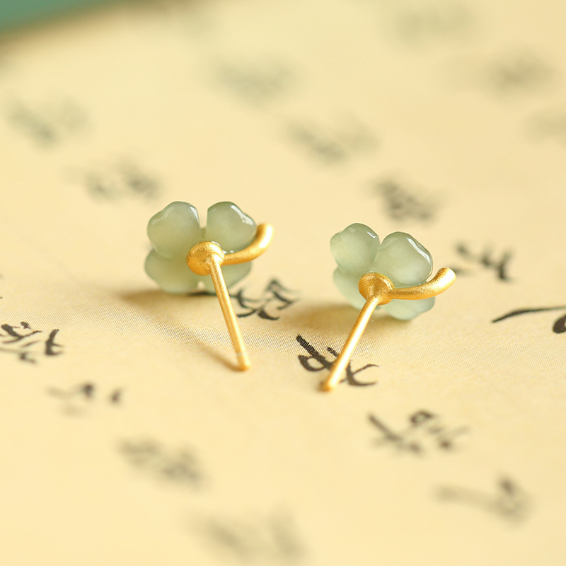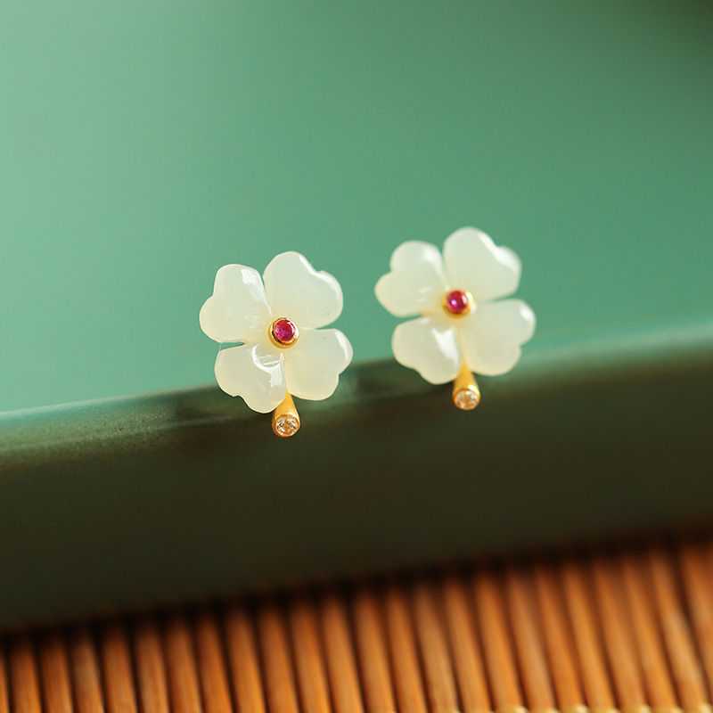 四叶草和田白玉耳钉纯银玉石花朵耳饰女高级感青玉耳环精致复古女