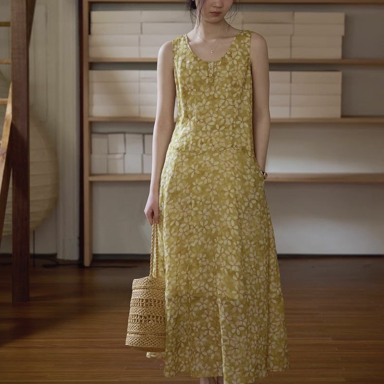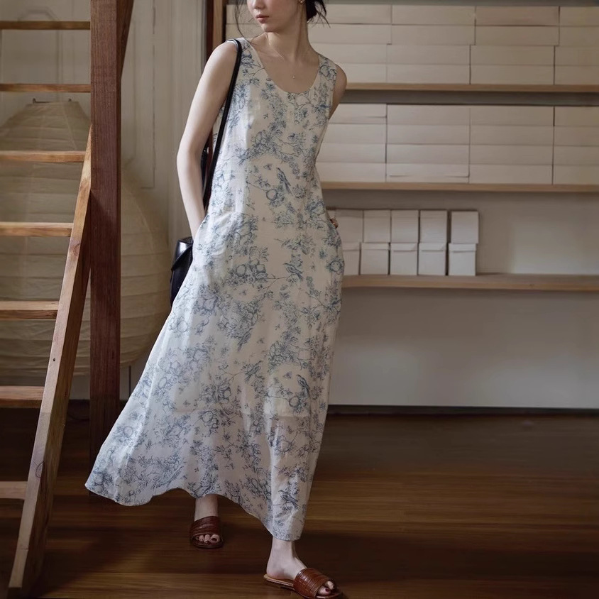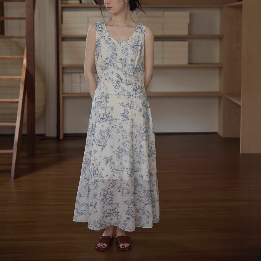 自然感手绘印花飘逸无袖背心连衣裙法式裙子女夏