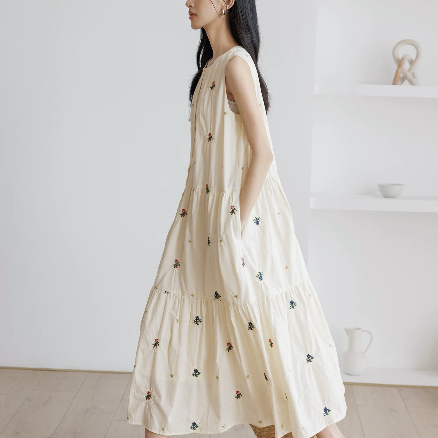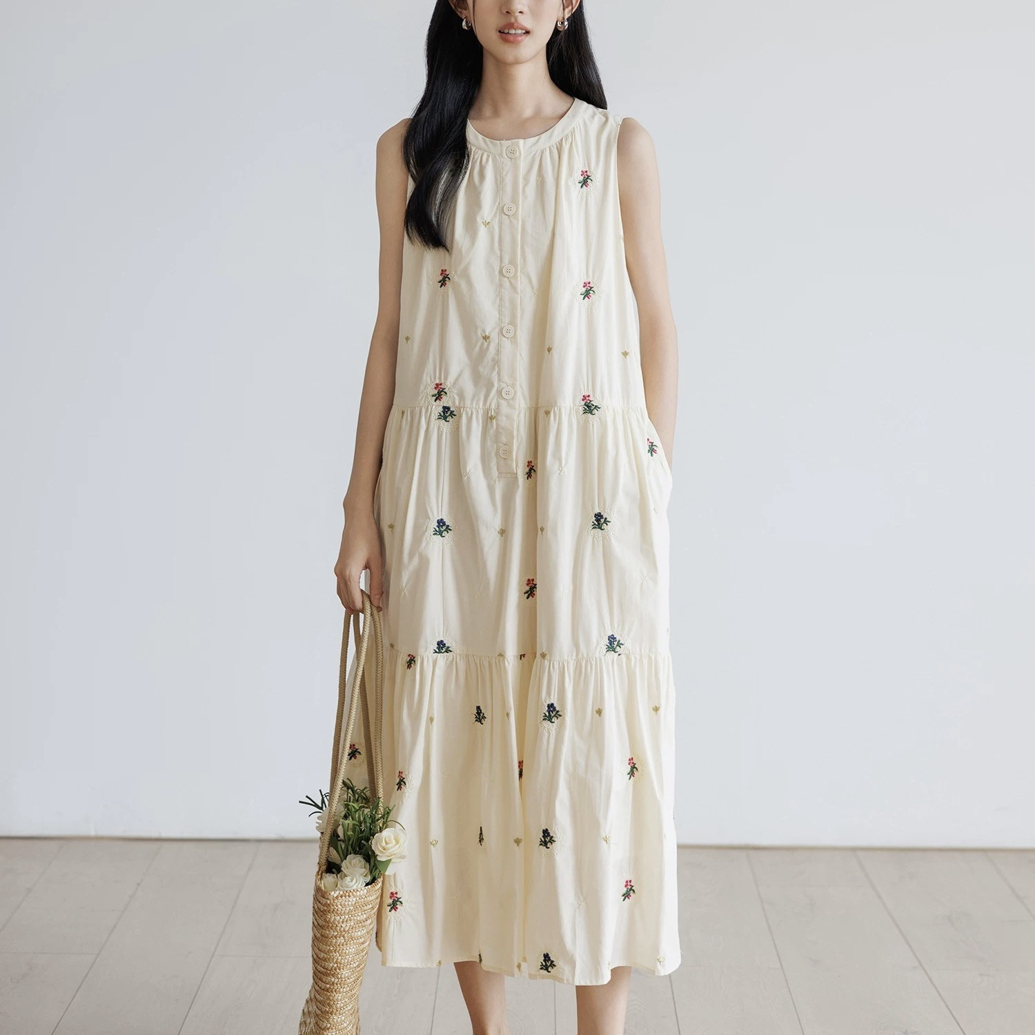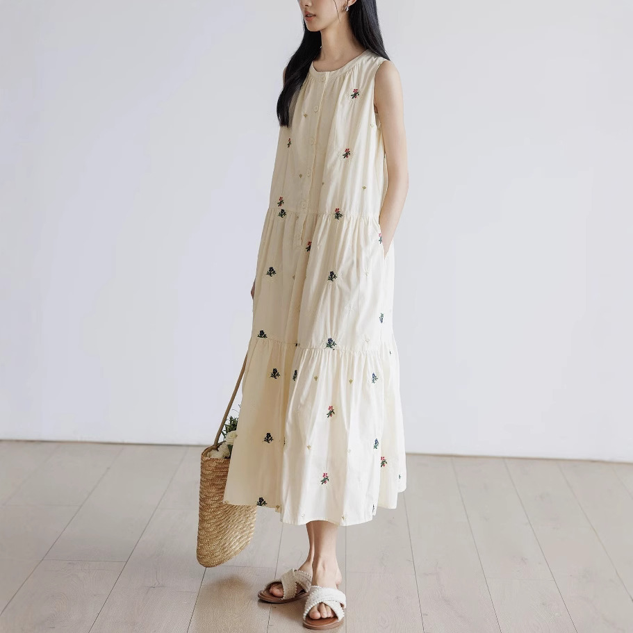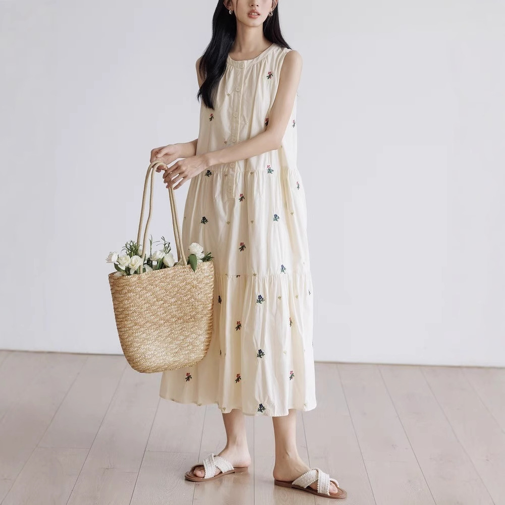 背心连衣裙女夏季2025新款刺绣圆领无袖a字裙宽松公主风度假长裙