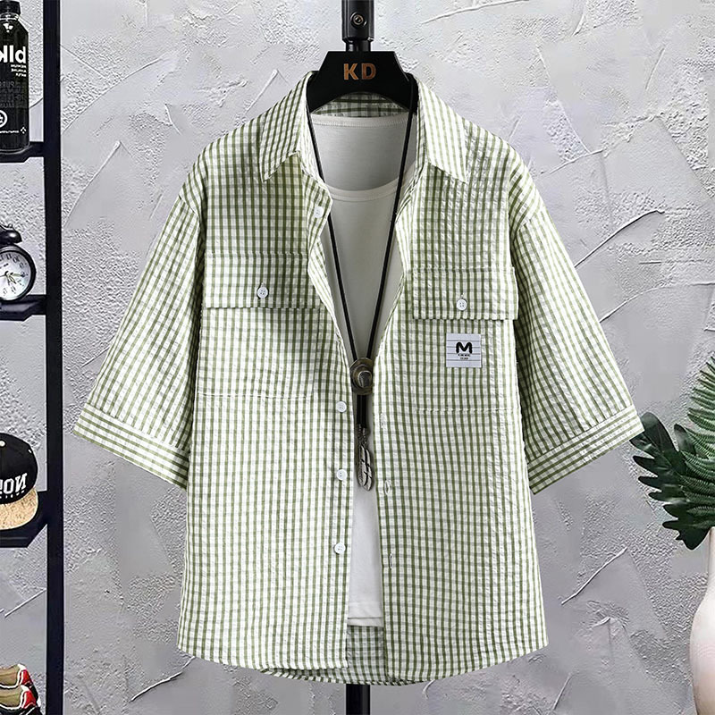 夏季新款五分袖男士条纹衬衫男短袖休闲潮流时尚宽松百搭中袖衬衣