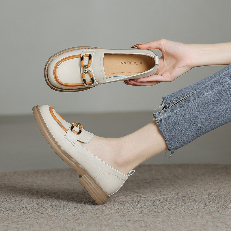 新款拼色小皮鞋女浅口圆头真皮软底乐福鞋女韩版英伦风单鞋