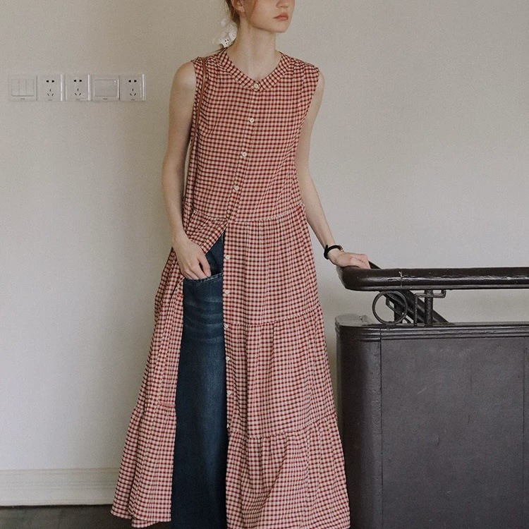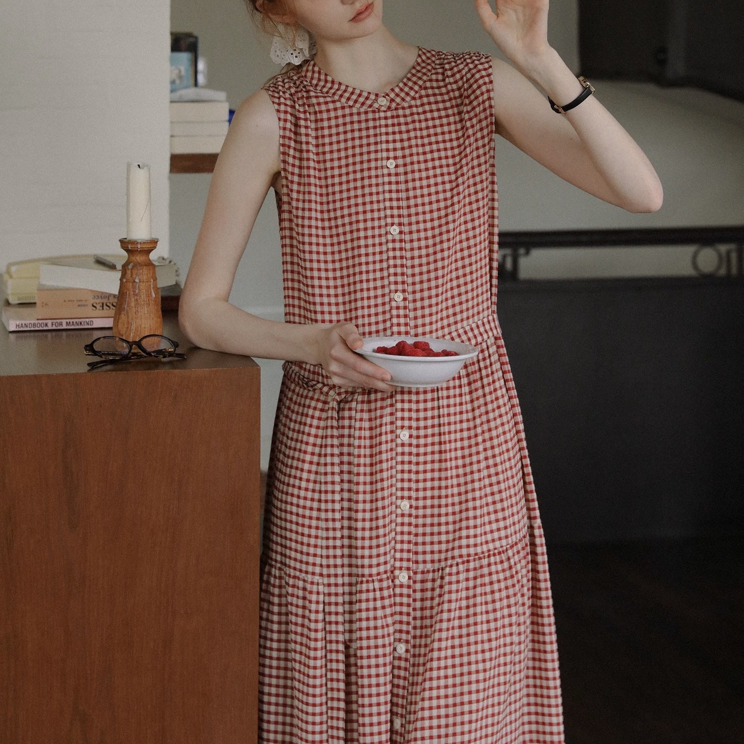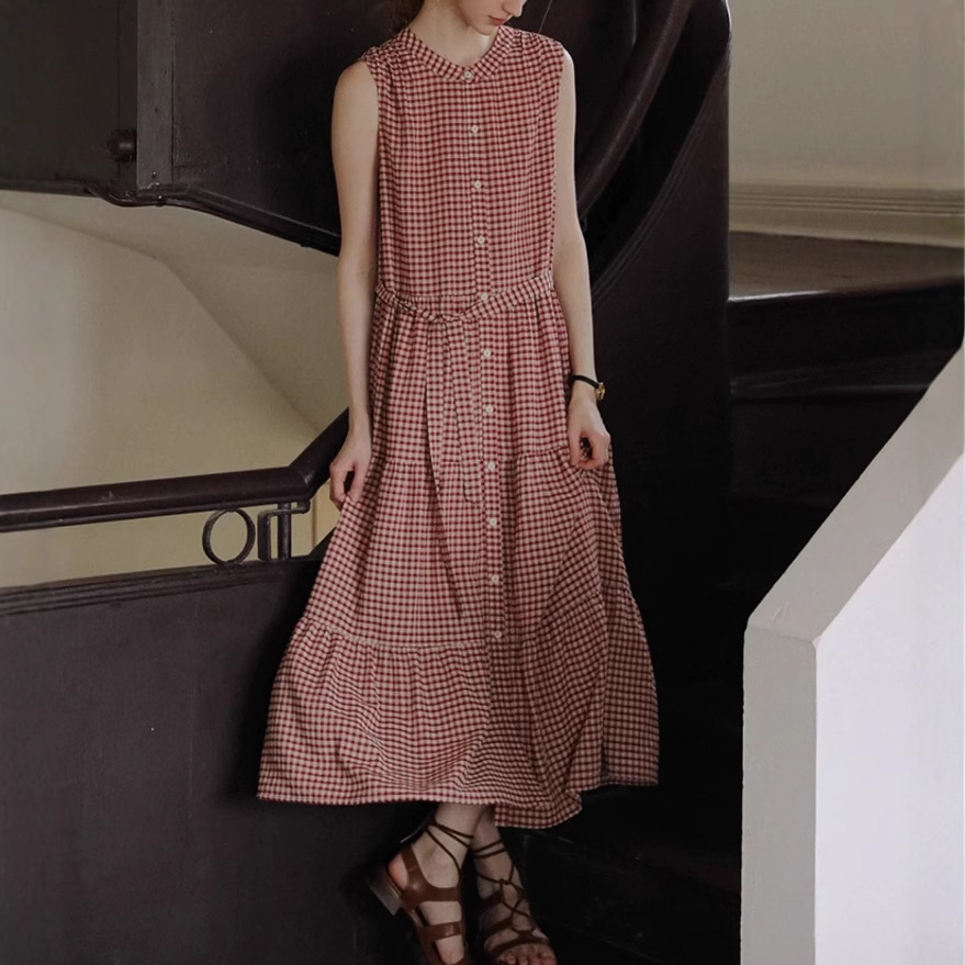 MELLIY 2025年新款法式复古高腰蛋糕裙女夏季无袖格纹系带衬衫裙