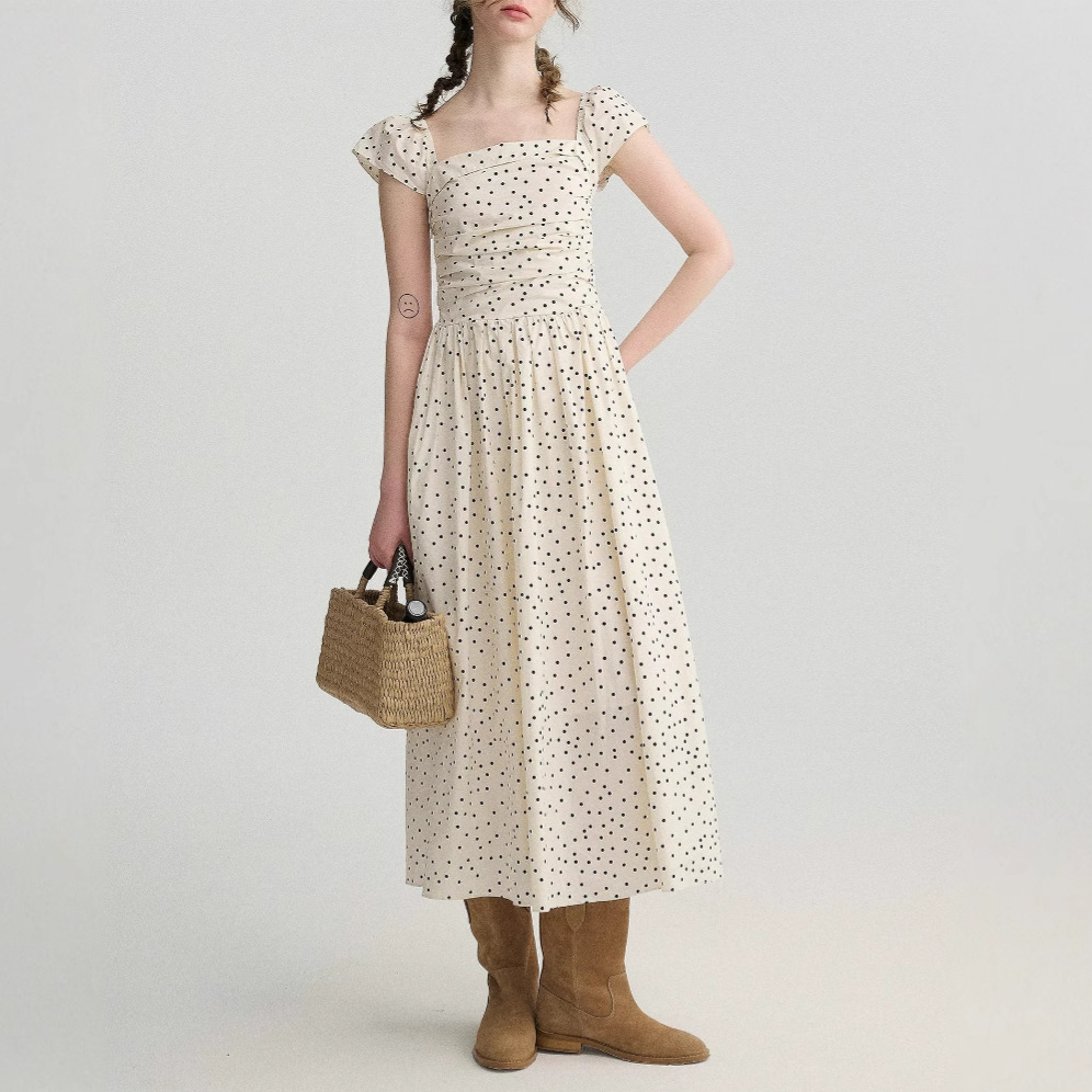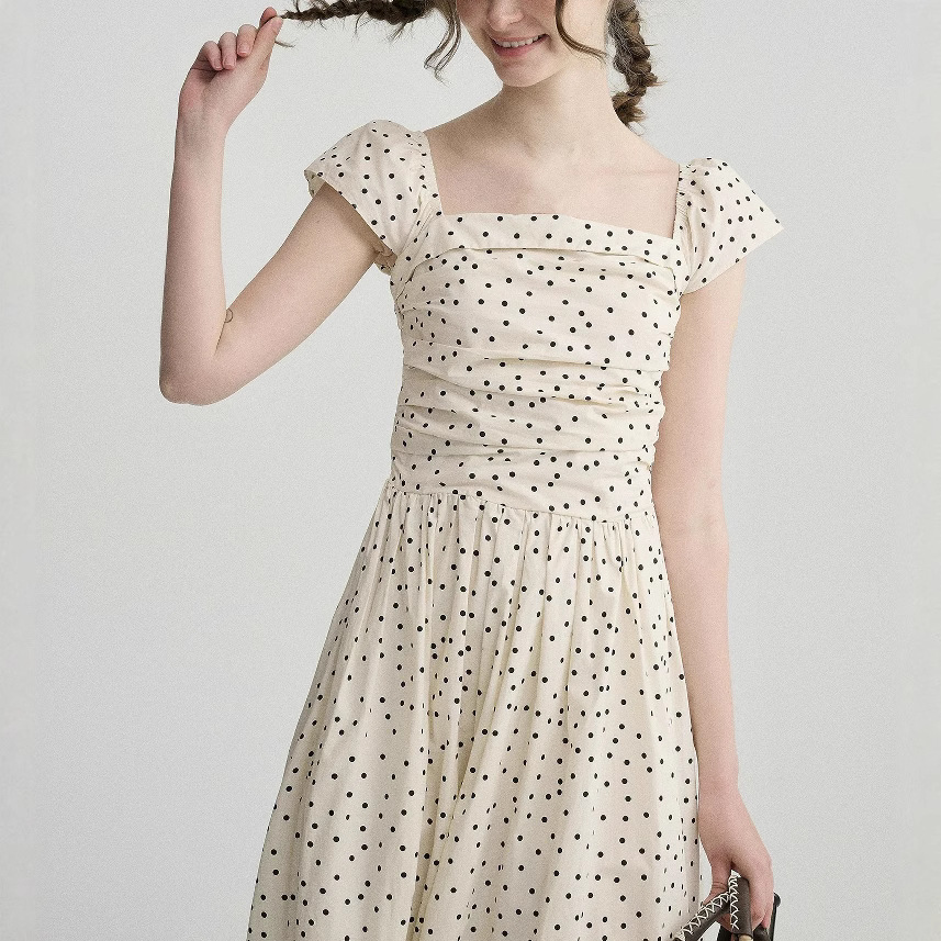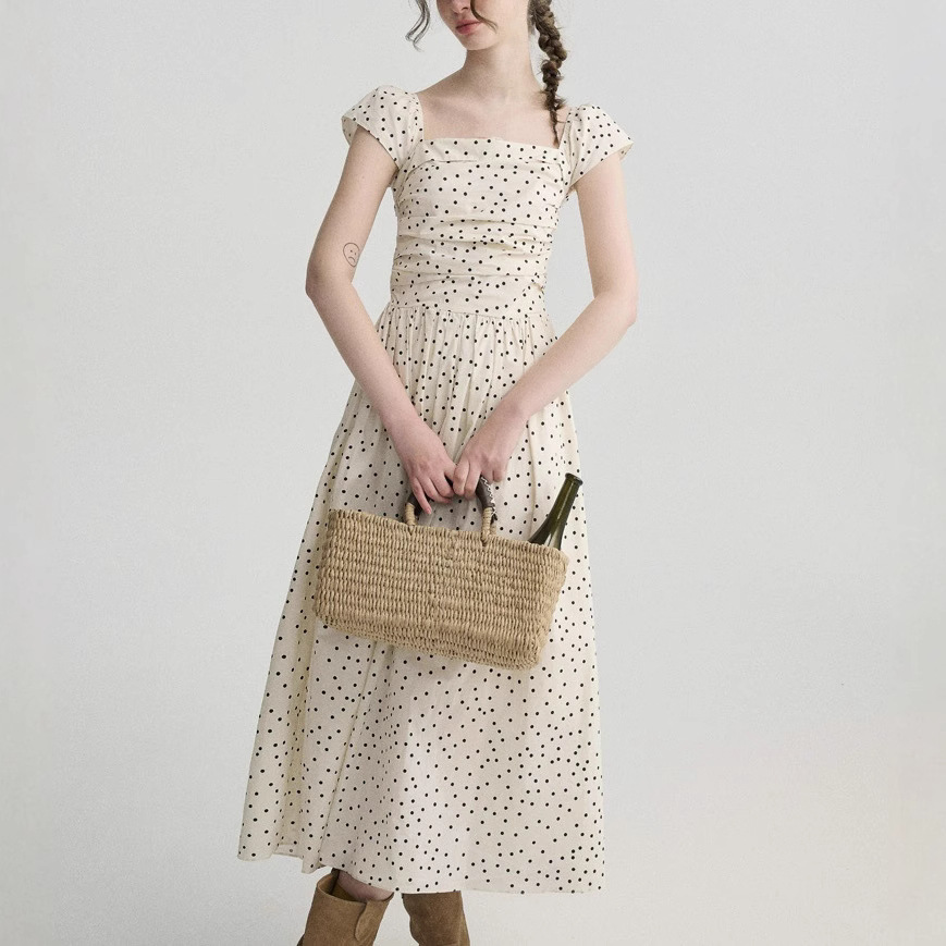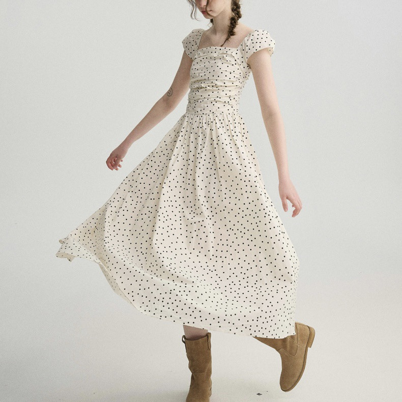 波西米亚' 杏色波点打揽收腰小飞袖中长款连衣裙新款女装