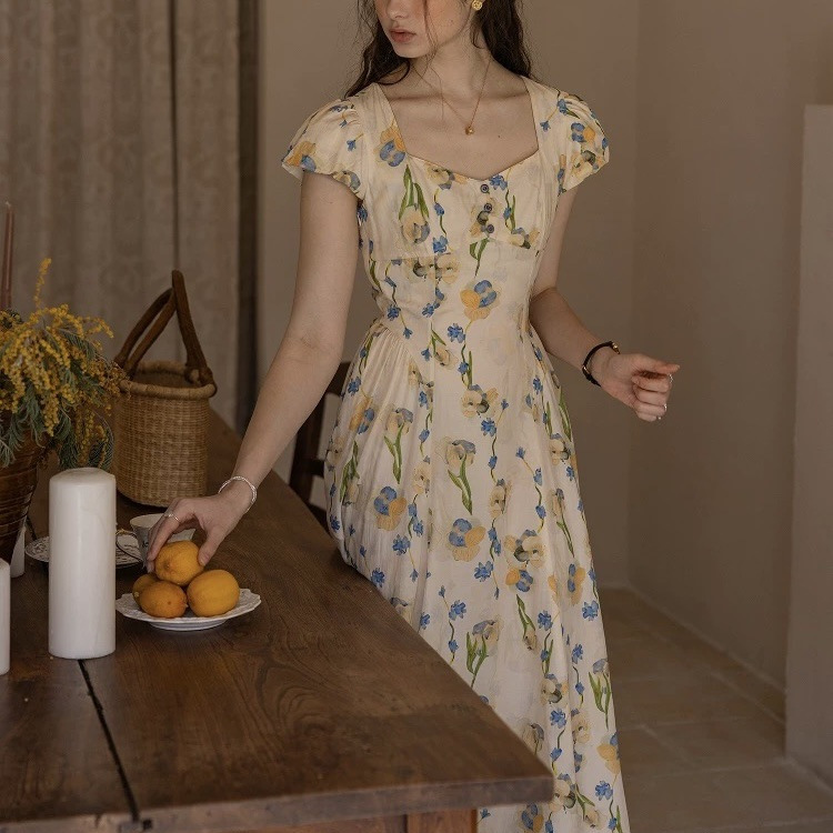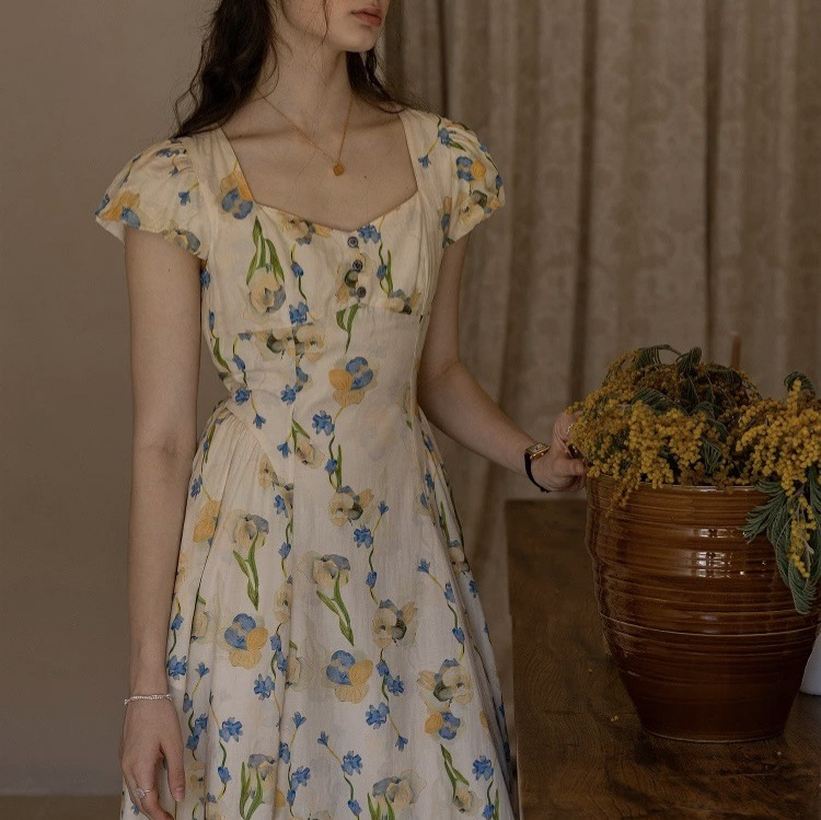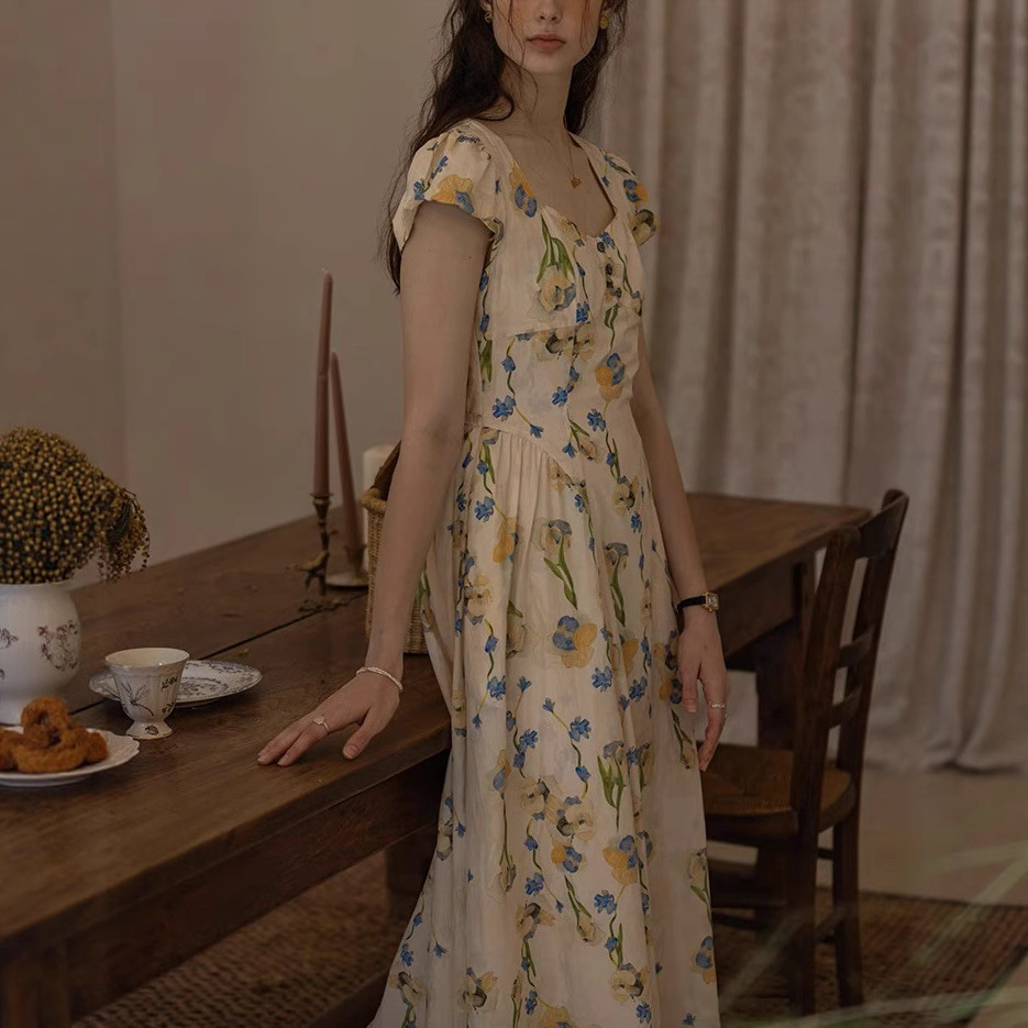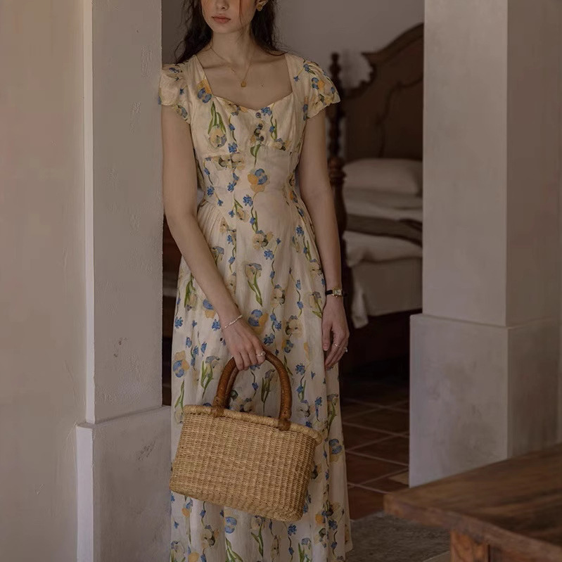 法式泡泡袖方领公主裙刺绣碎花裙夏季复古气质收腰连衣裙SS