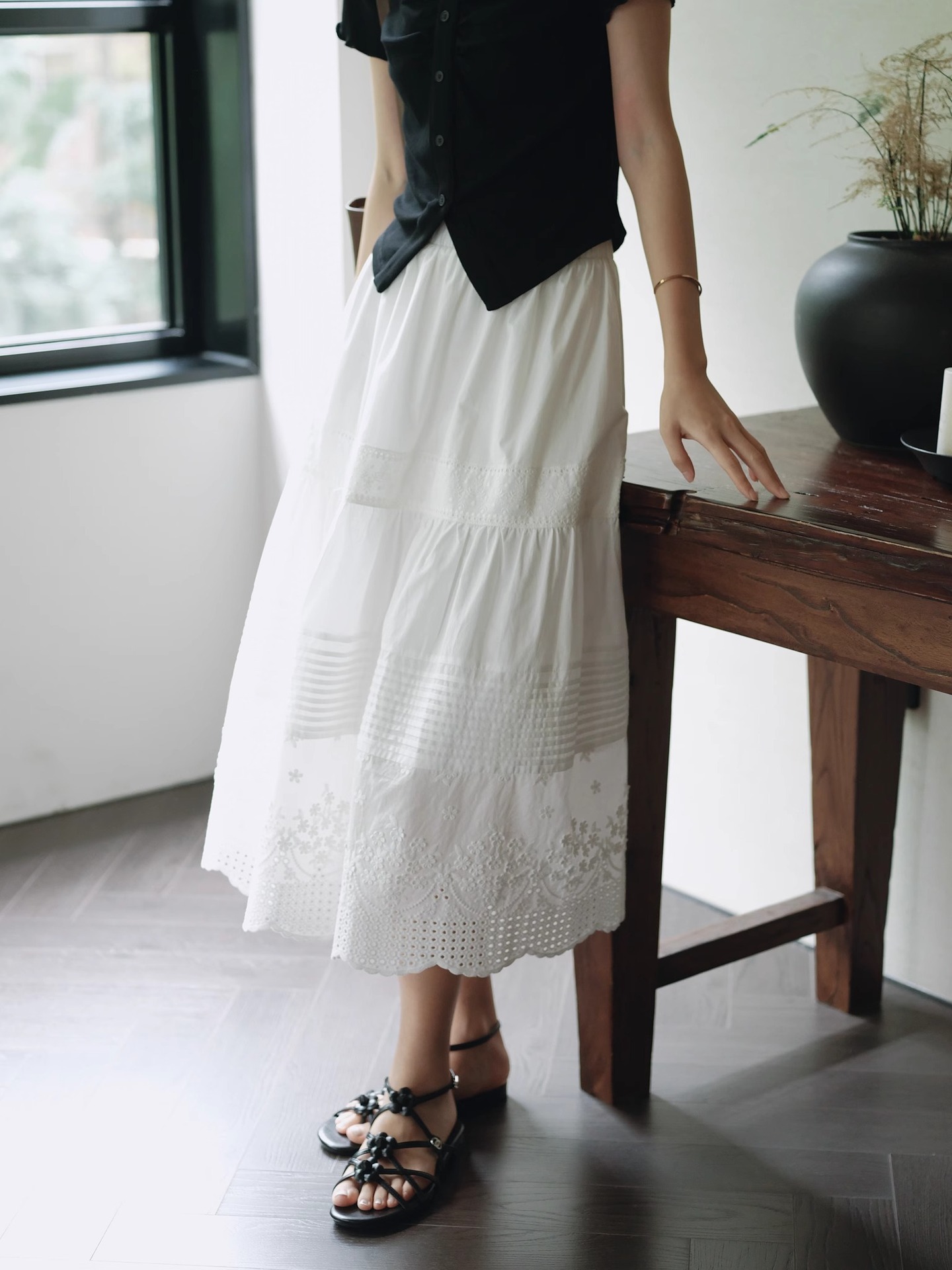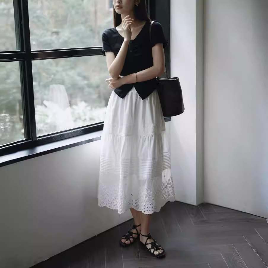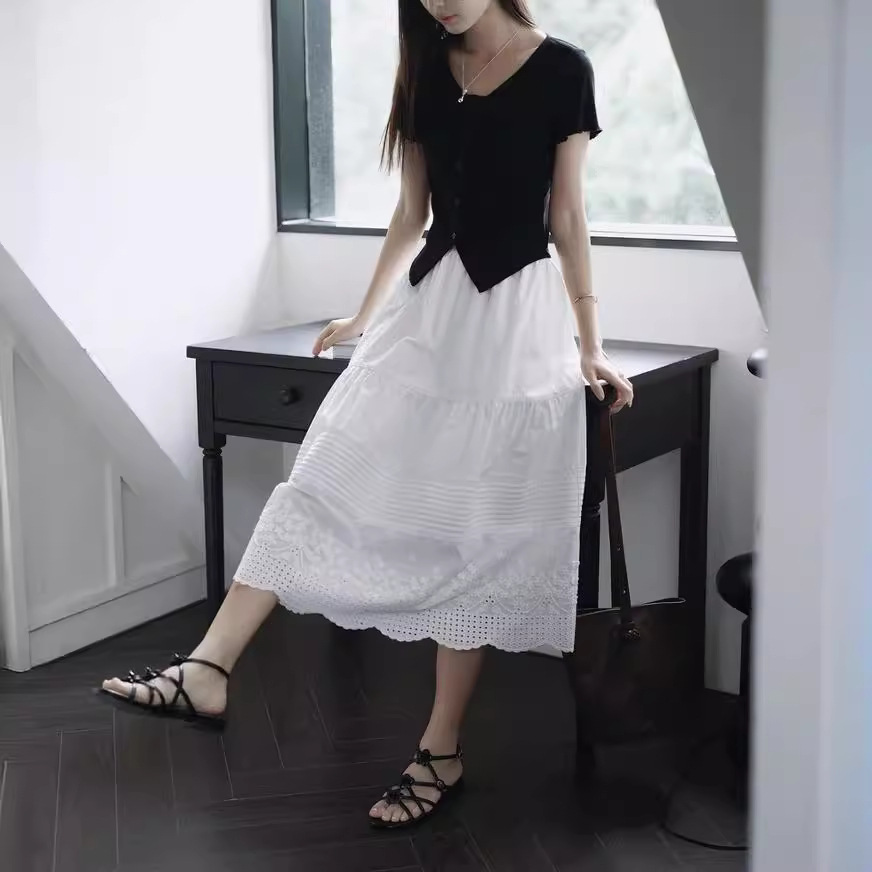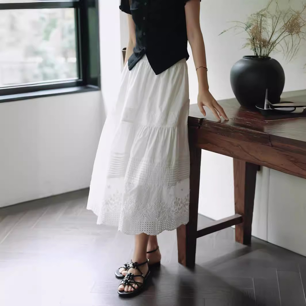 重工法式白色花边长裙a字夏季新款打褶半身裙女设计感