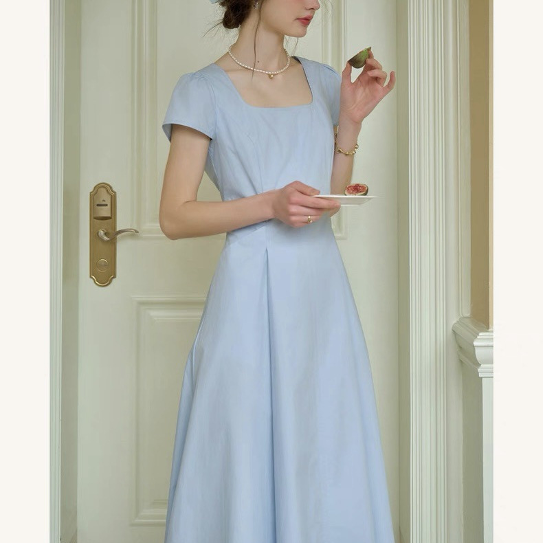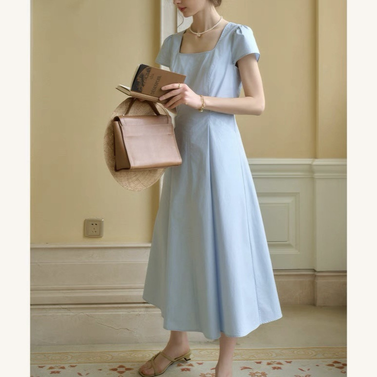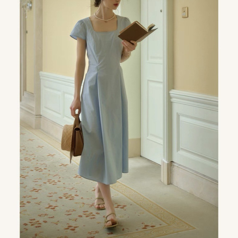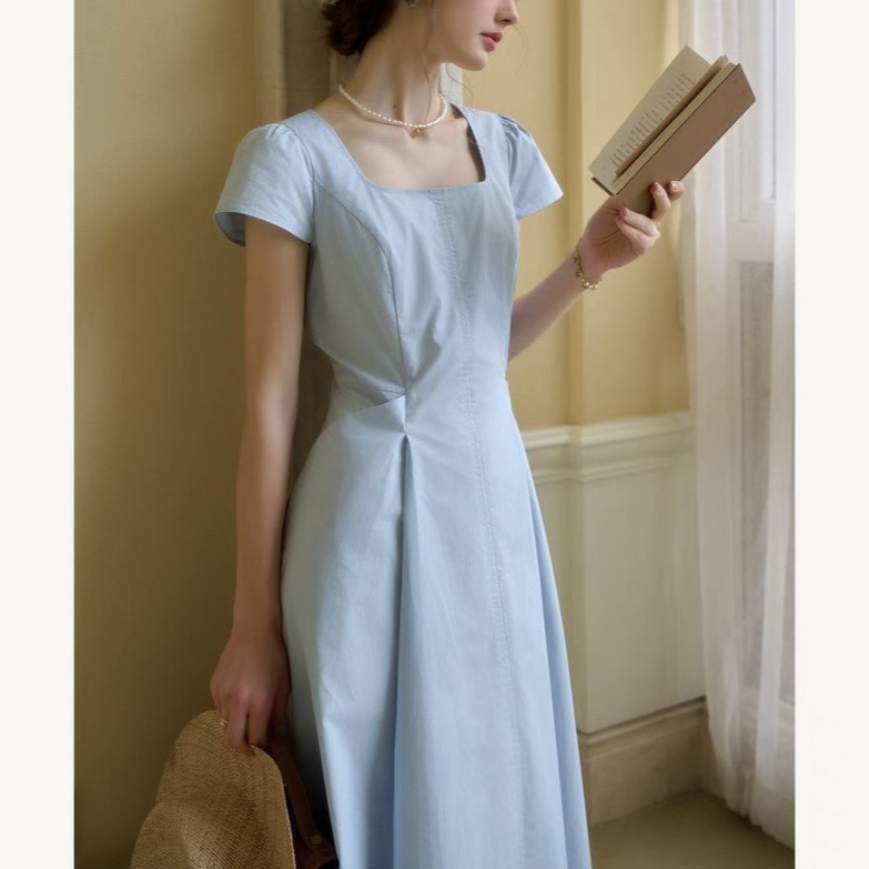 法式通勤蓝色连衣裙女纯棉凉感舒爽气质收腰显瘦长裙