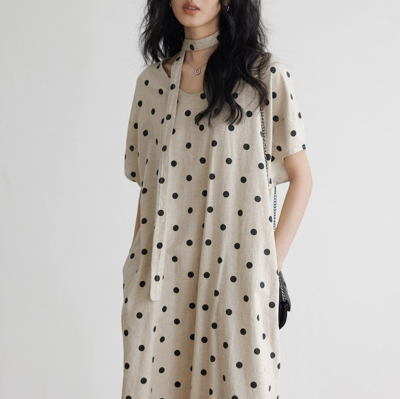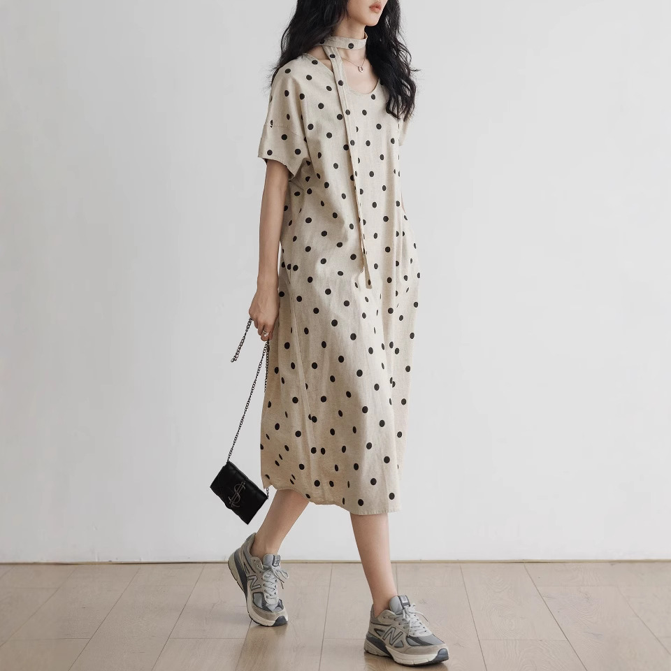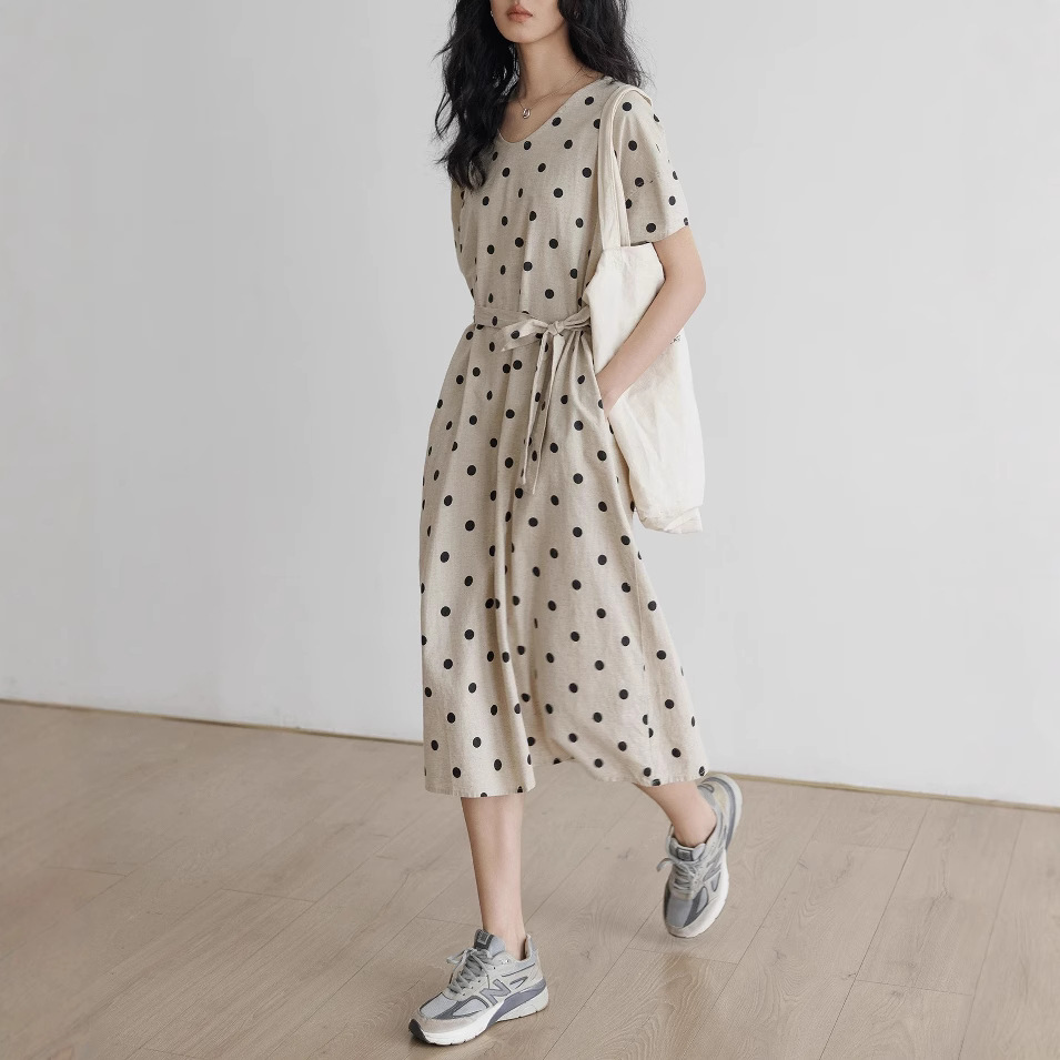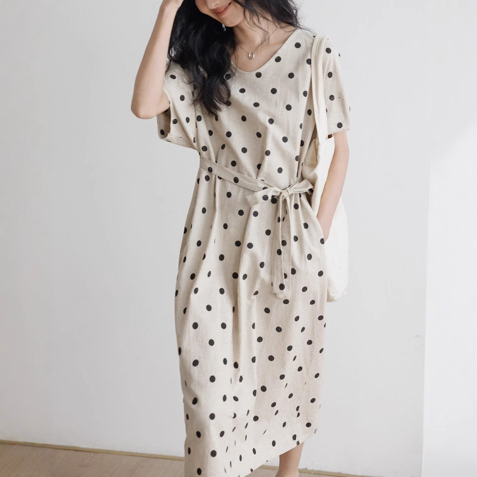 复古高级感连衣裙女夏季2025新款v领波点棉麻短袖宽松长裙a字裙