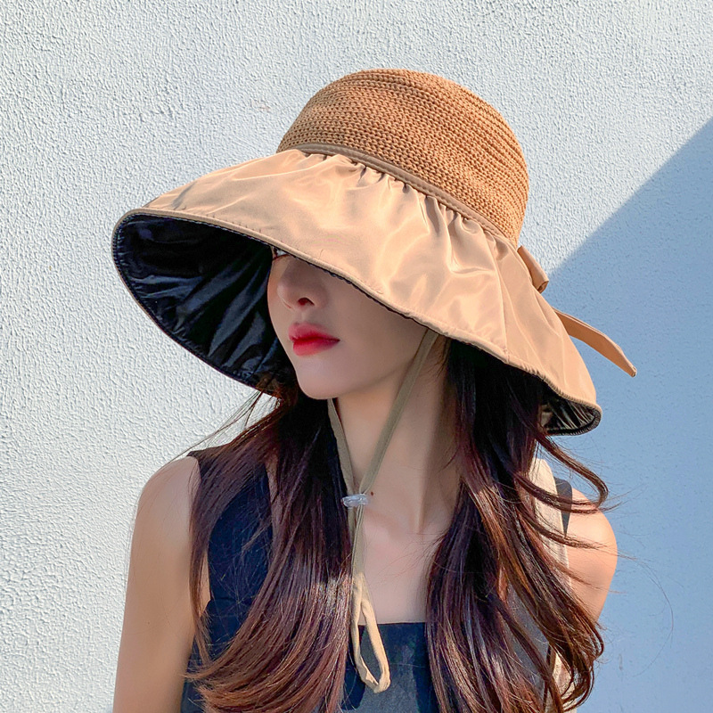 黑胶蝴蝶结镂空草帽遮阳帽女夏季防紫外线大檐遮脸防晒太阳渔夫帽