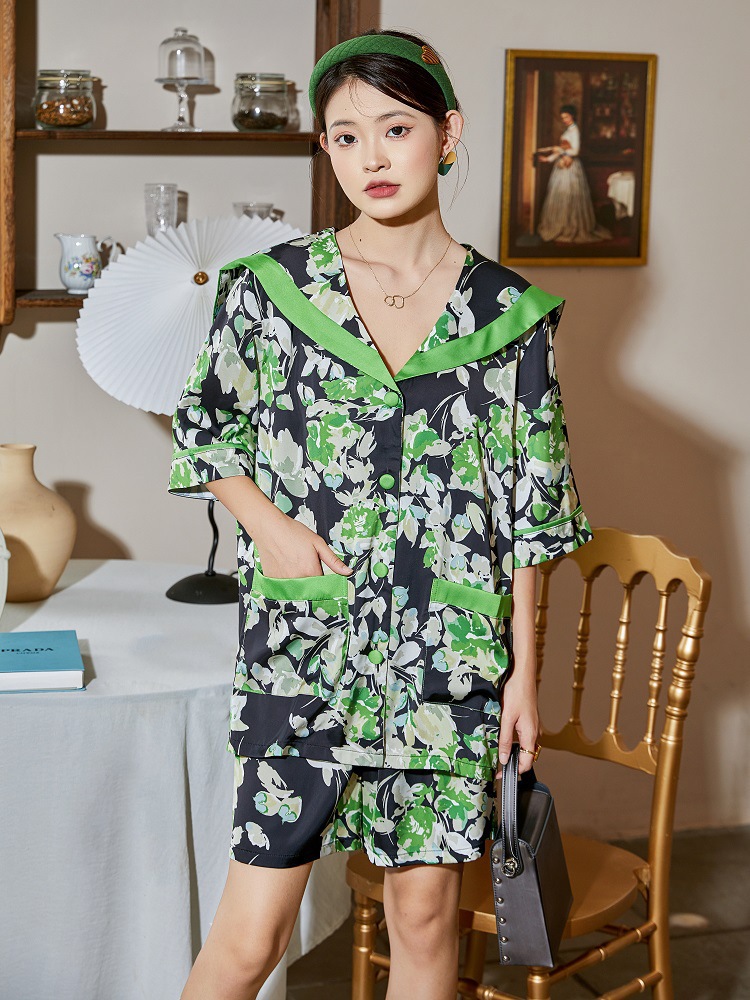 新款莫奈花园夏季印花可外穿冰丝长裤短袖睡衣女套装家居服
