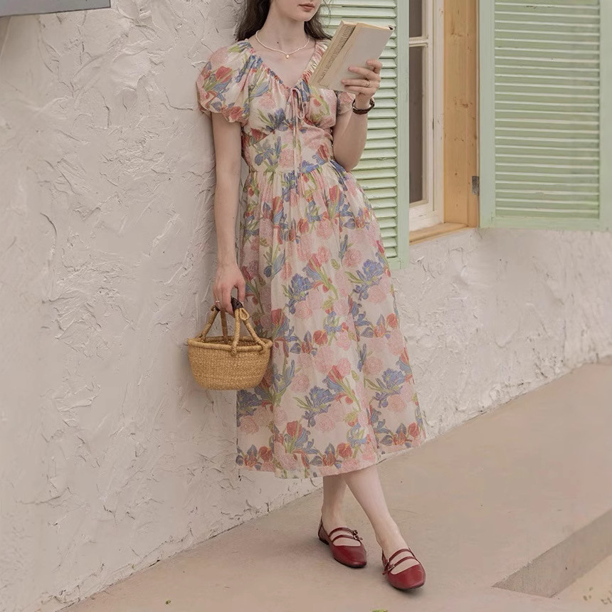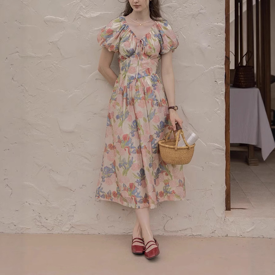 法式气质连衣裙女显瘦海边度假风油画裙子碎花长裙