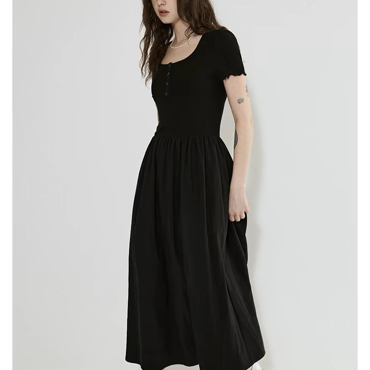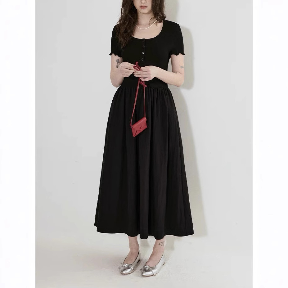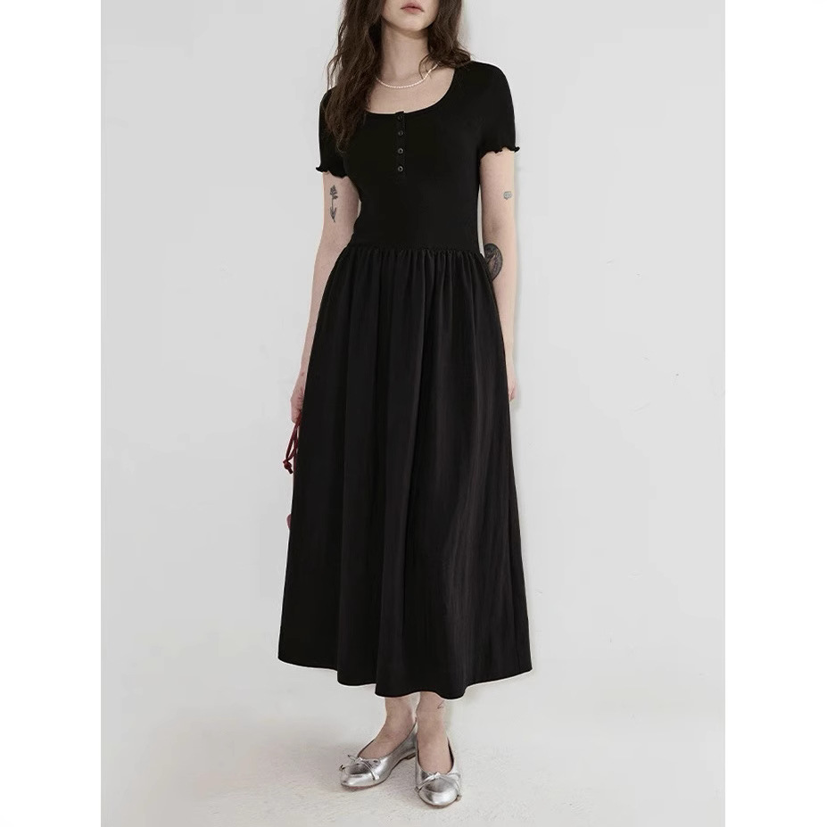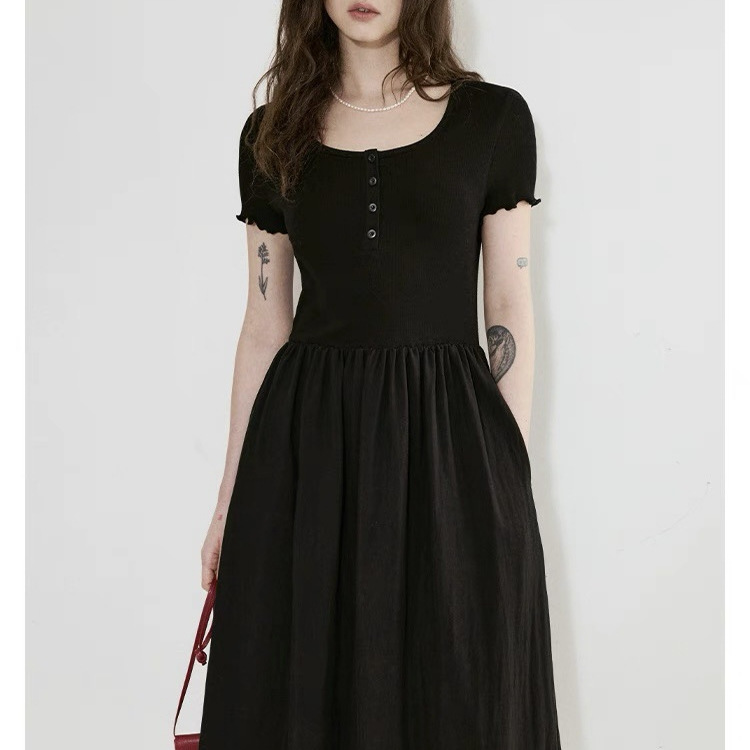 赫本风亨利领针梭拼设计简洁修身显瘦连衣裙女2025新款