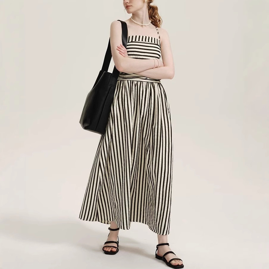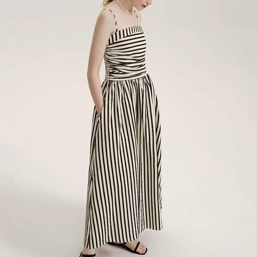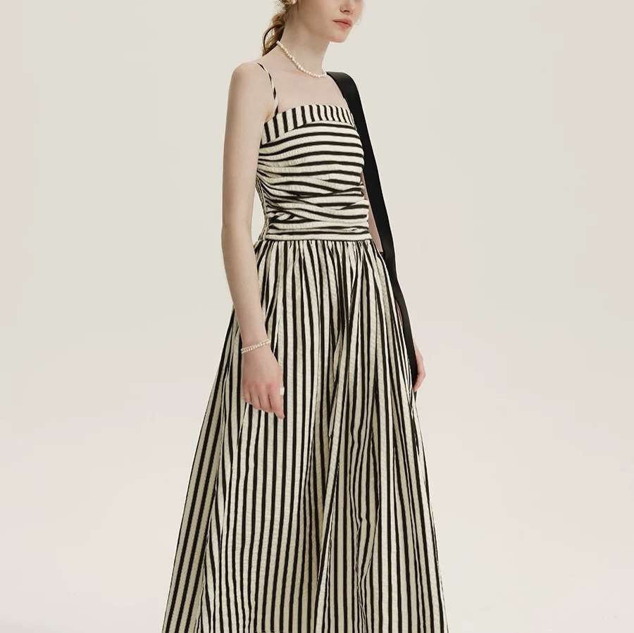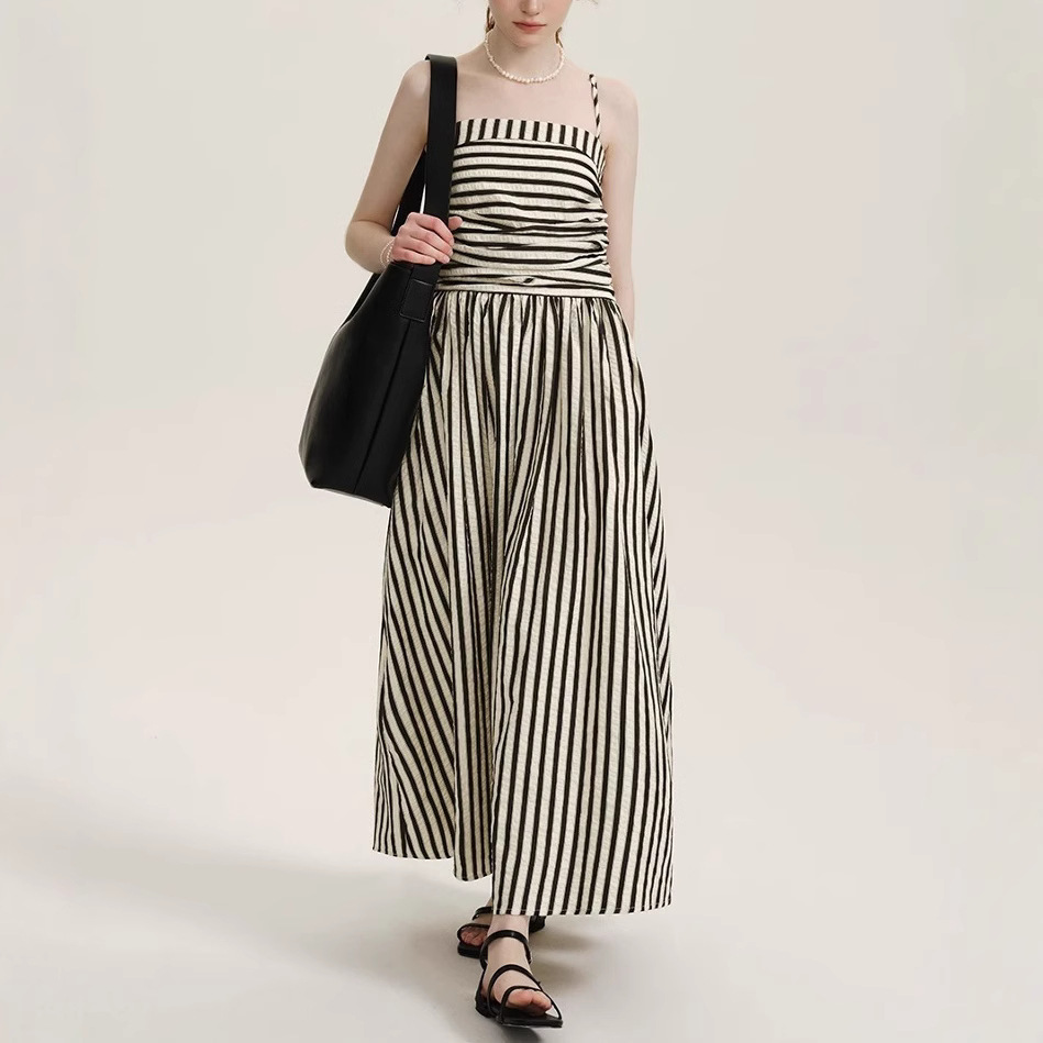 法式拼接条纹吊带连衣裙高级感褶皱收腰长款A字裙