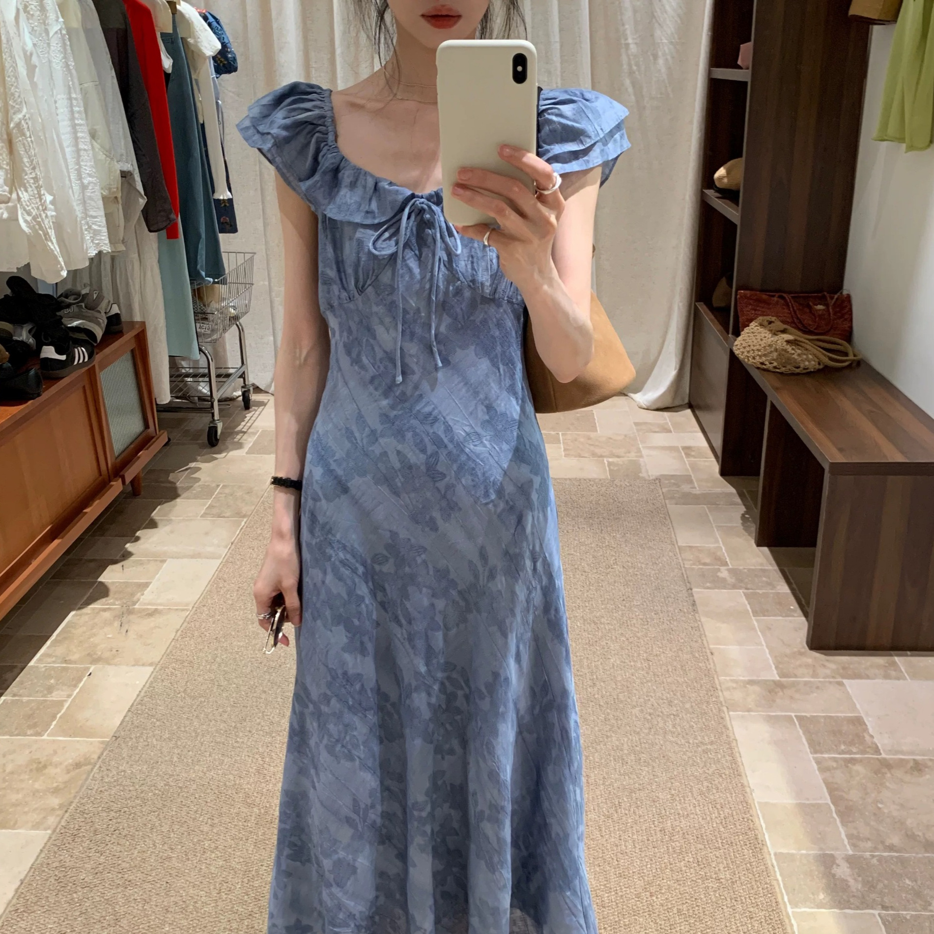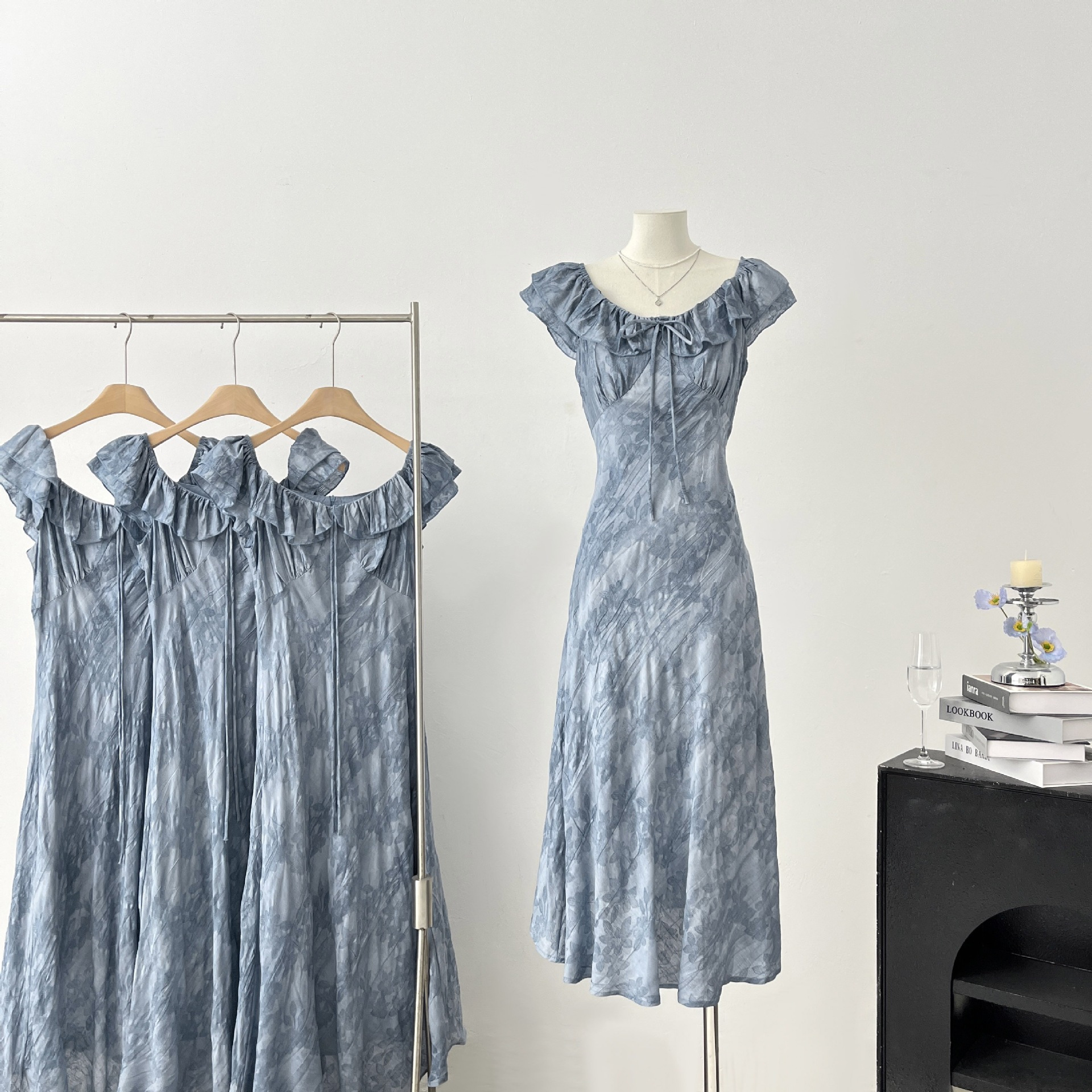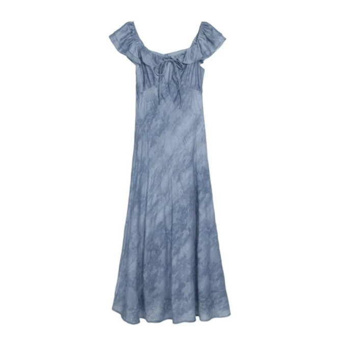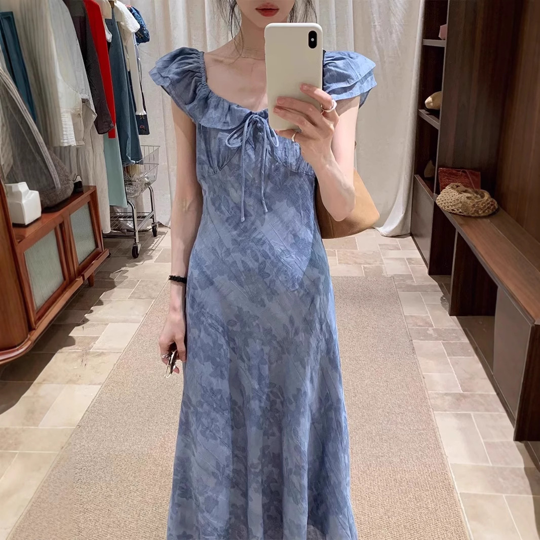 「清风蓝调」方领连衣裙女夏季新款复古显瘦长裙