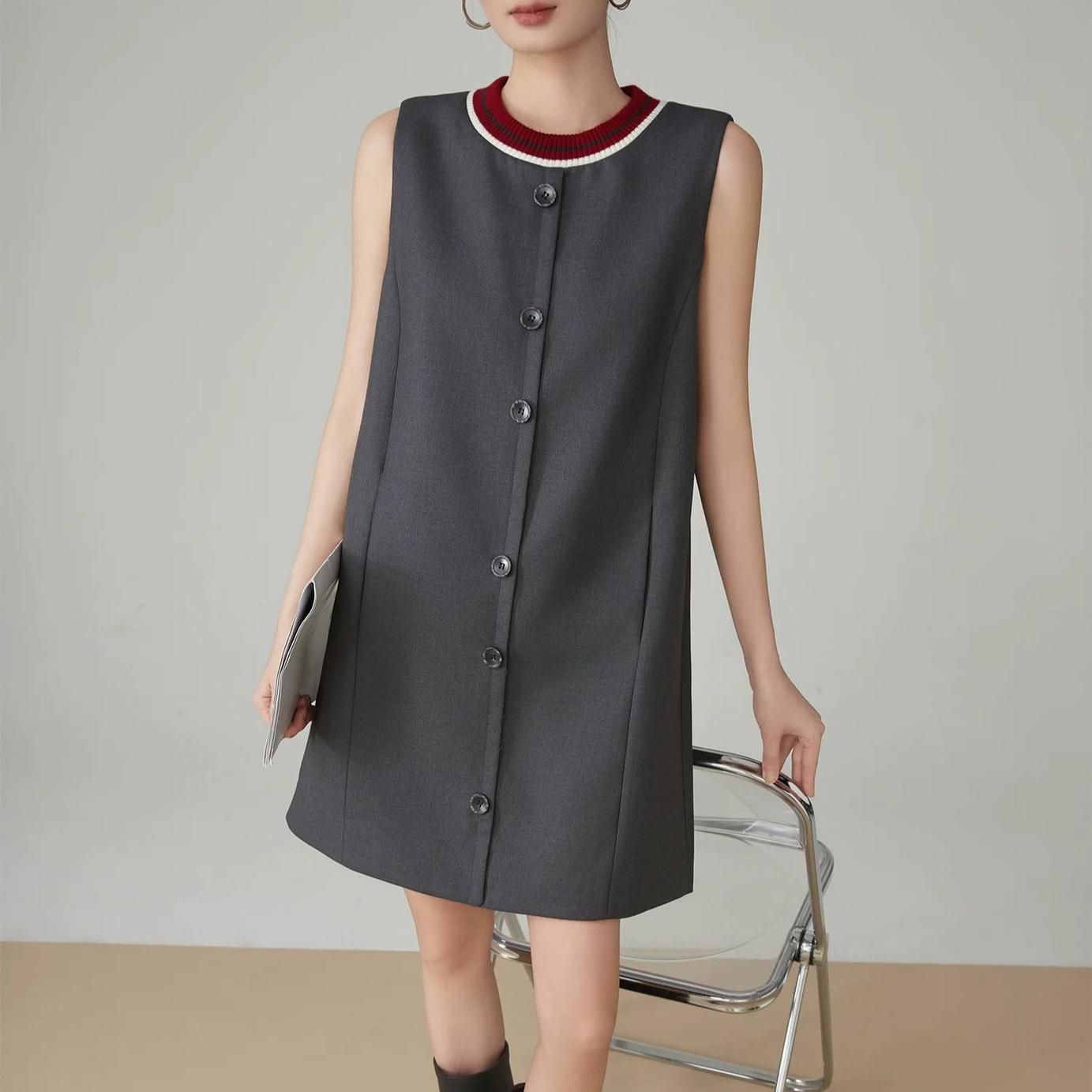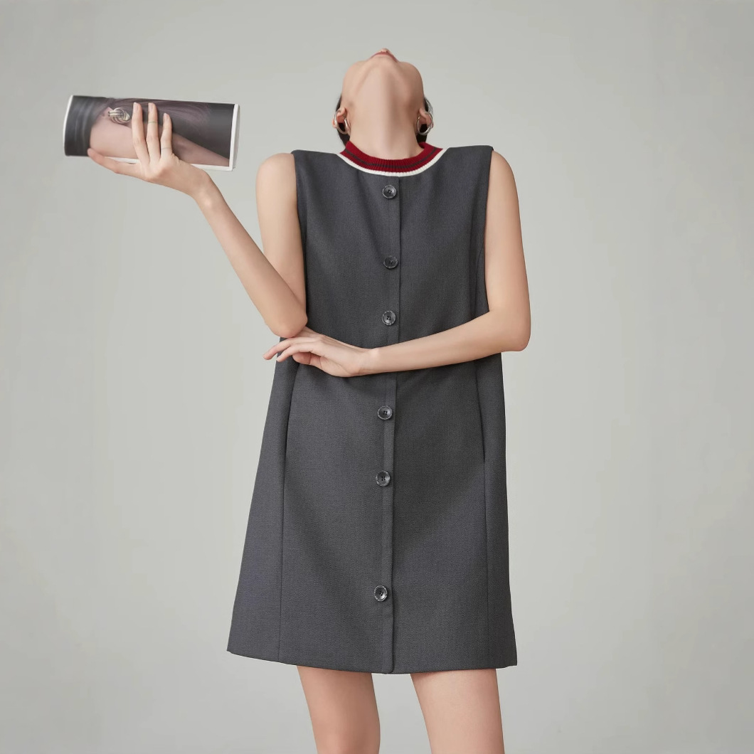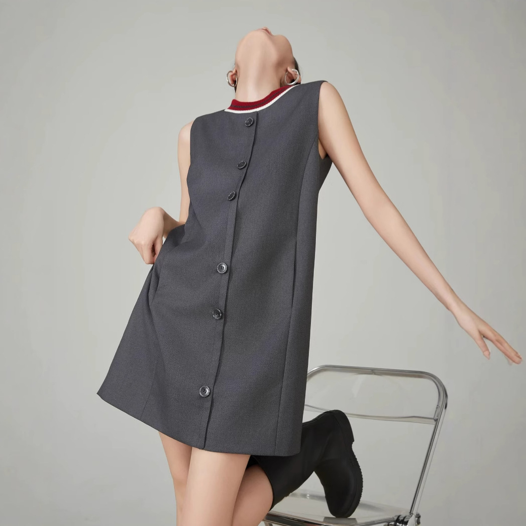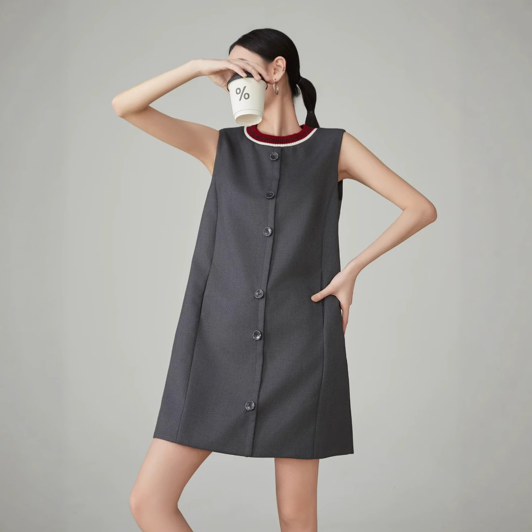 灰色撞色针织领无袖连衣裙中长款miu系直筒显瘦背心裙