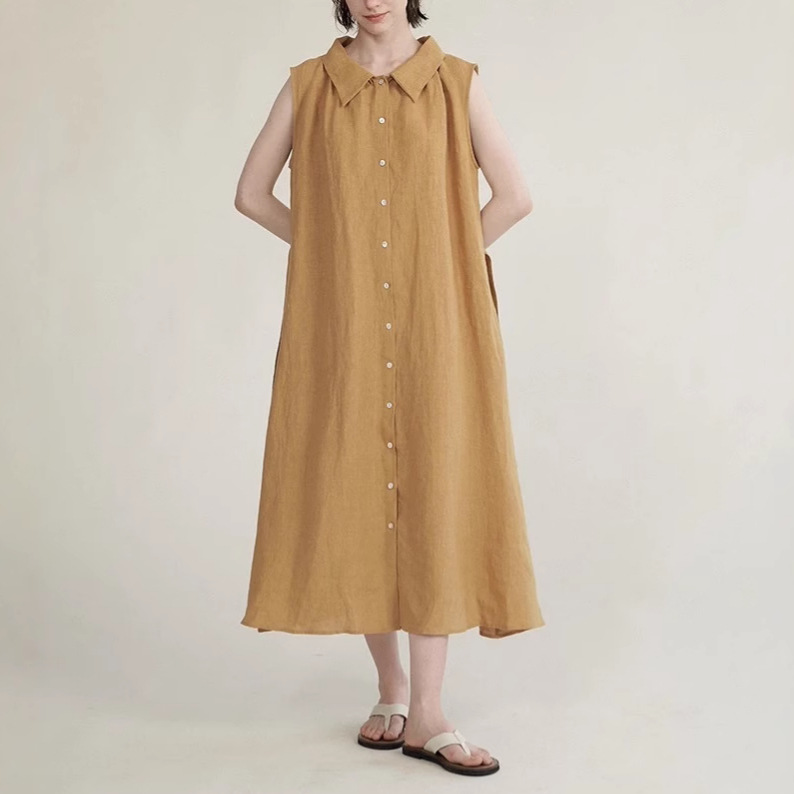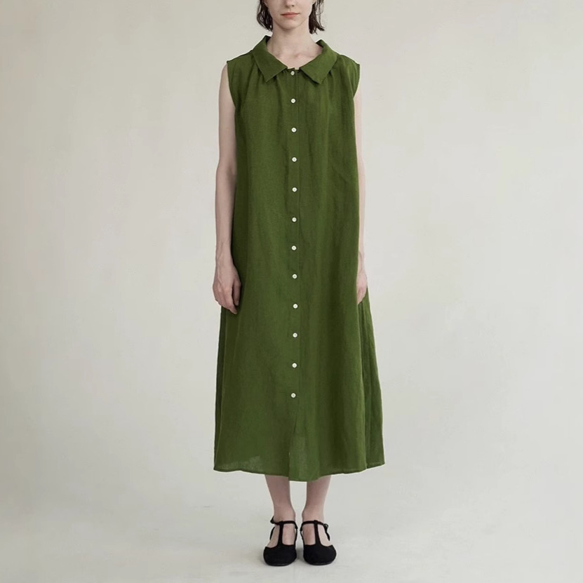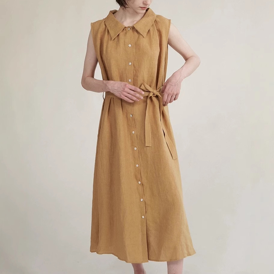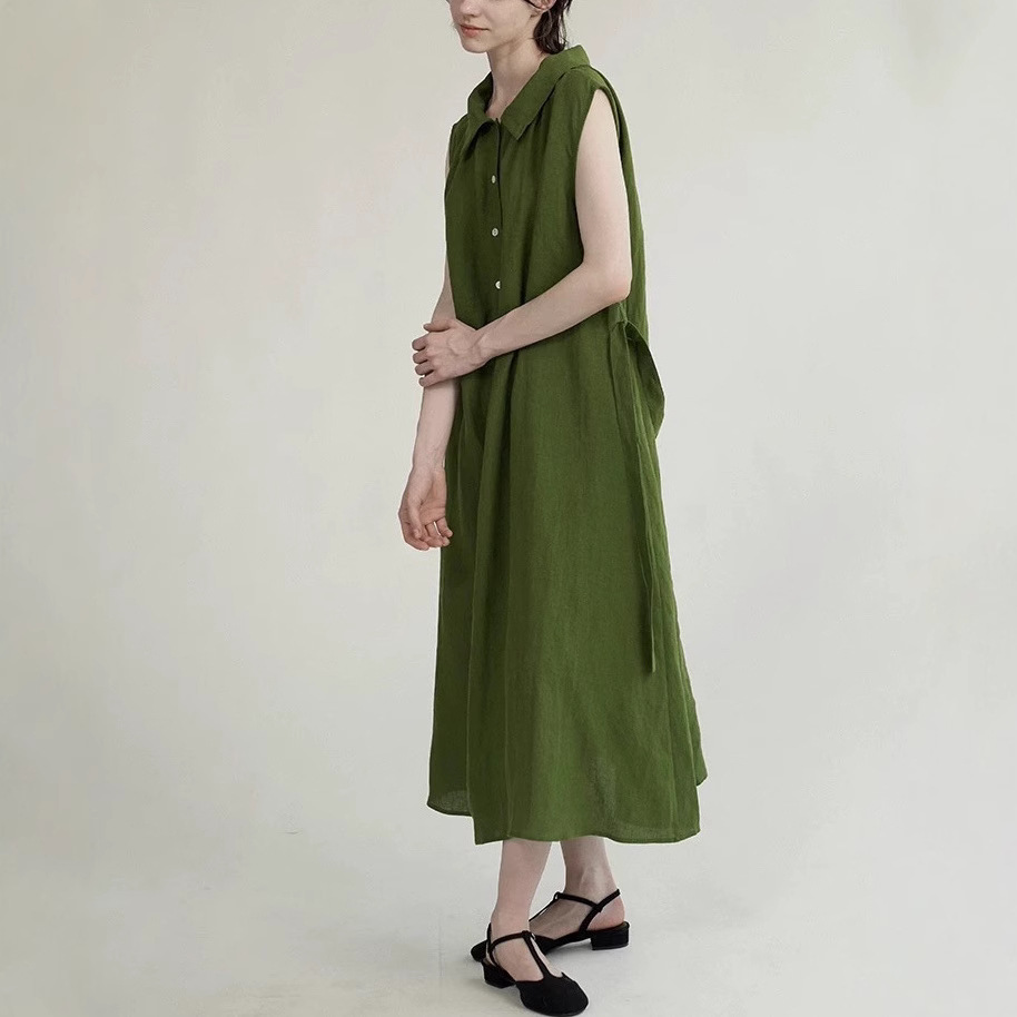两面穿领口抽褶腰带无袖连衣裙中长裙女