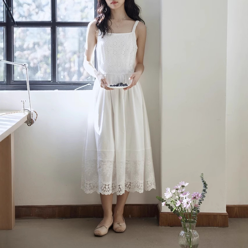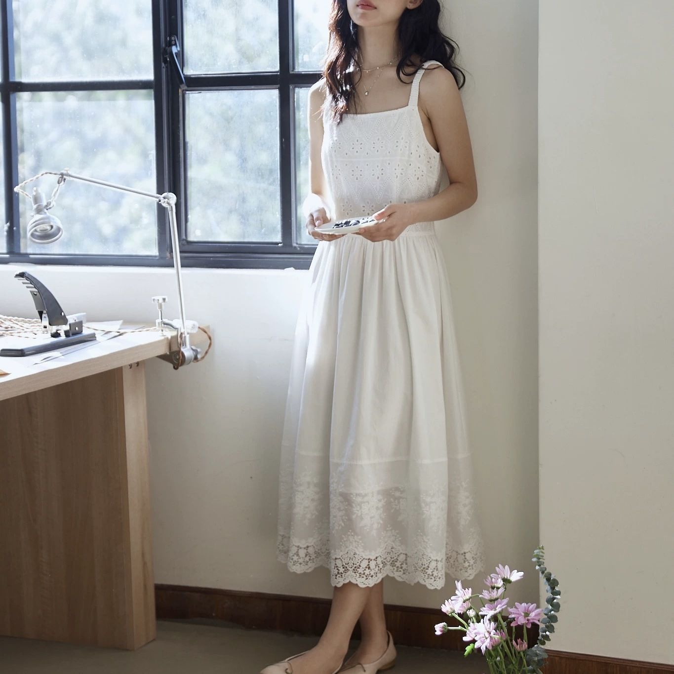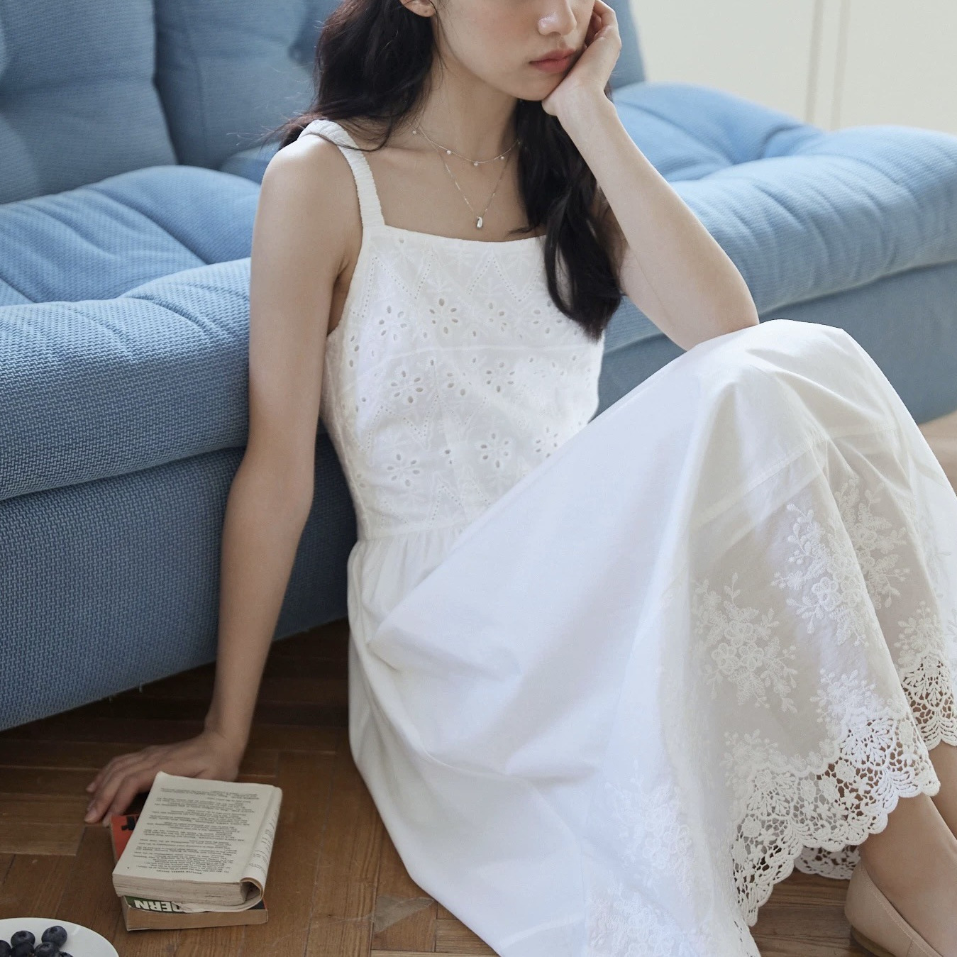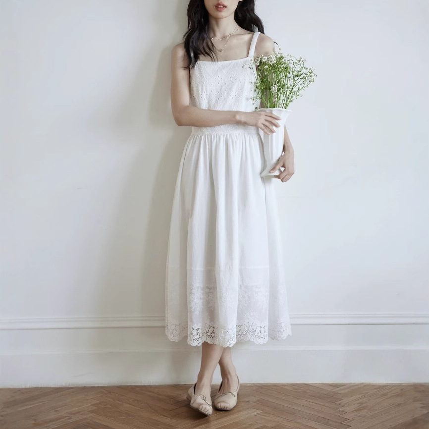 法式刺绣吊带连衣裙女春夏款收腰内搭a字长款白色裙子