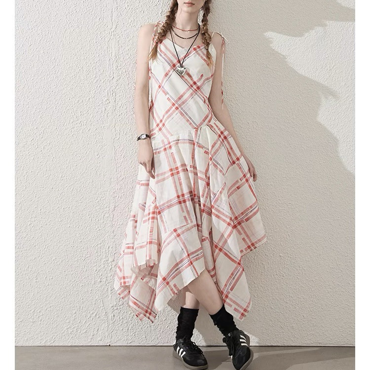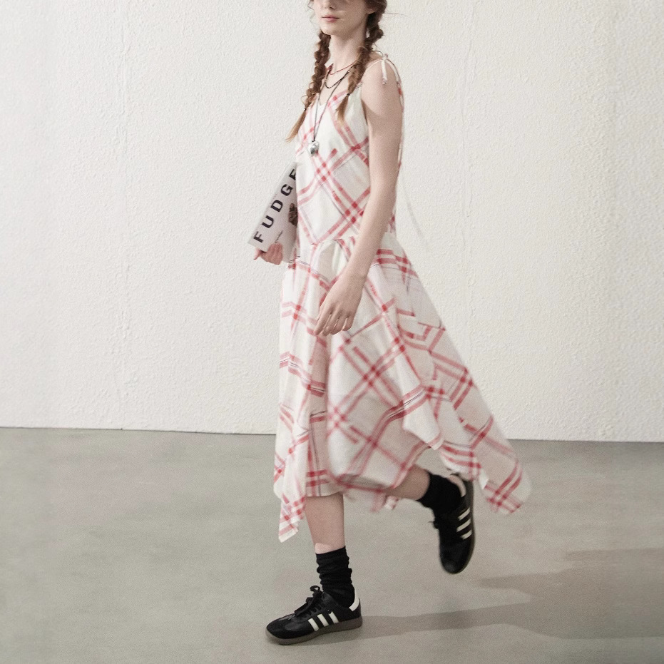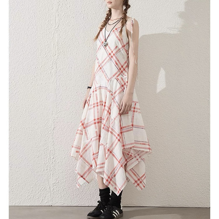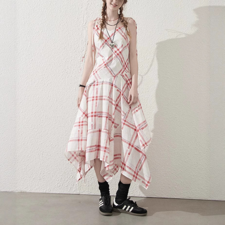 “美式艺术生'不规则裙摆格纹收腰吊带连衣裙夏