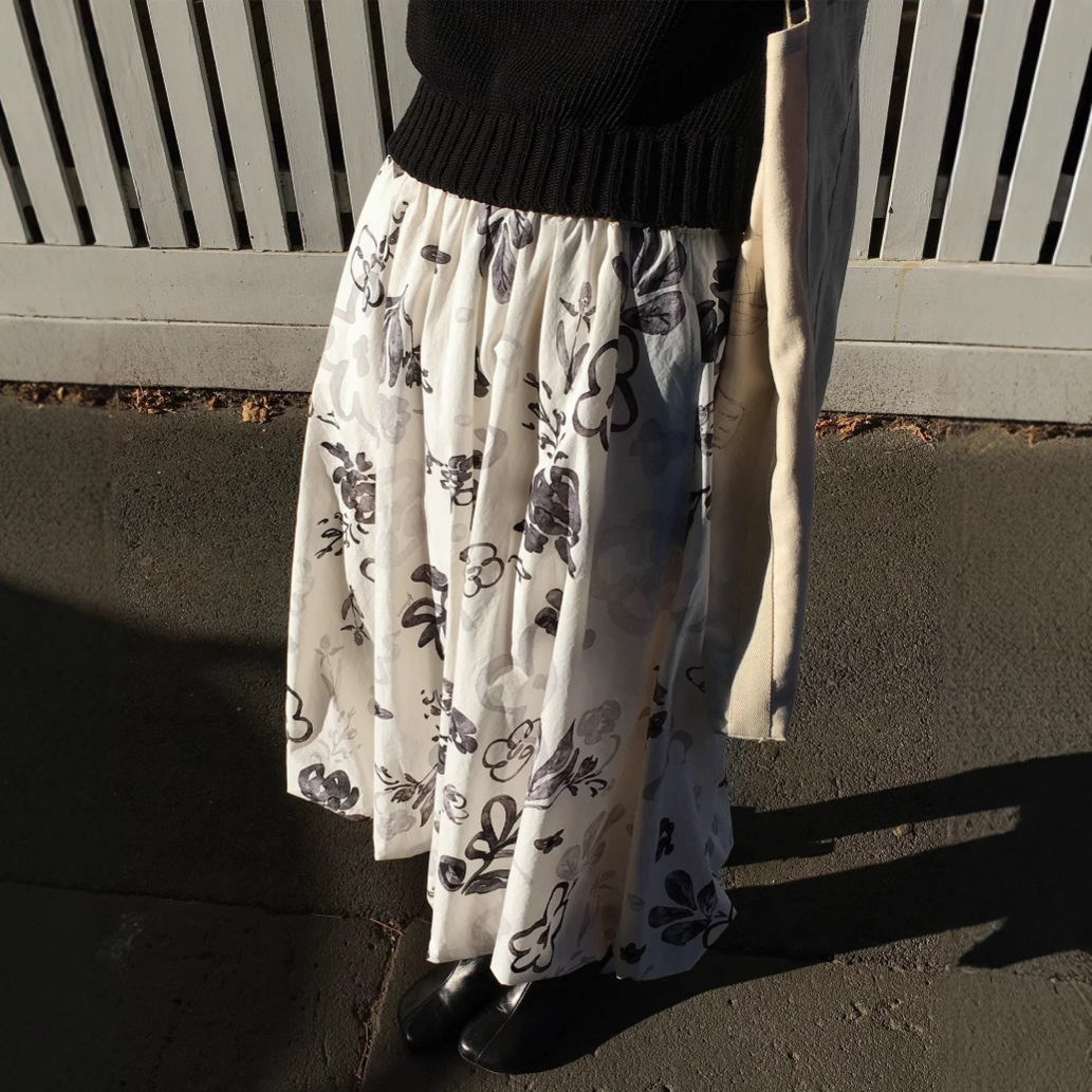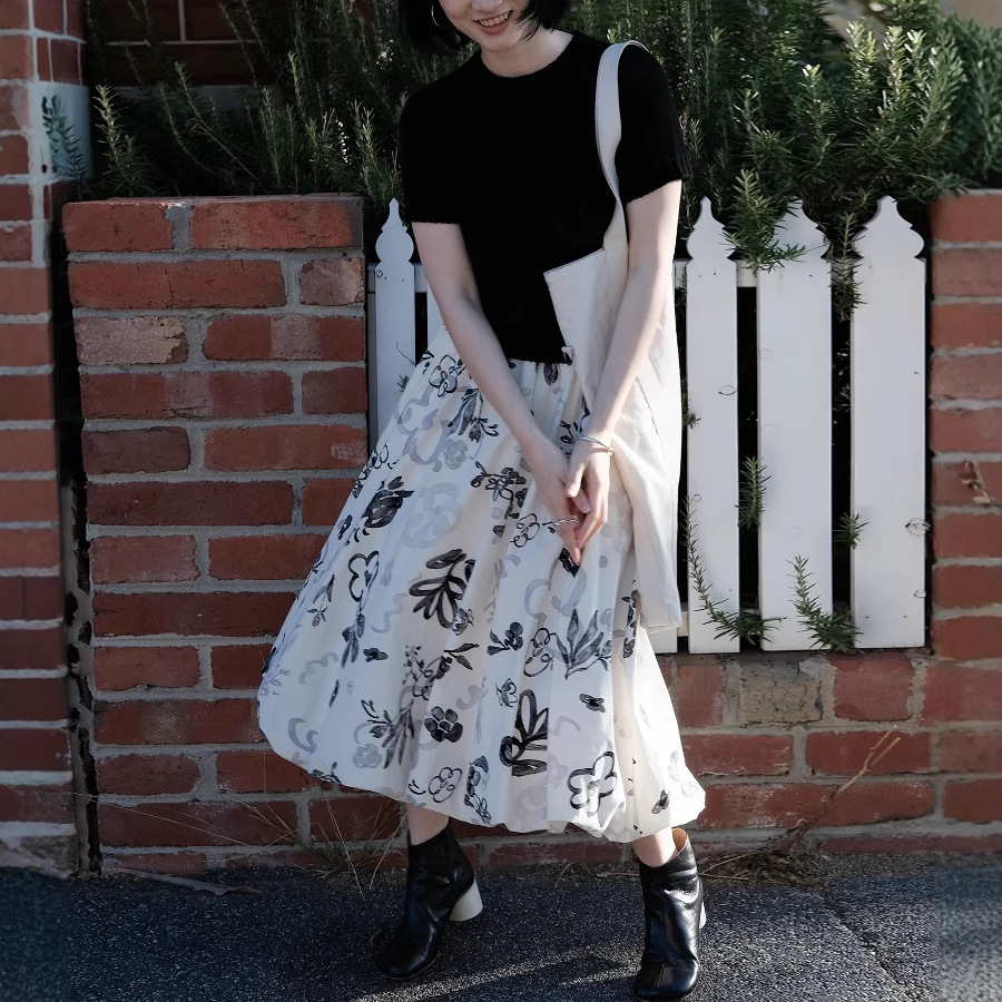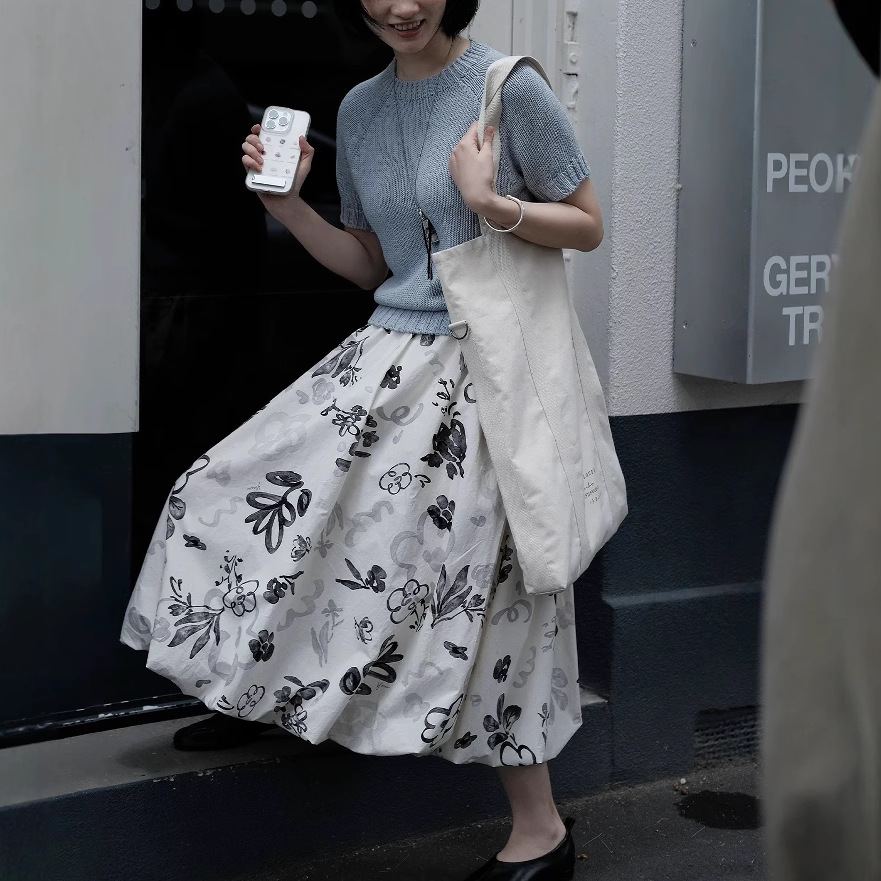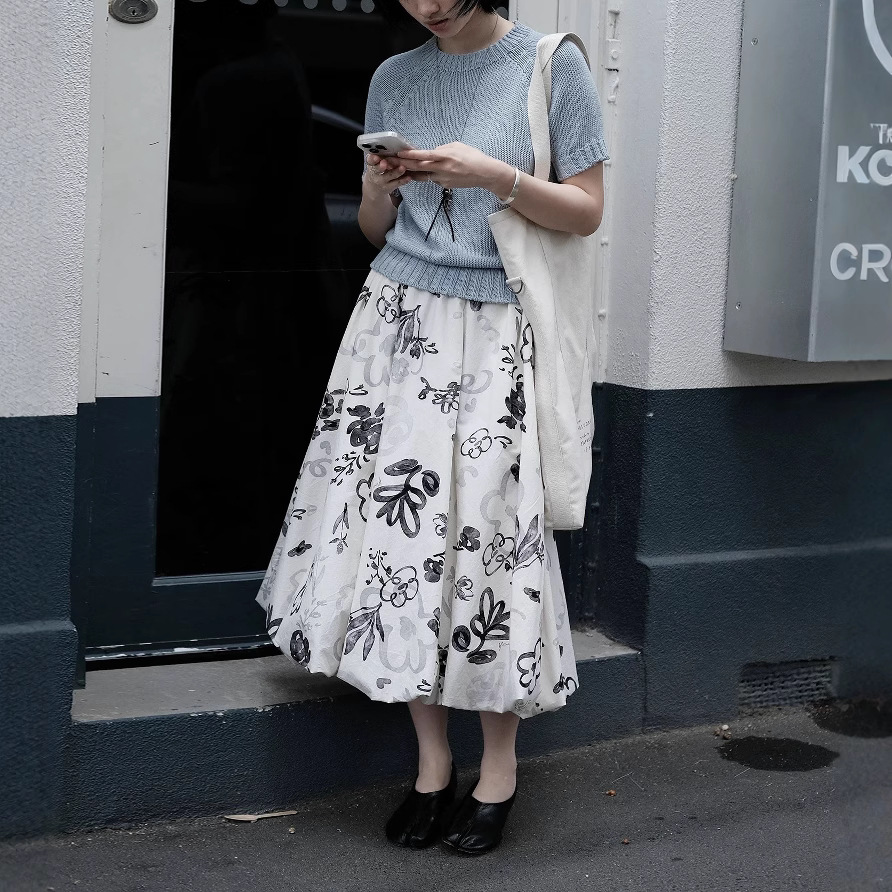 手绘水墨花卉晕染印花A字蓬蓬花苞半裙