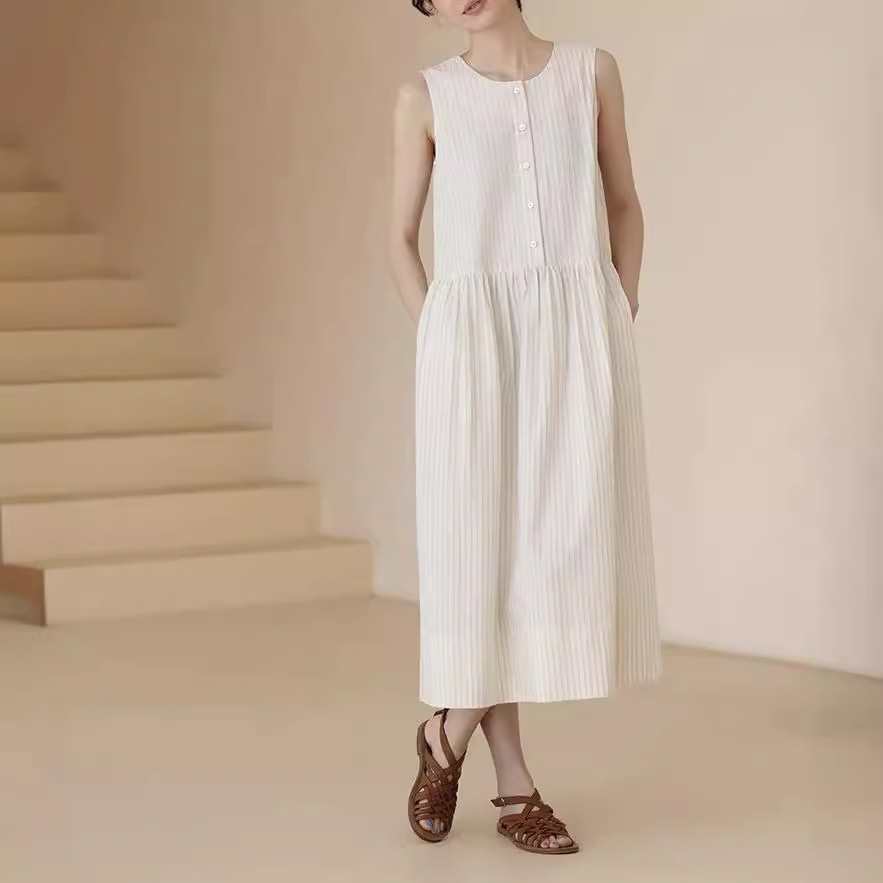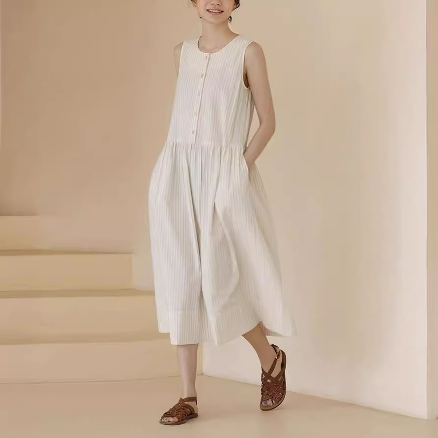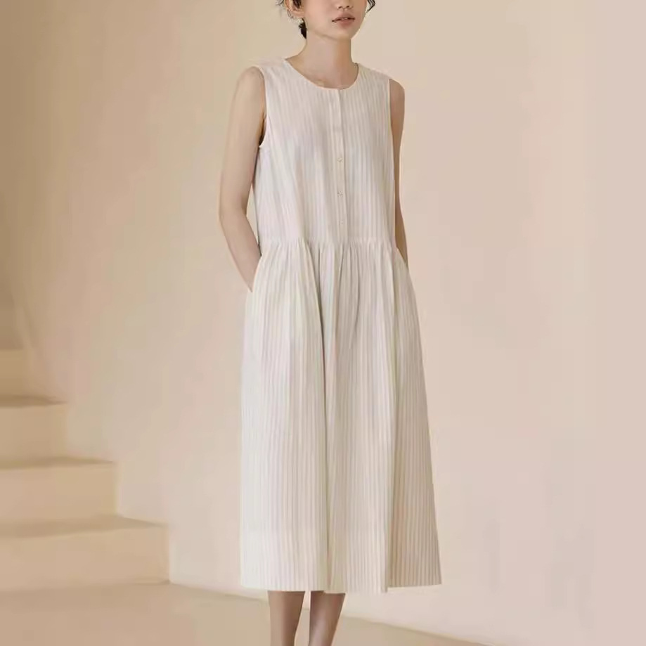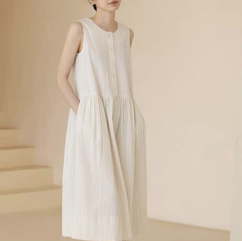 夏季新款清新藤条色织条纹盐缩工艺肌理宽松背心连衣裙