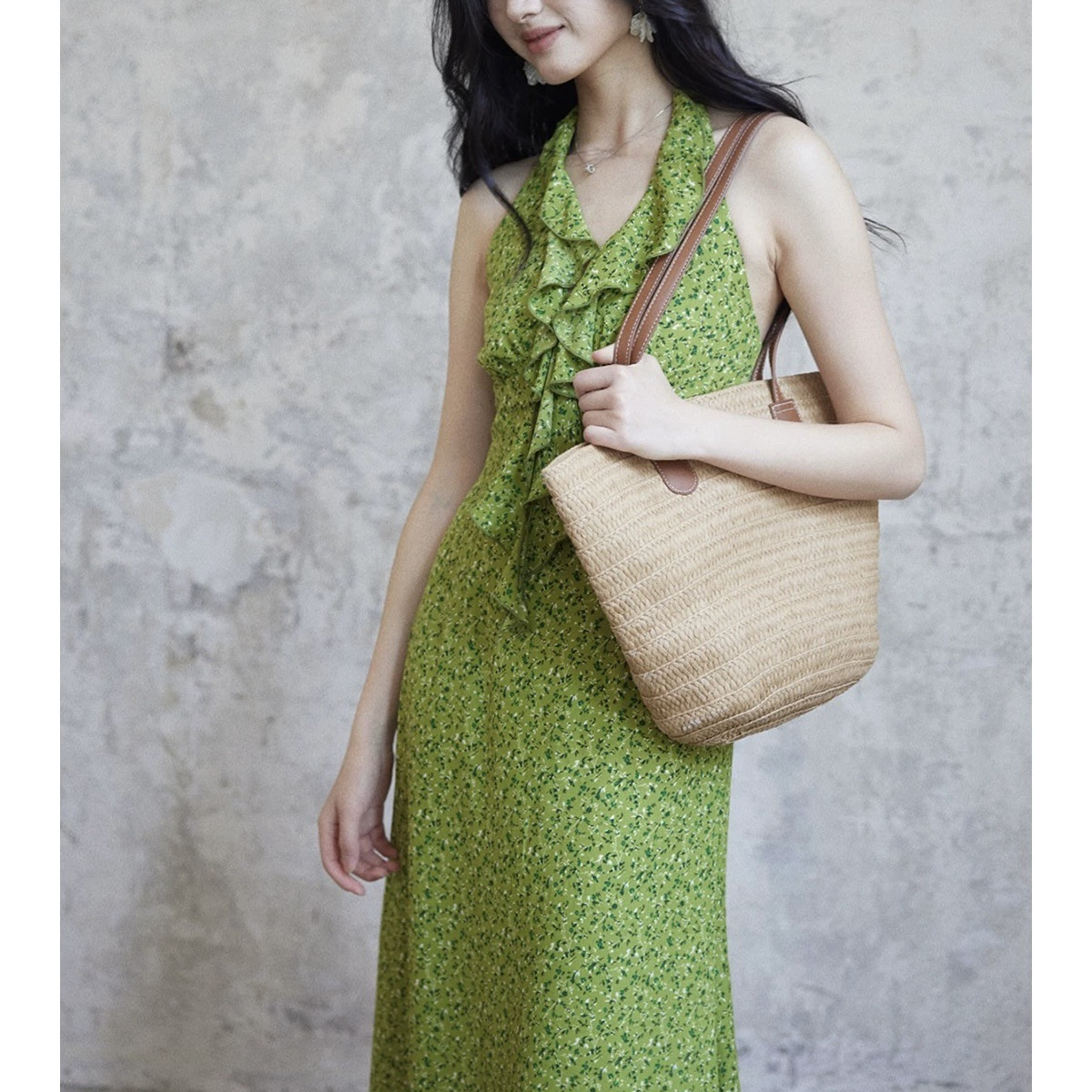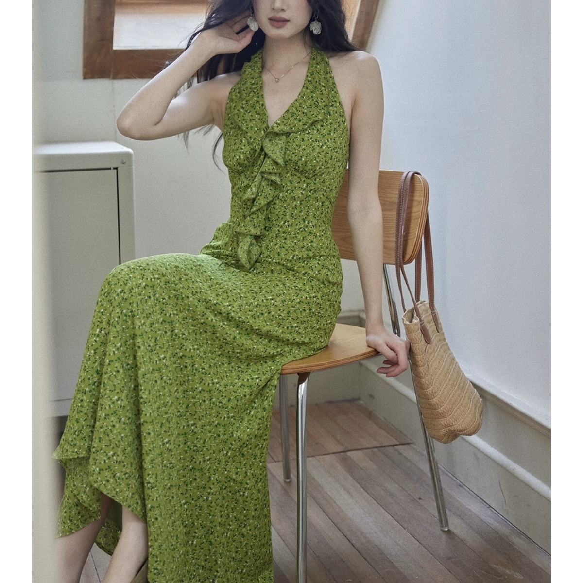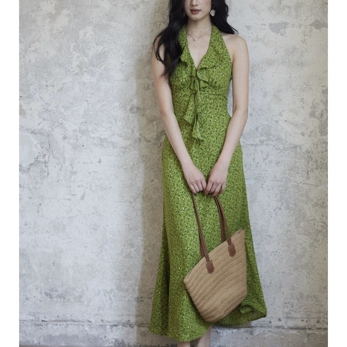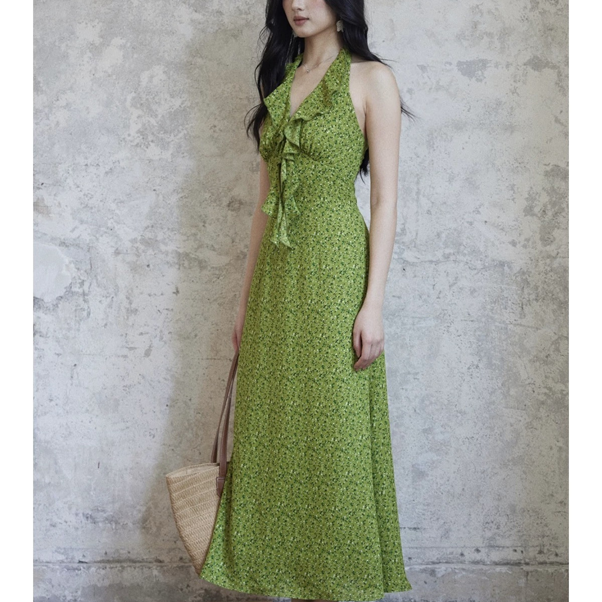 【春枝】法式度假绿色碎花挂脖连衣裙女v领无袖吊带长裙