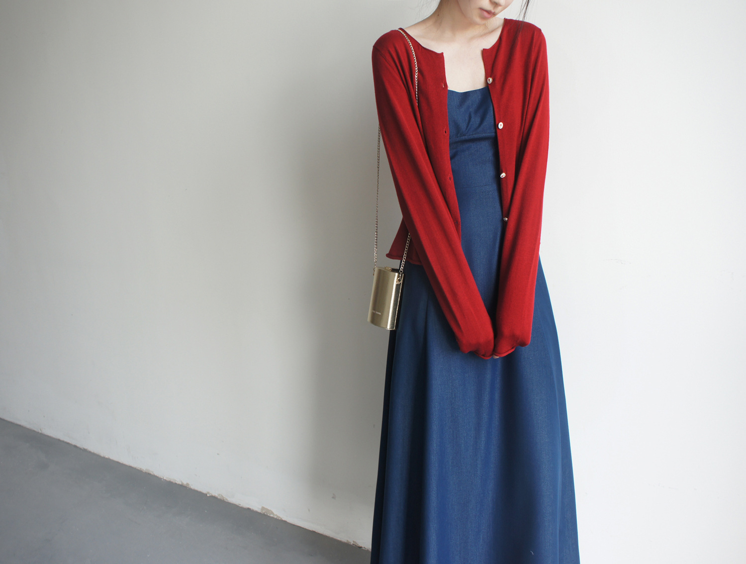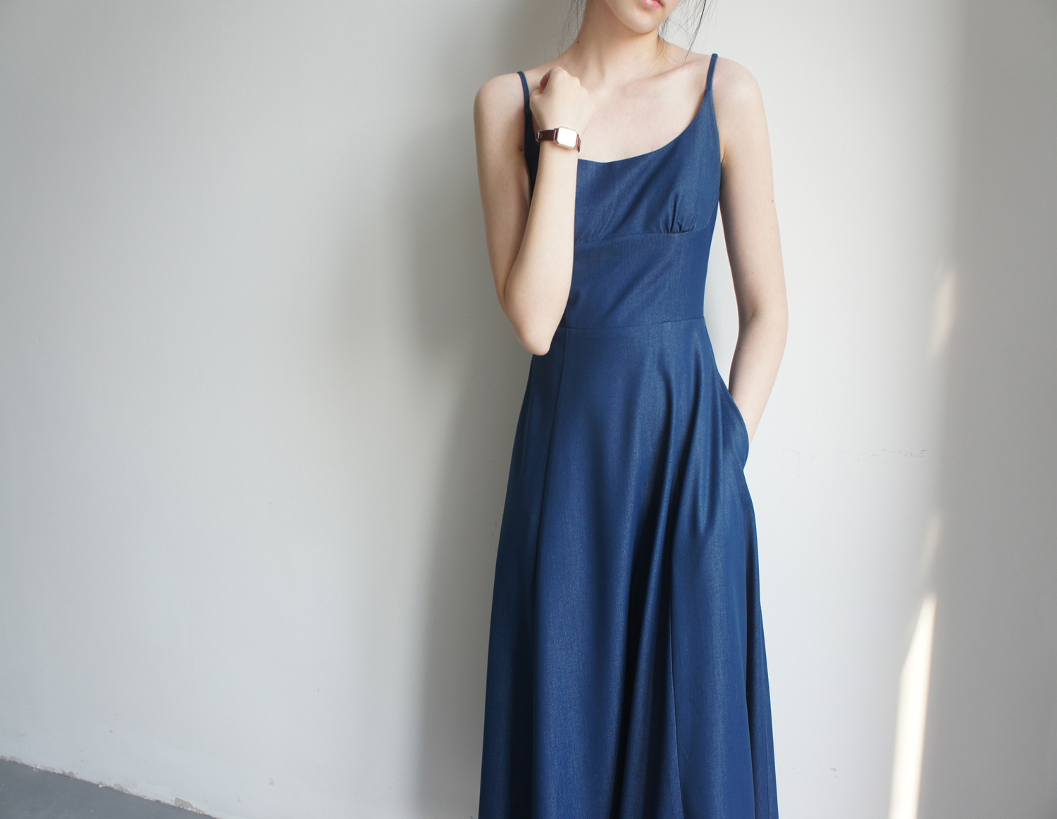 复古牛仔蓝天丝光泽质感高腰过膝A型吊带连衣裙 法式女23SS