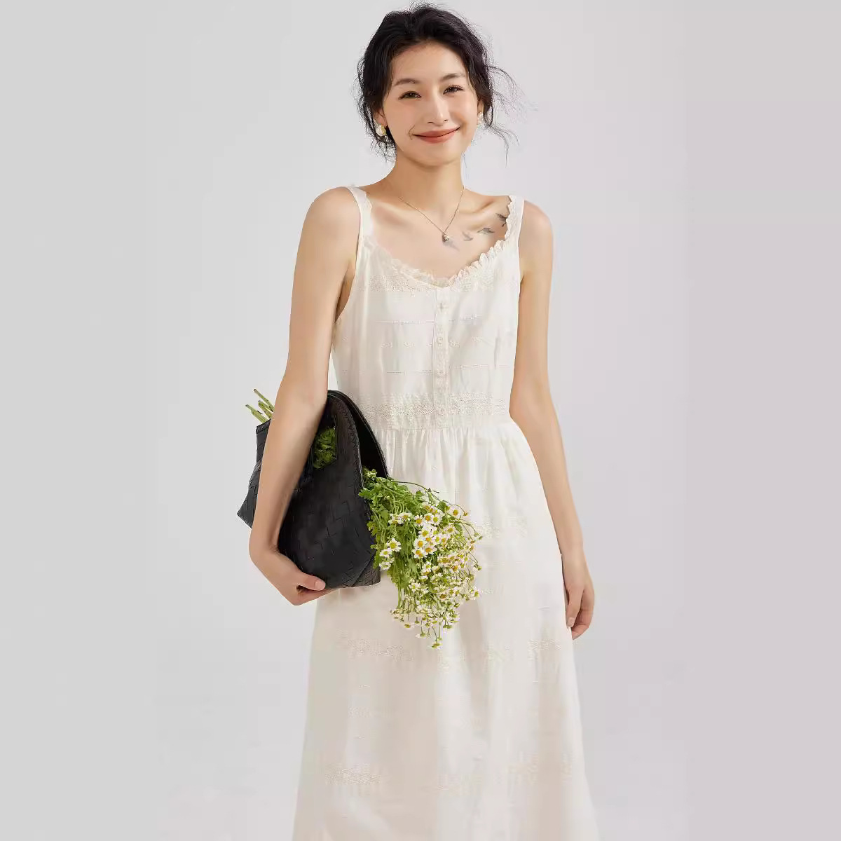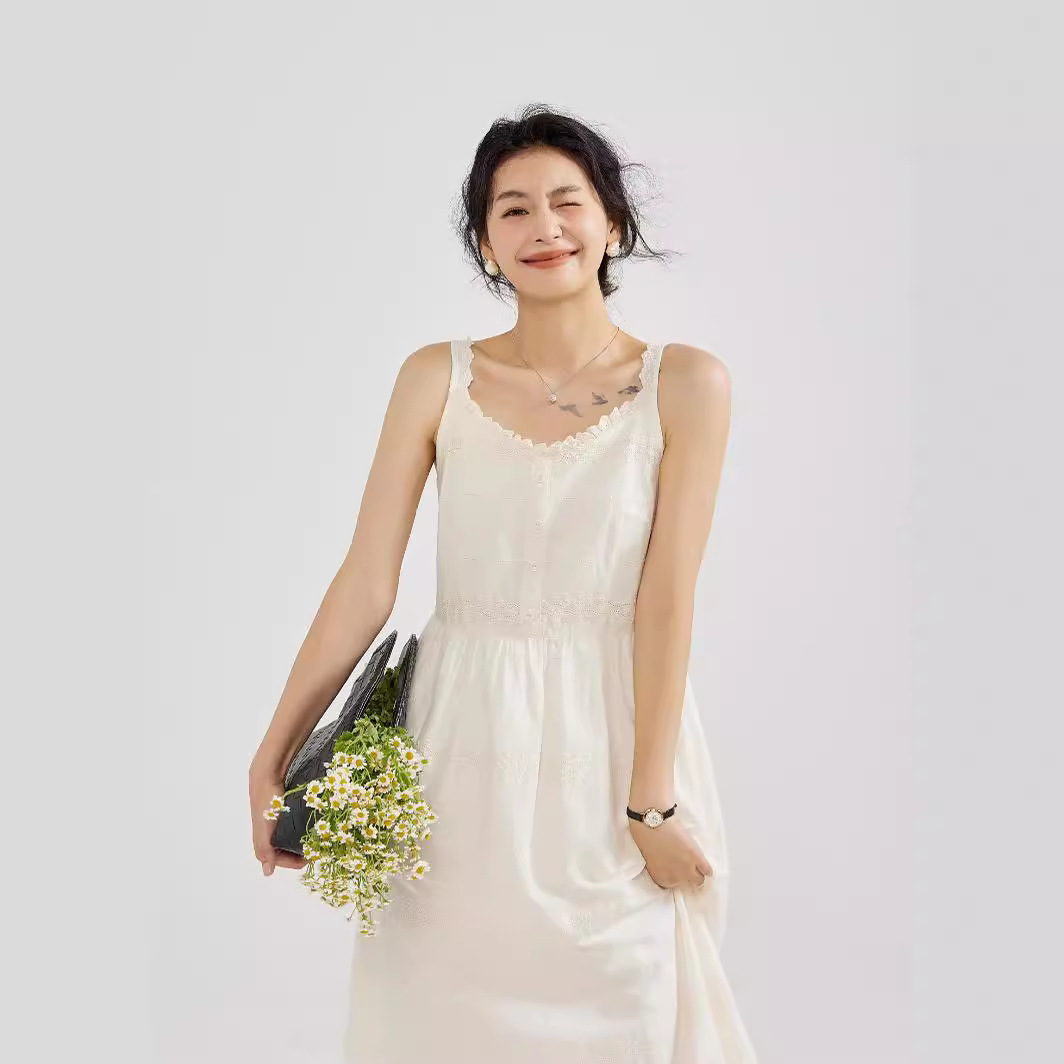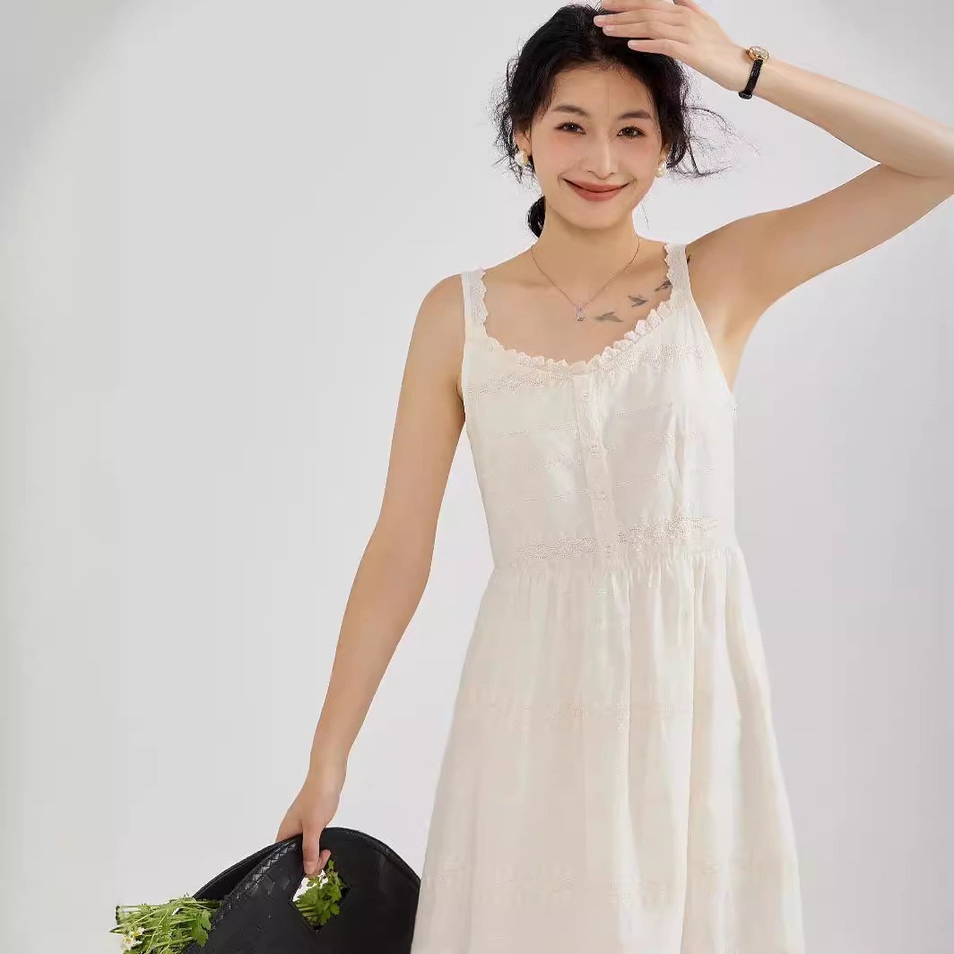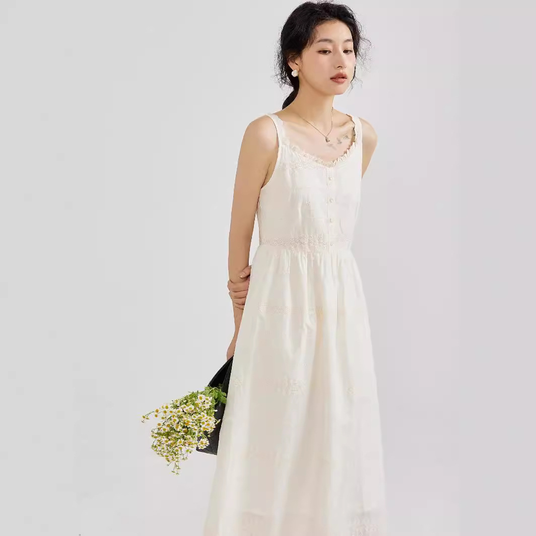 绣花甜美学院淑女文艺桔梗显瘦棉质花边肩带吊带裙