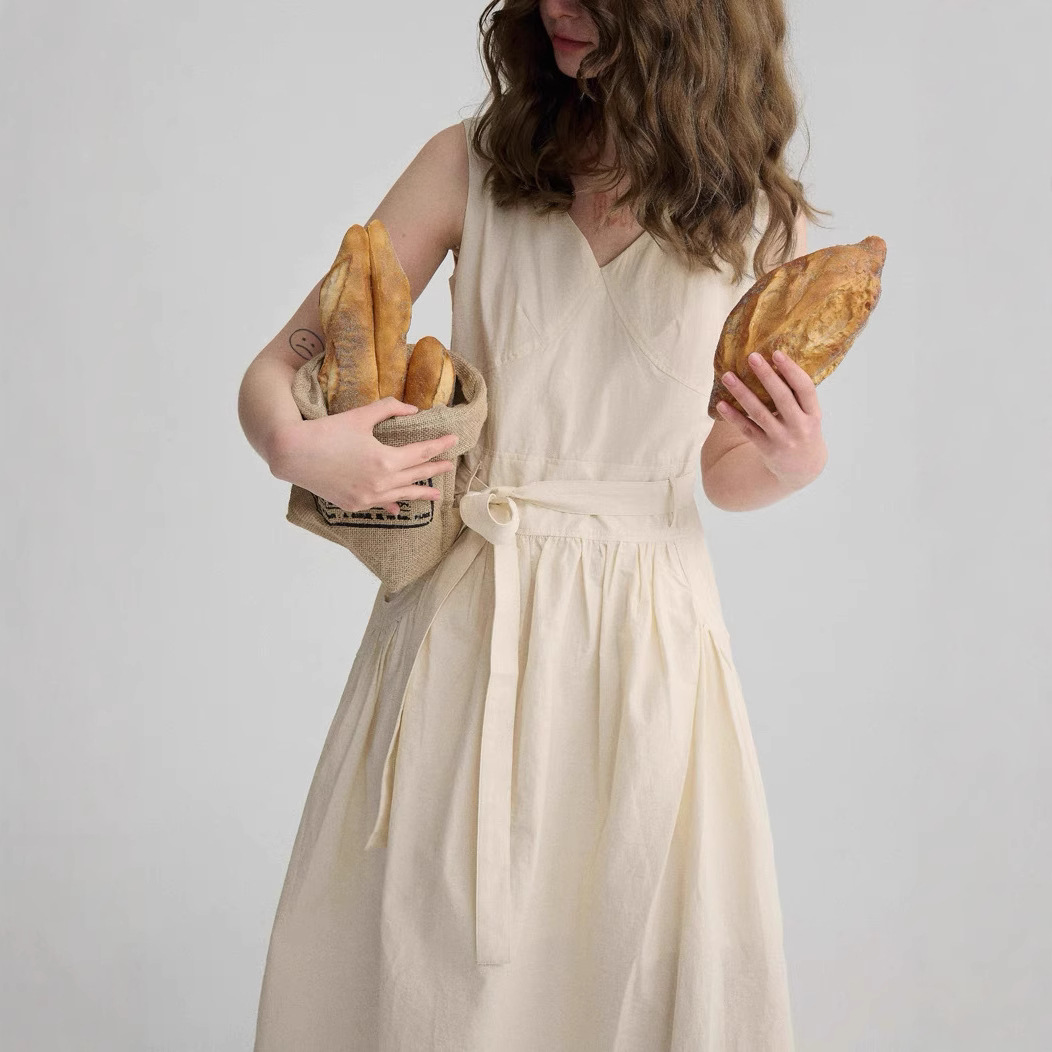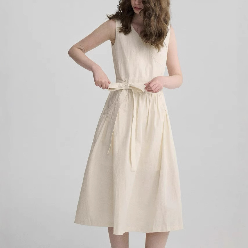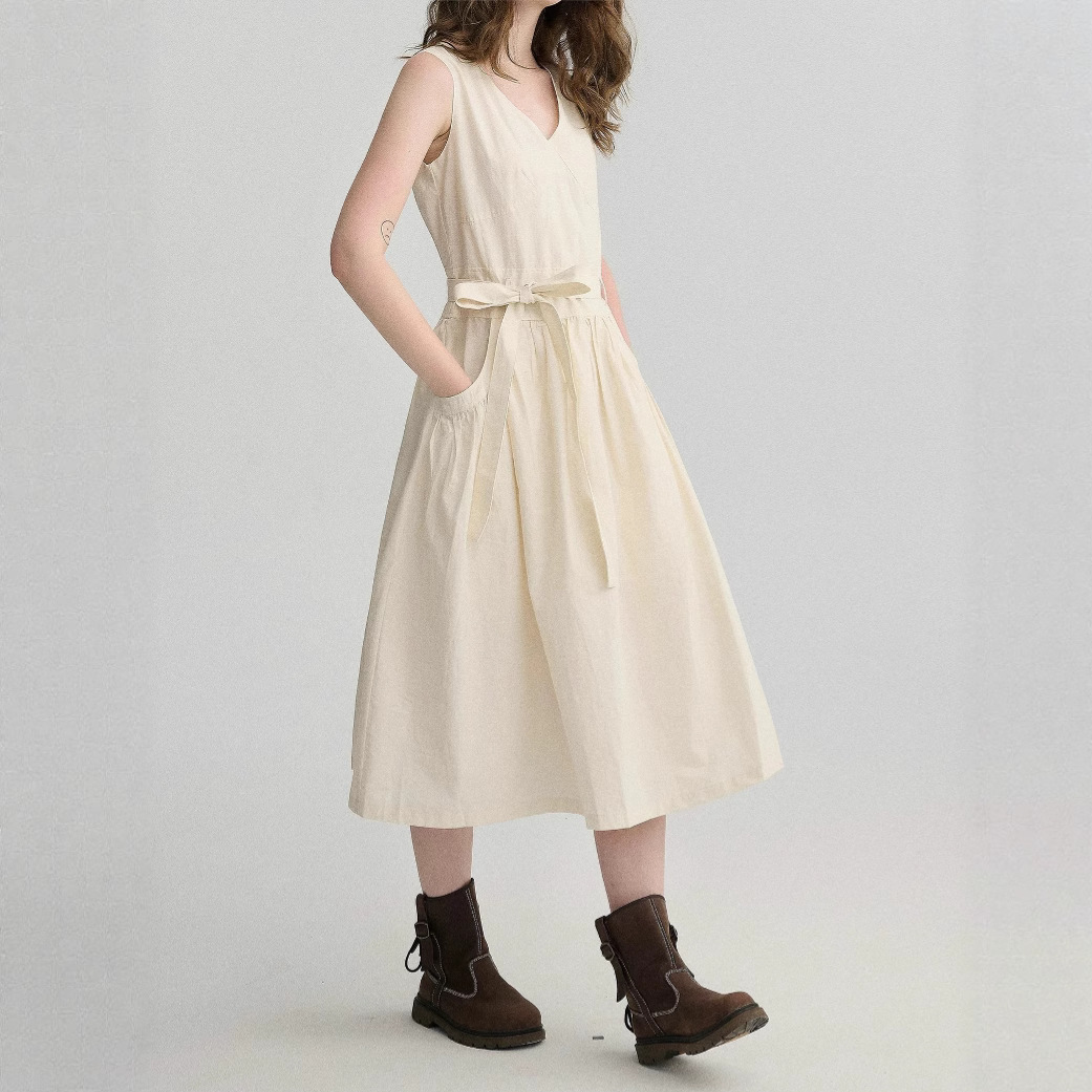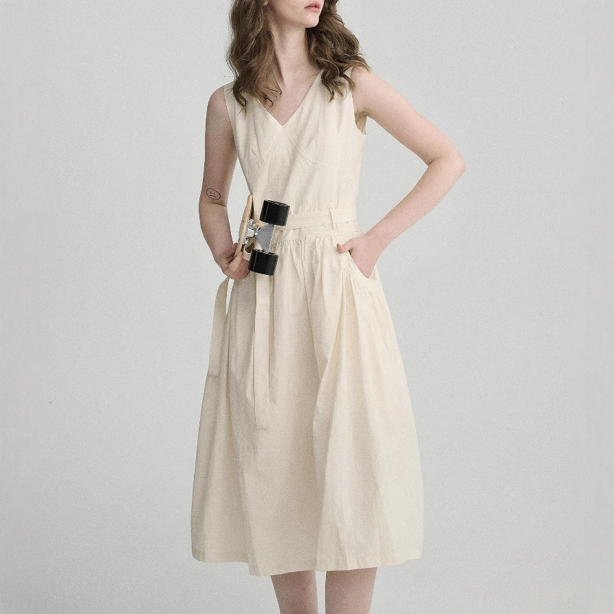 郊野时光' 法式设计感v领透气系带收腰口袋连衣裙