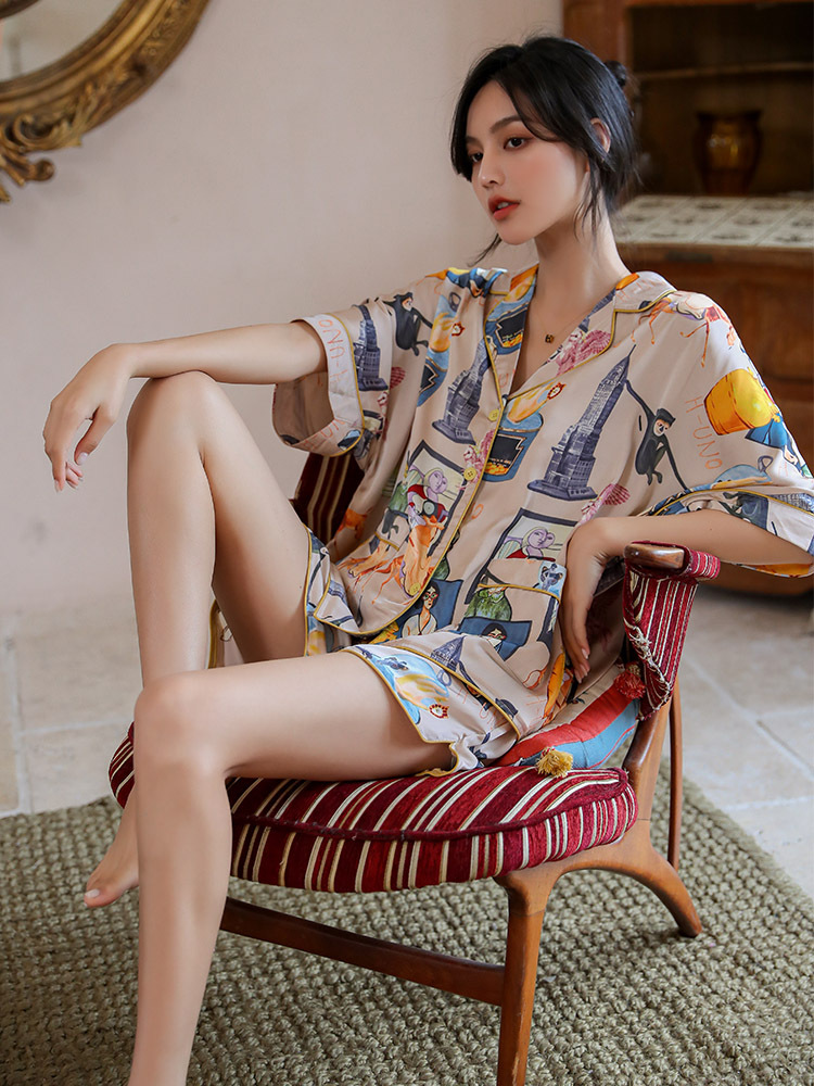 短袖冰丝睡衣女新款夏季薄款丝绸两件套个性印花家居服套装
