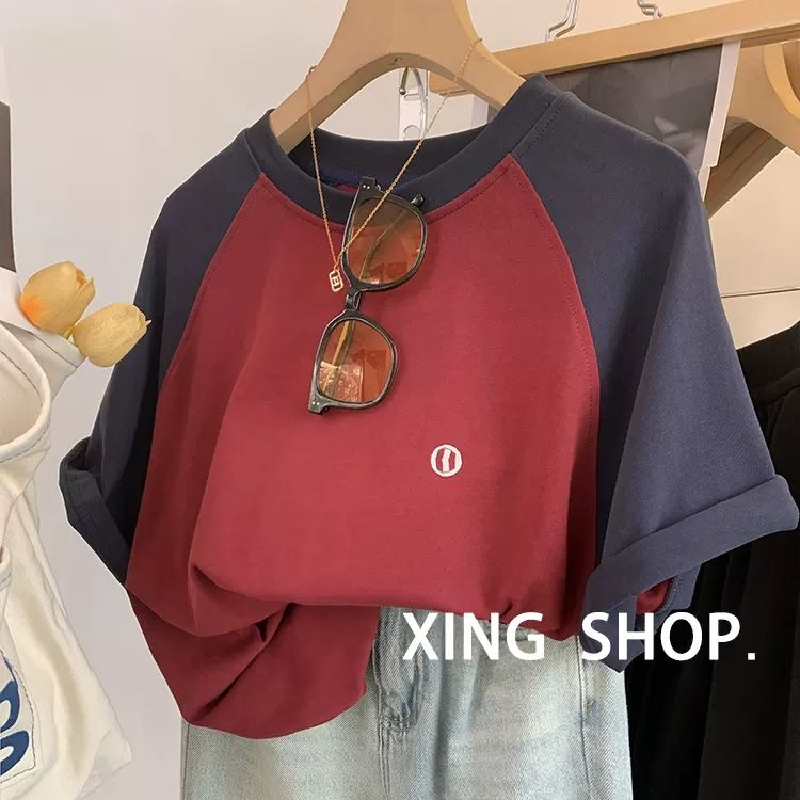 2025夏季新款蓝色设计感撞色短袖t恤女宽松百搭小众爆款减龄上衣