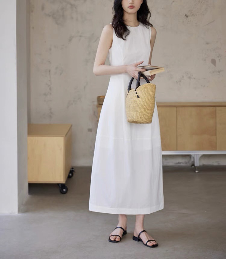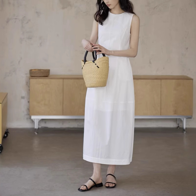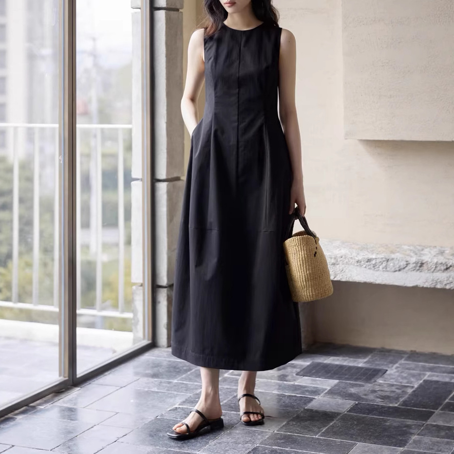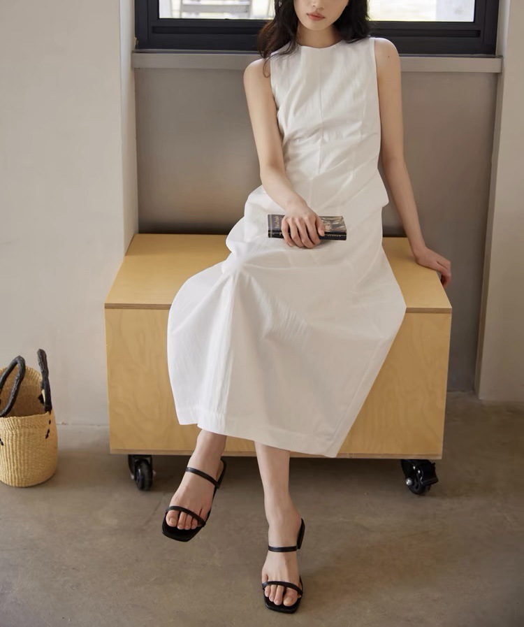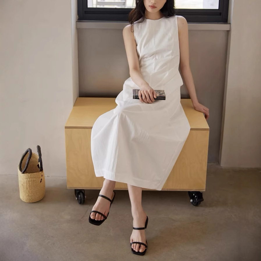 法式无袖白色连衣裙女夏拼接收腰黑色领证背心裙花苞长裙