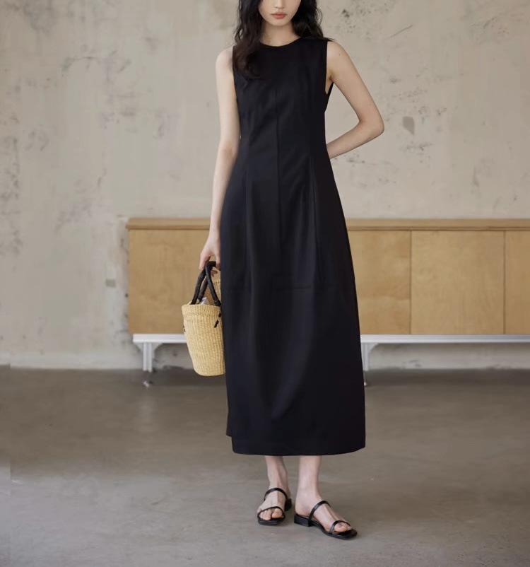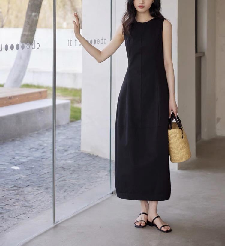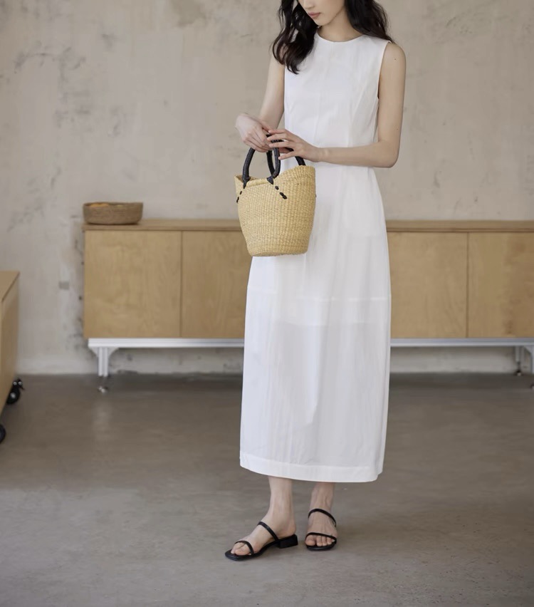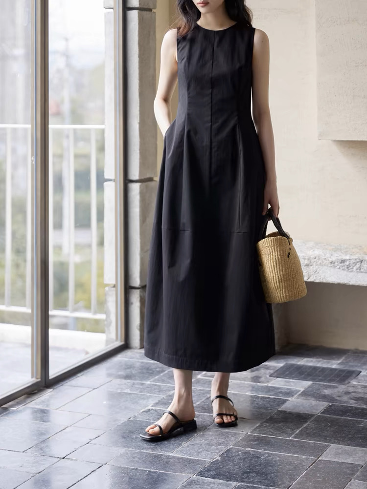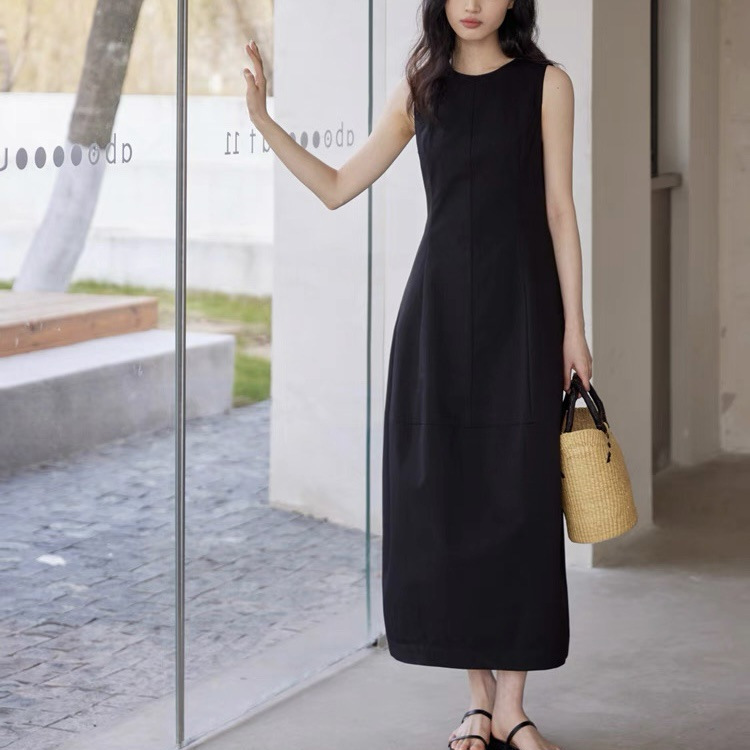 法式无袖白色连衣裙女夏拼接收腰黑色领证背心裙花苞长裙