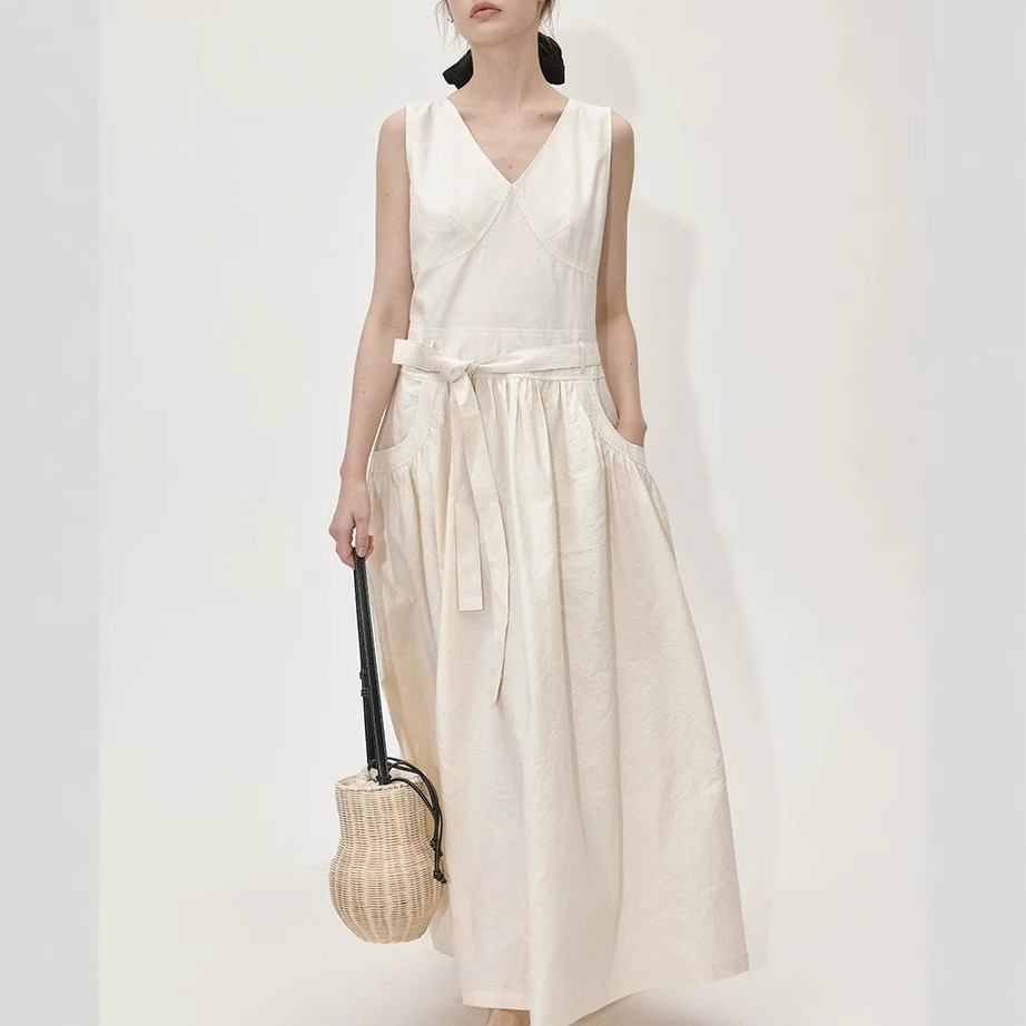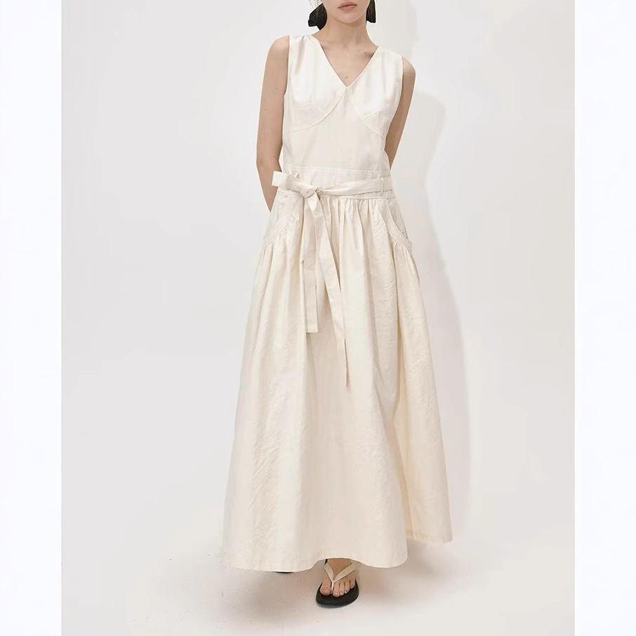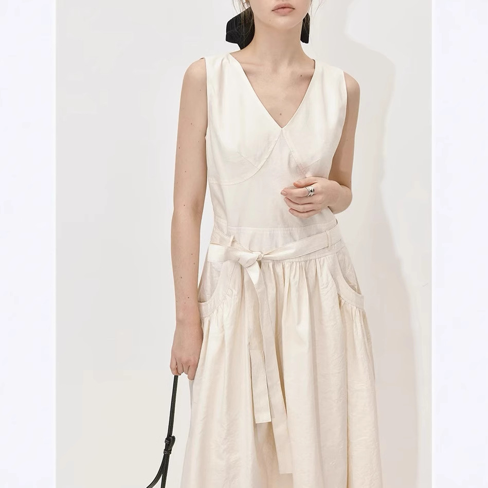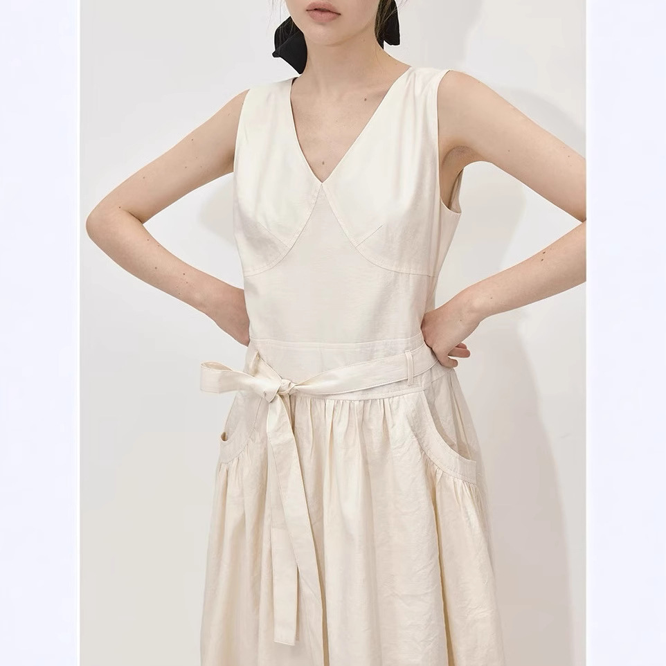 2025夏季新款法式V领无袖背心连衣裙女气质显瘦系带收腰A字裙