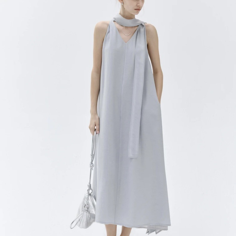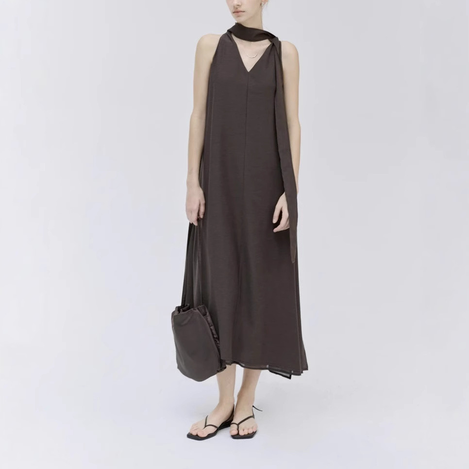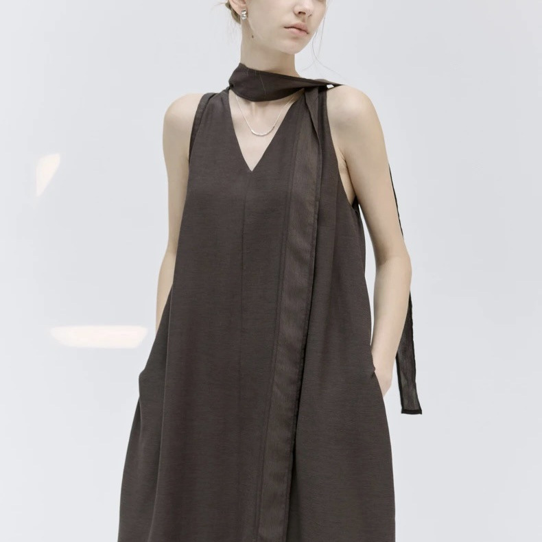 吊带露肩连衣裙V领宽松垂感飘带A字无袖长裙