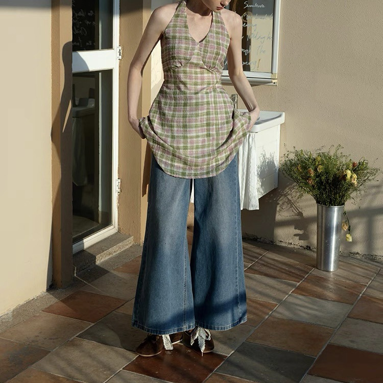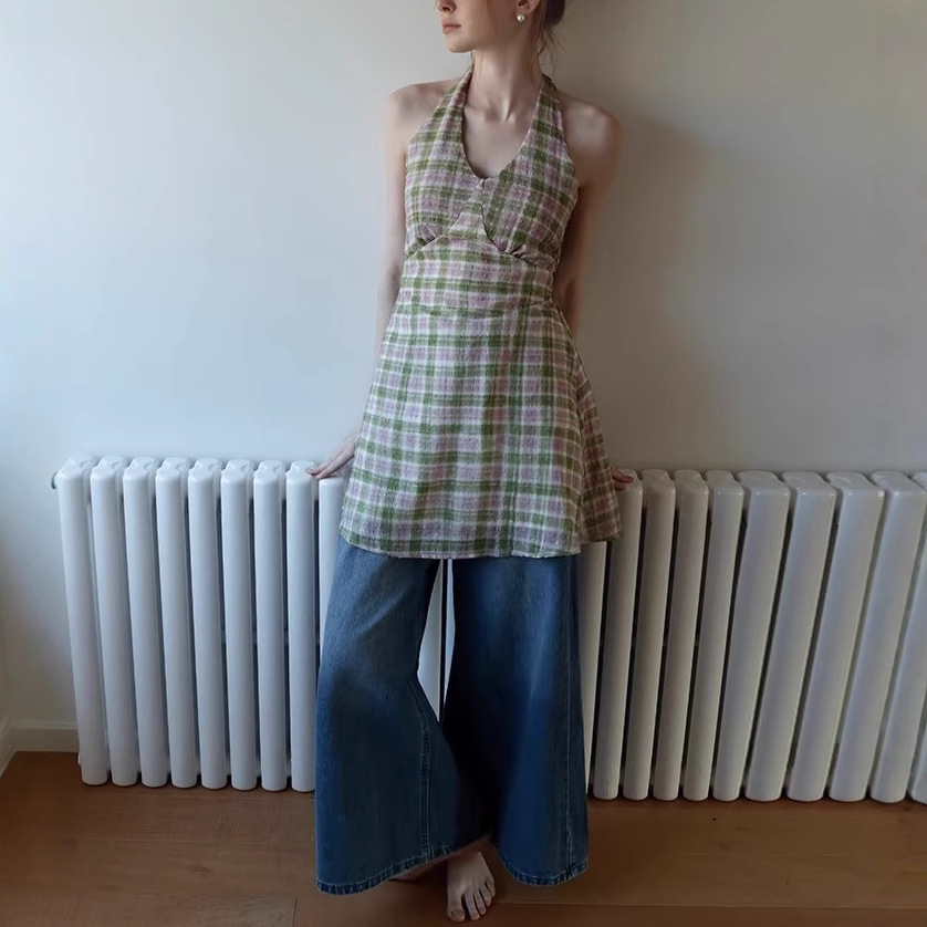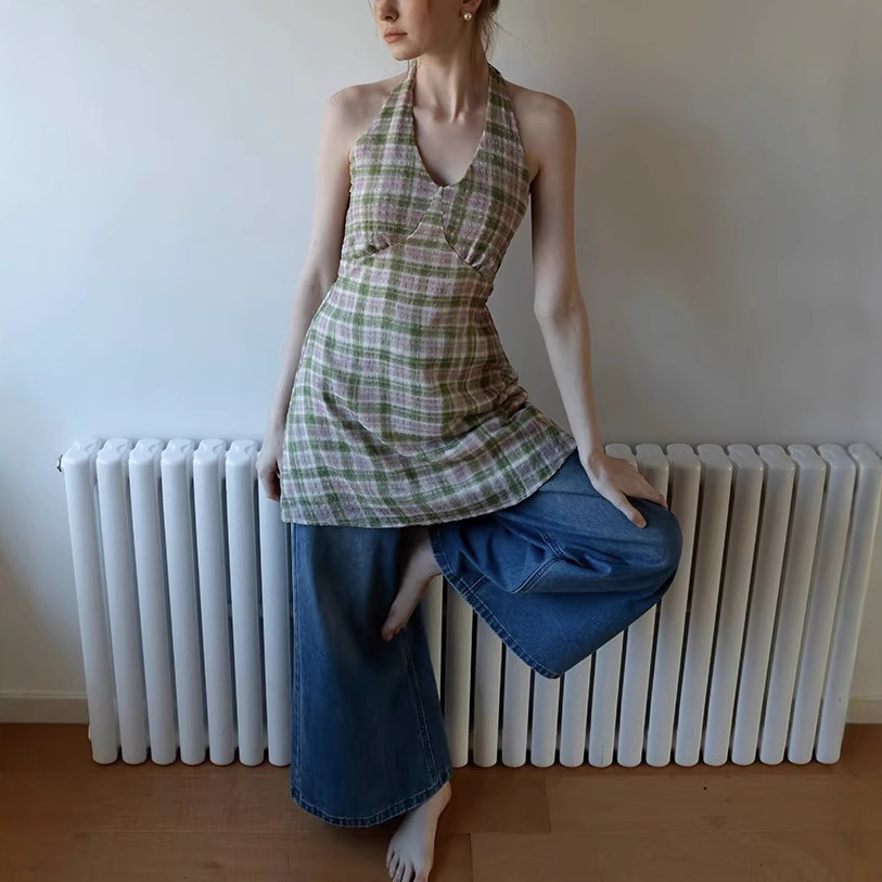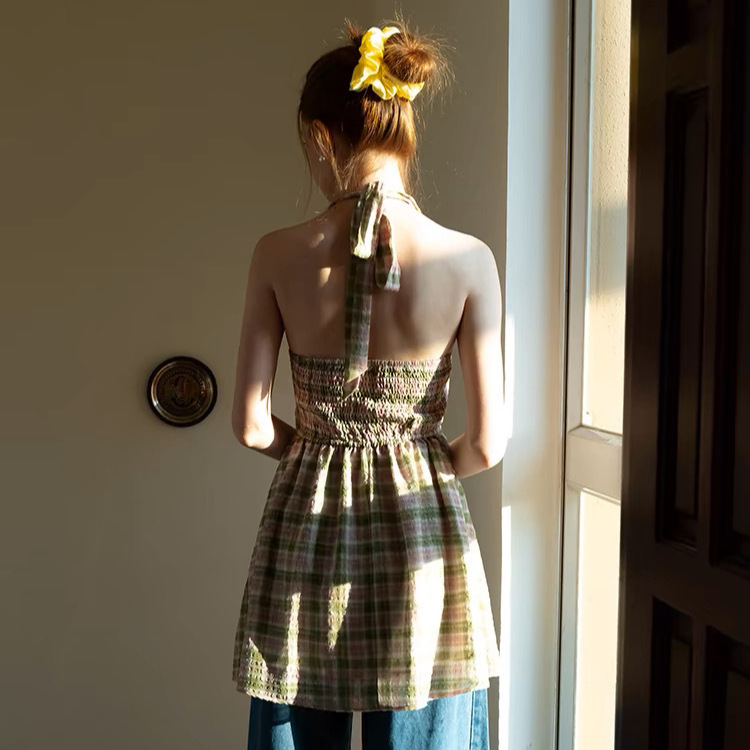 绿格纹V领挂脖系带露背连衣裙女春新款气质显瘦穿搭性感裙子