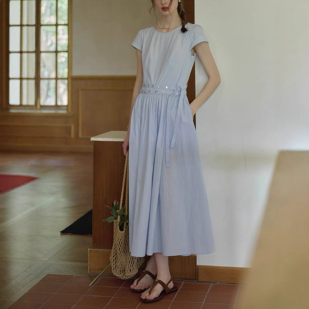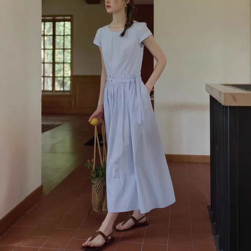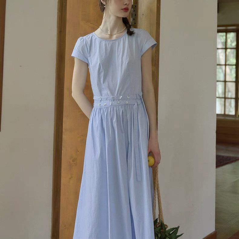 通勤蓝色腰部裙简约短袖连衣裙女夏日感a字裙