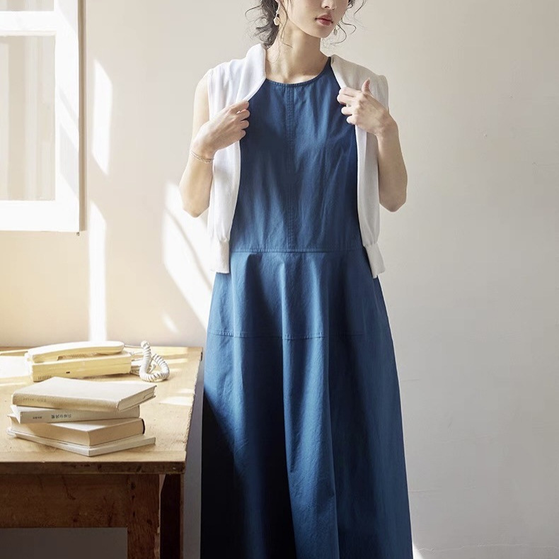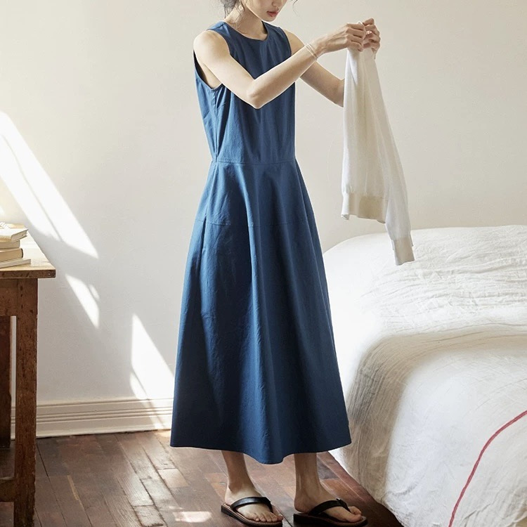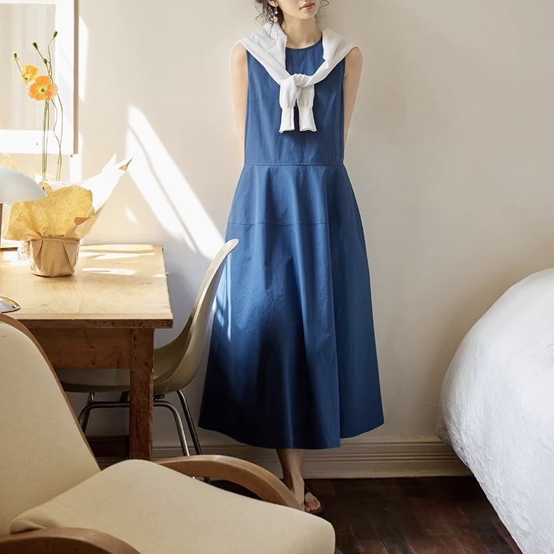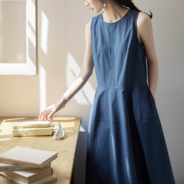 夏季蓝色优雅复古赫本风连衣裙简约圆领显瘦中长款裙子
