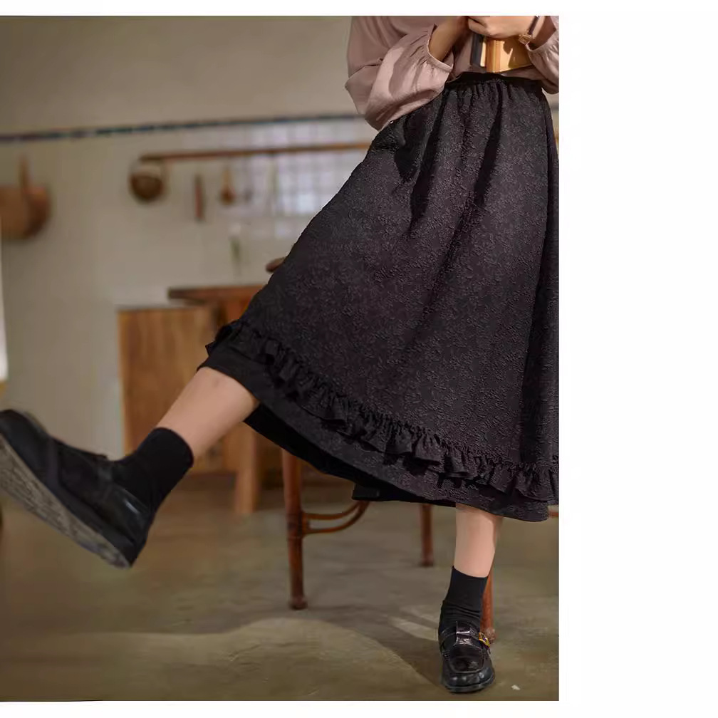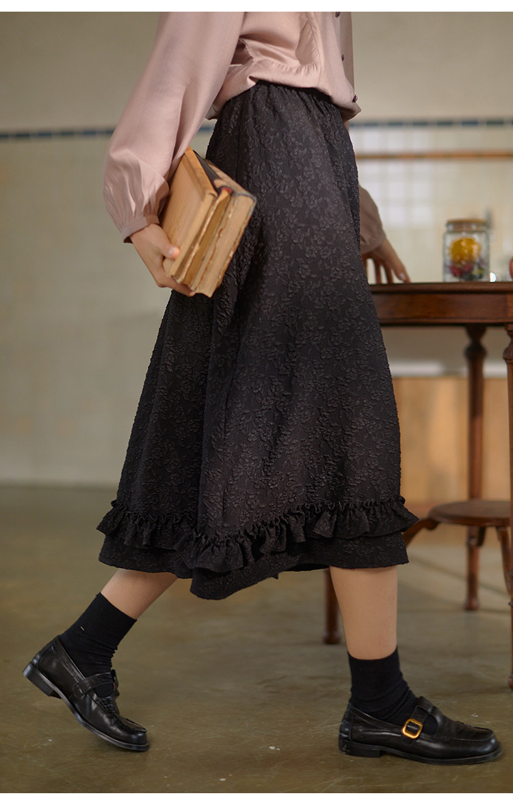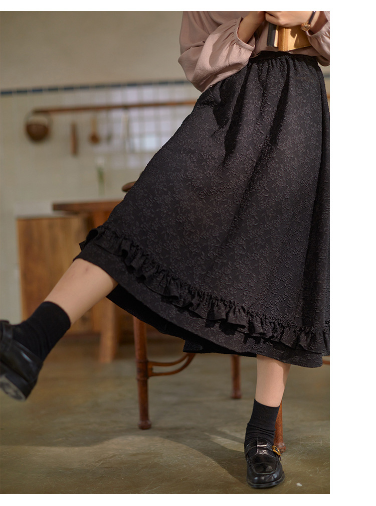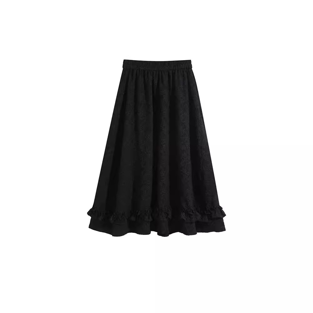 春夏百搭简约肌理花纹宽松型荷叶边纯色半身裙