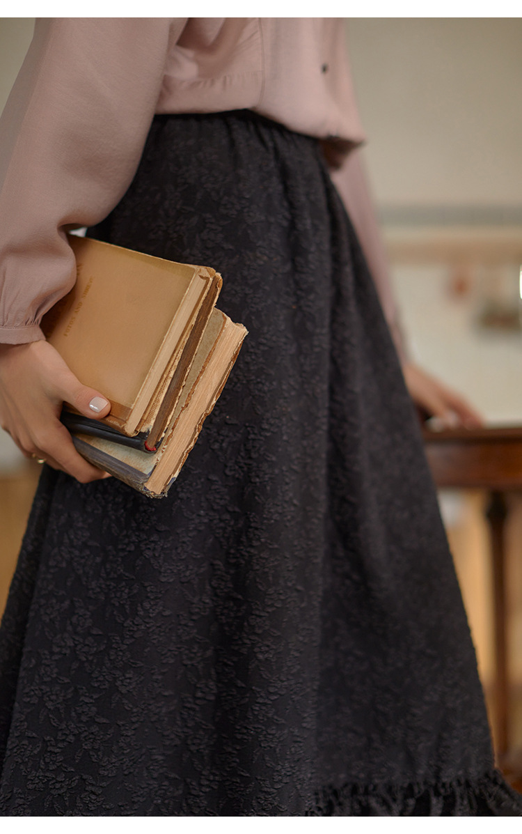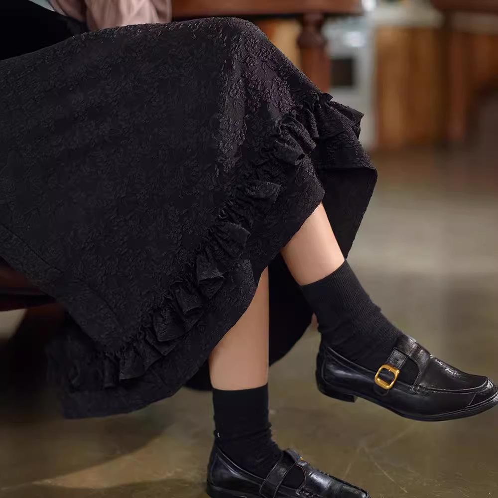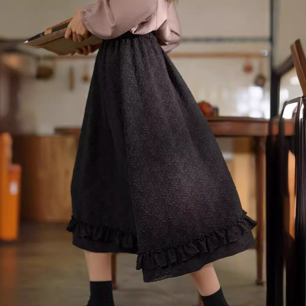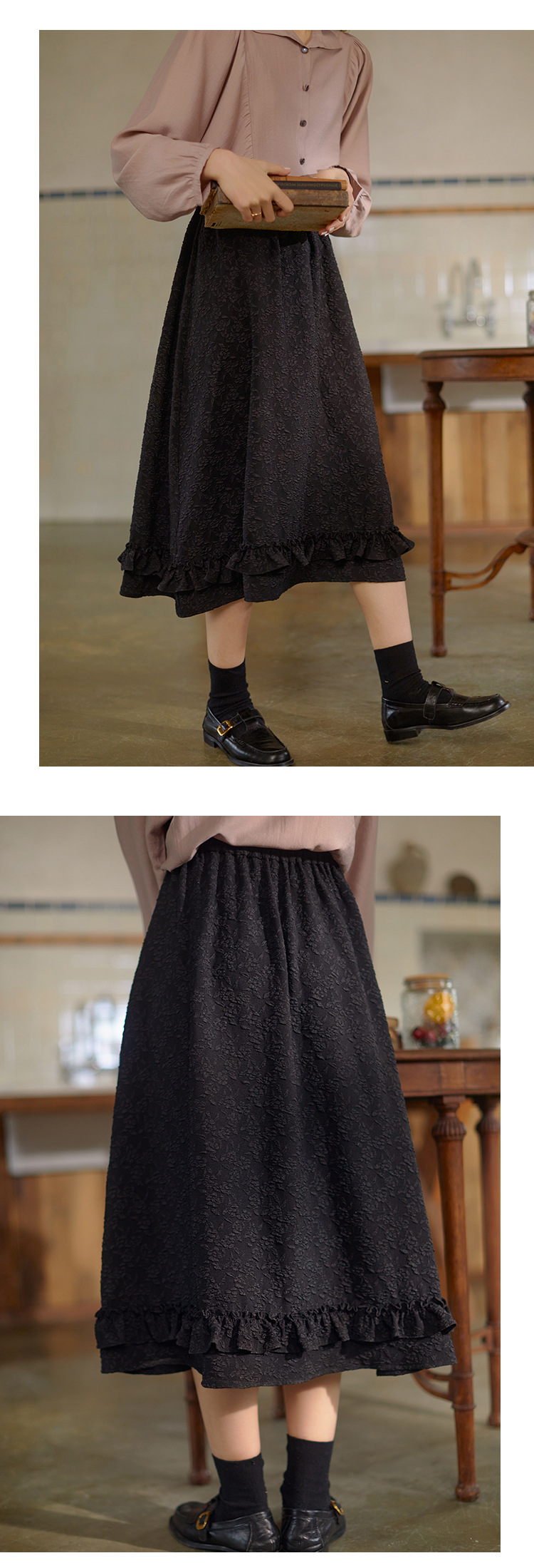 春夏百搭简约肌理花纹宽松型荷叶边纯色半身裙