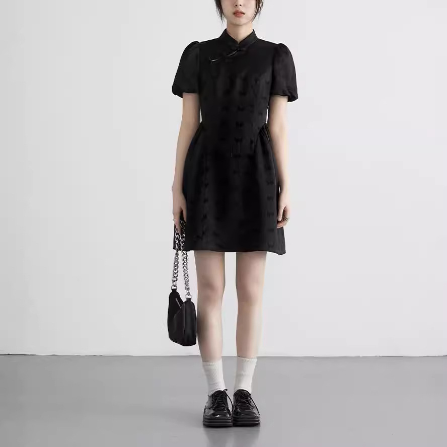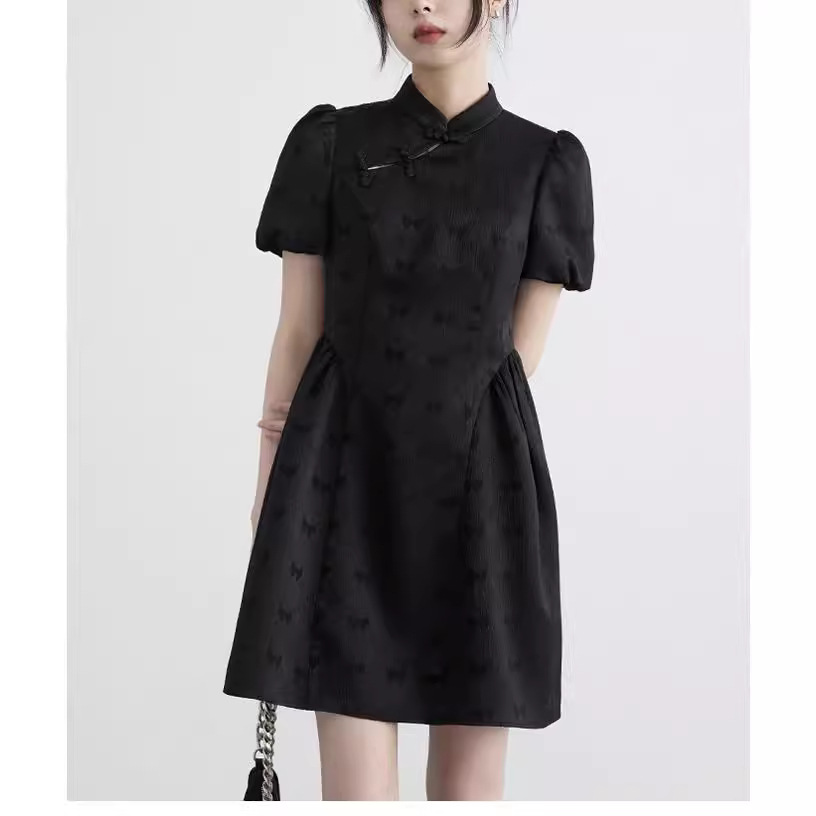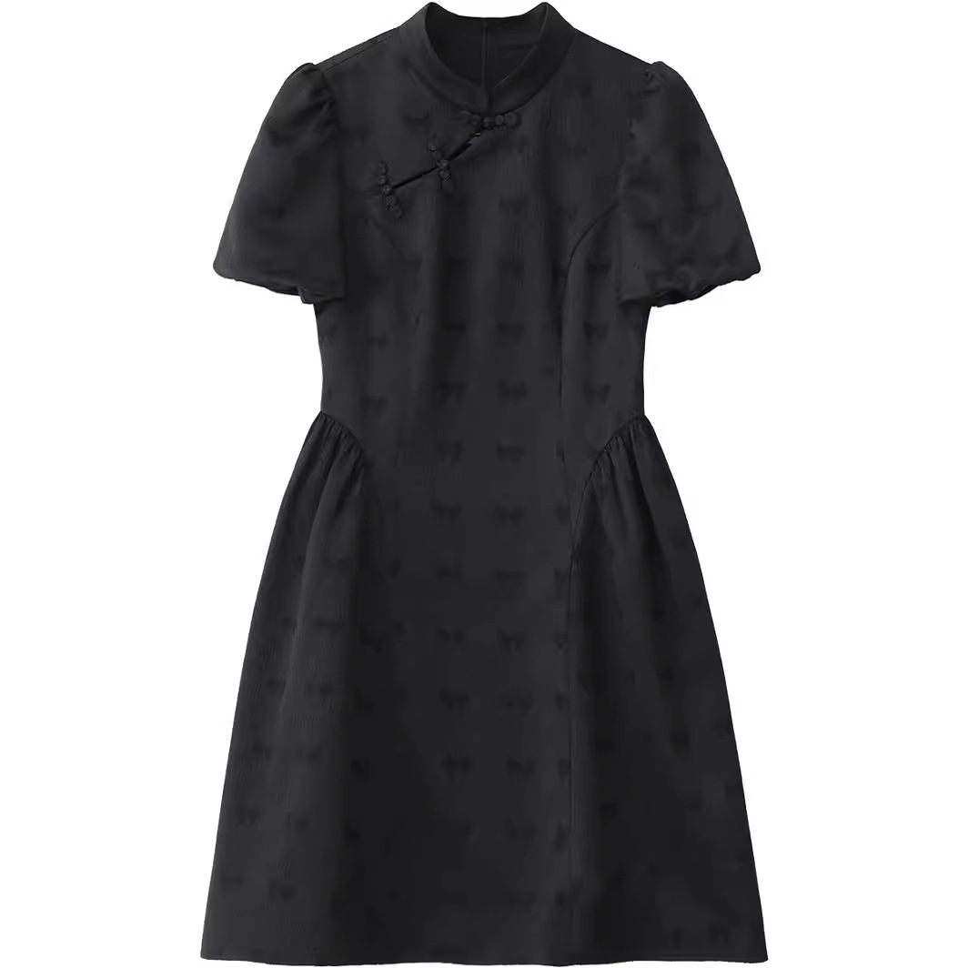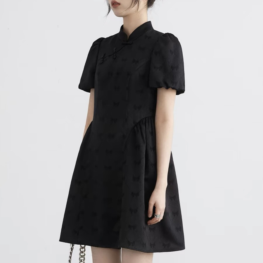 「浪漫出游」春季新中式仿醋酸蝴蝶结泡泡短袖旗袍连衣裙