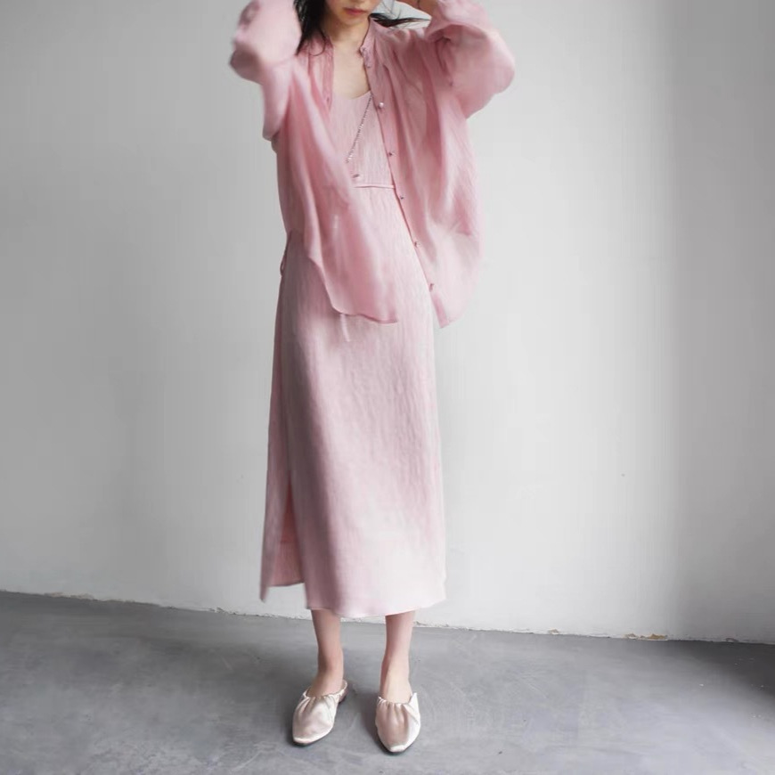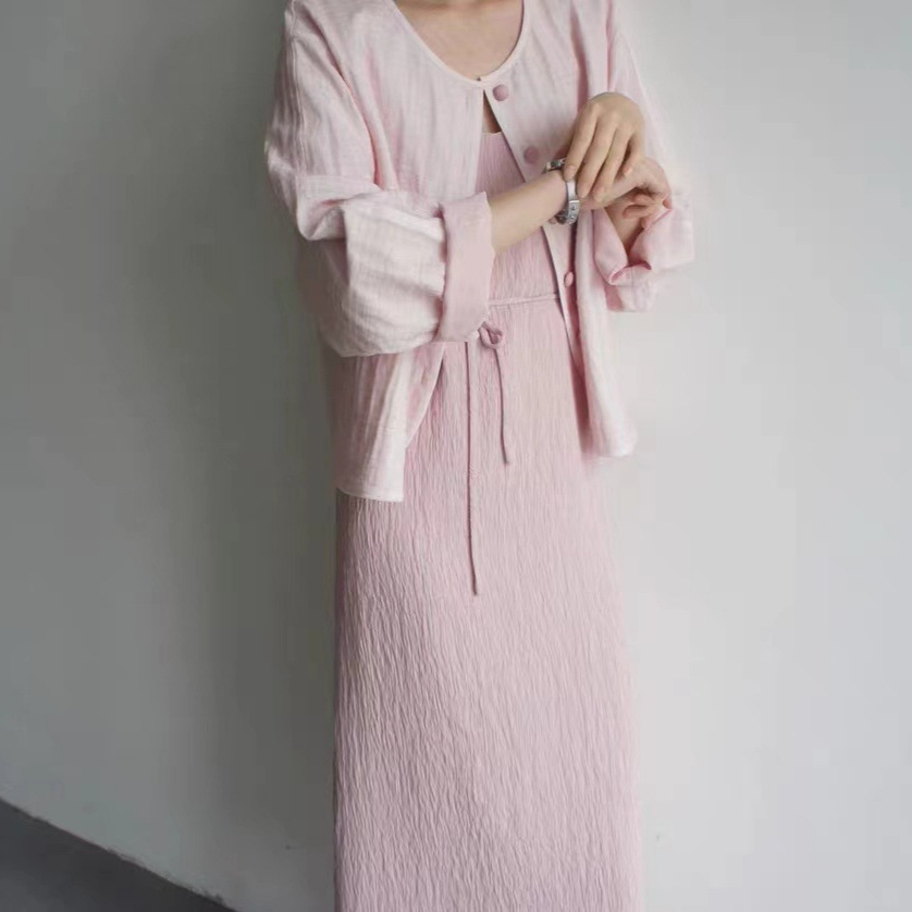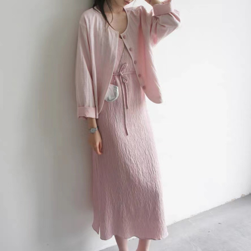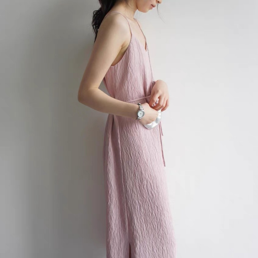 婴儿粉竖纹V领细肩带可调吊带高腰过膝连衣裙温柔