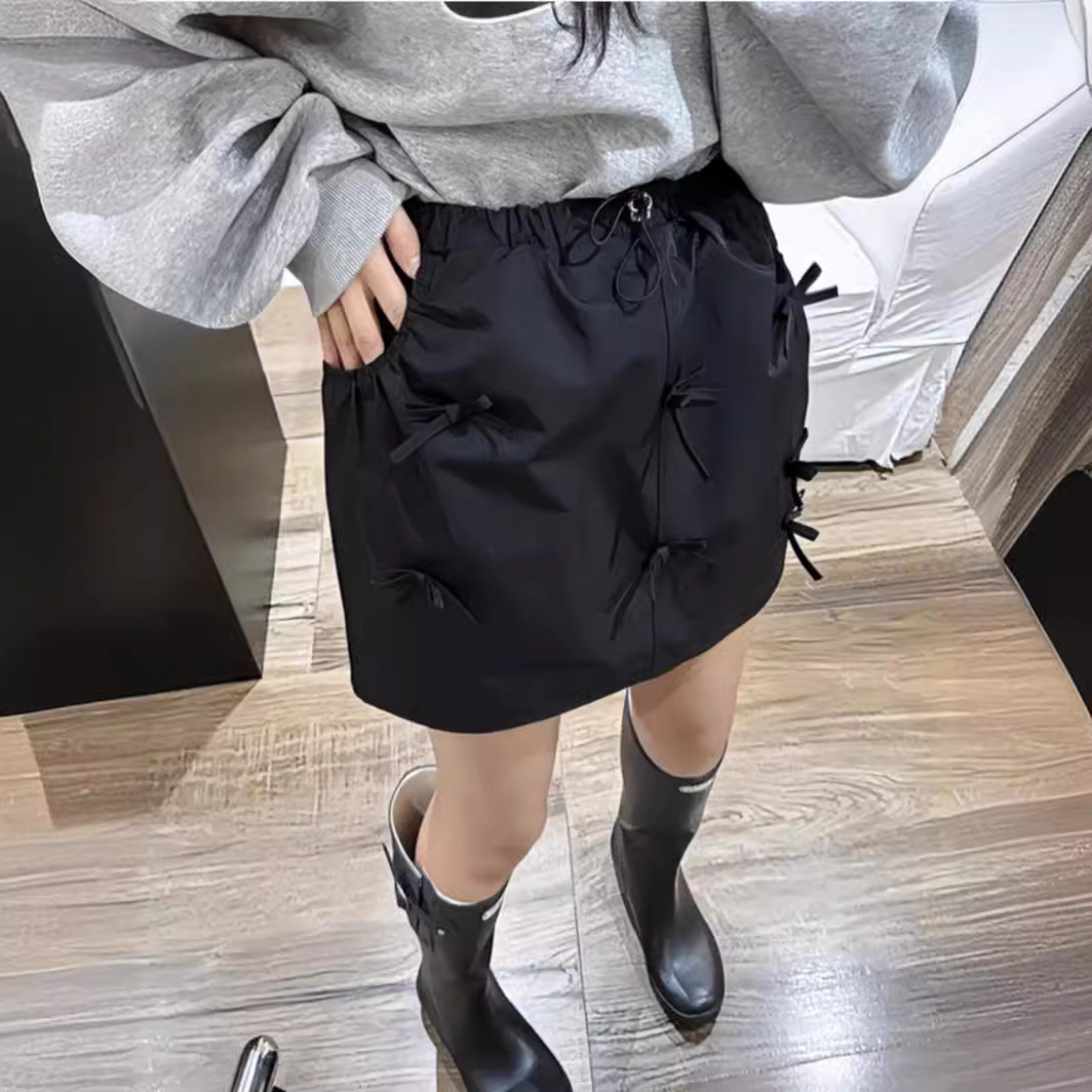 蝴蝶结工装花苞裙显瘦松紧腰a字短裙子女夏季新款美式半身裙