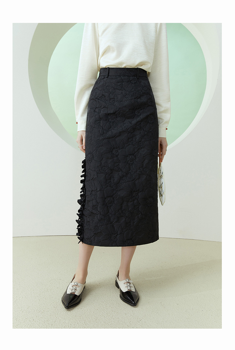 新中式黑色提花半身裙女秋季高腰直筒开叉裙子