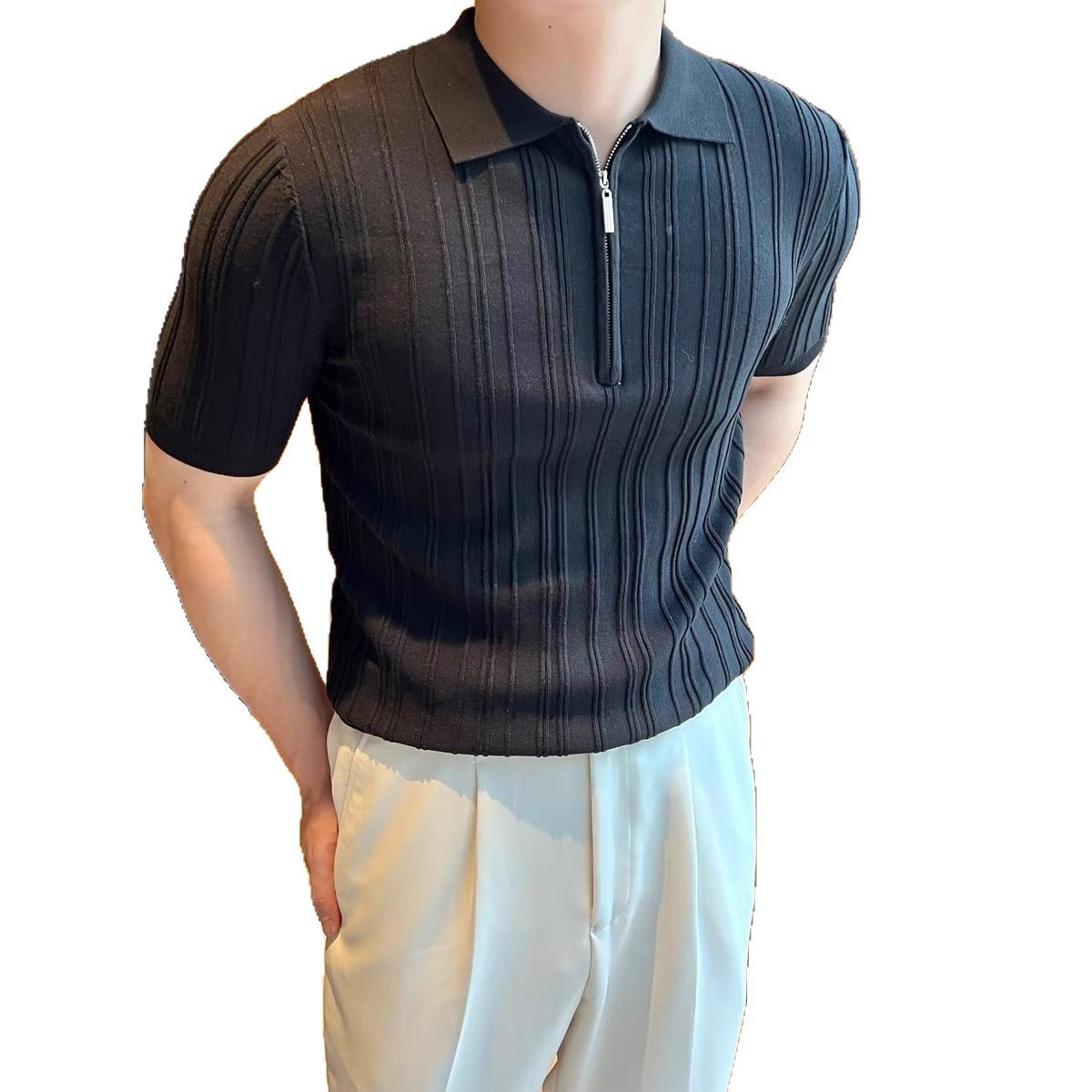 2025新款外贸版高质量美式拉链条纹冰丝polo衫夏季针织薄款短袖男
