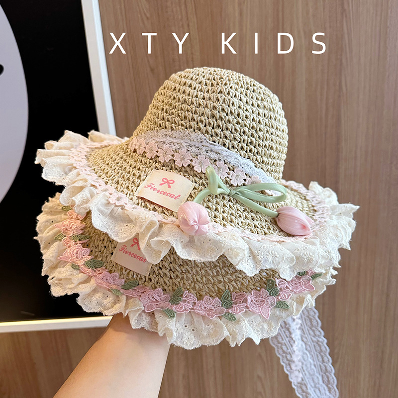 韩版草编儿童渔夫帽夏季大帽檐海边防晒甜美郁金香女宝宝遮阳帽子