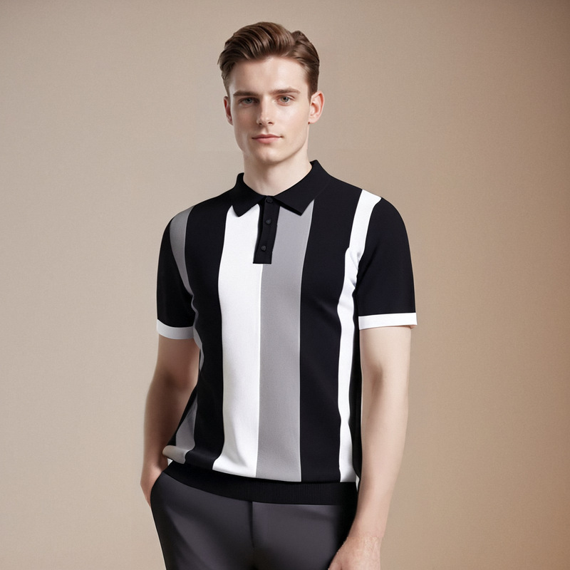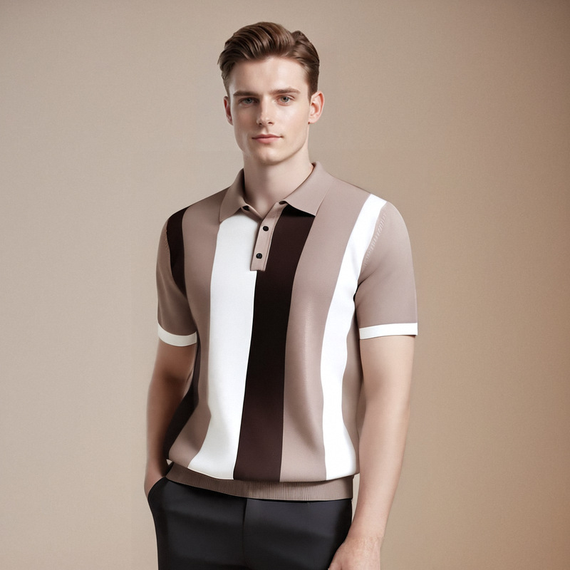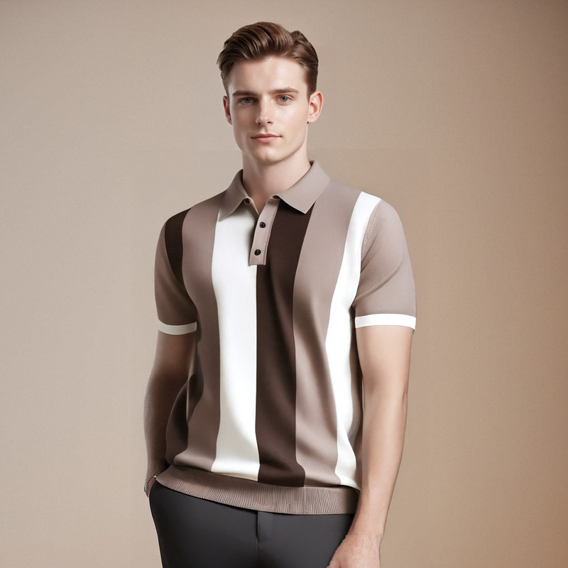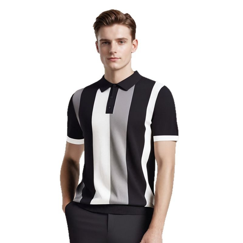 冰丝polo衫男短袖夏季2025新款高端翻领拼接条纹针织t恤修身潮流