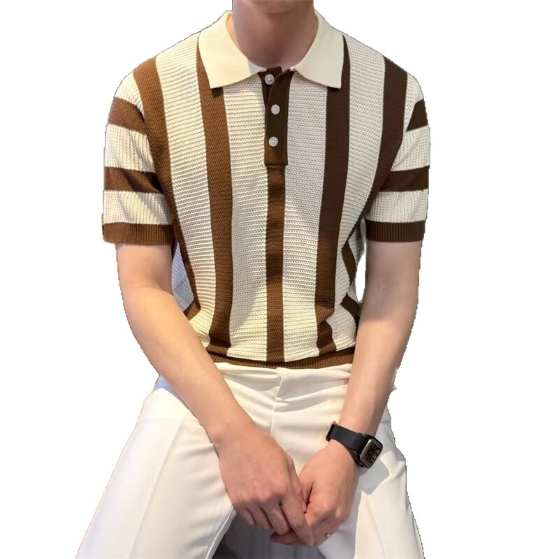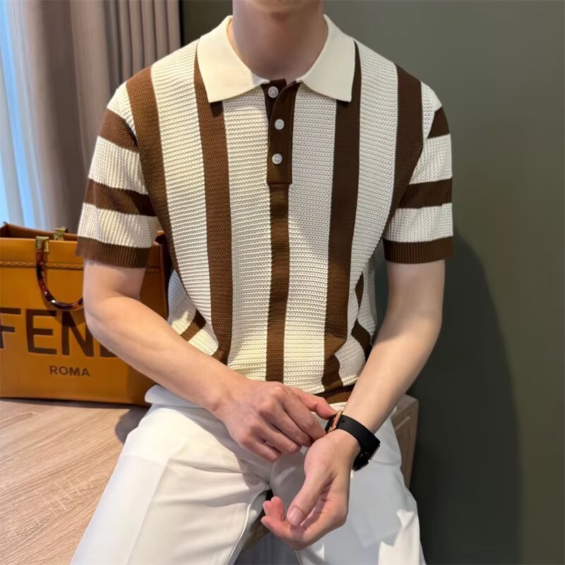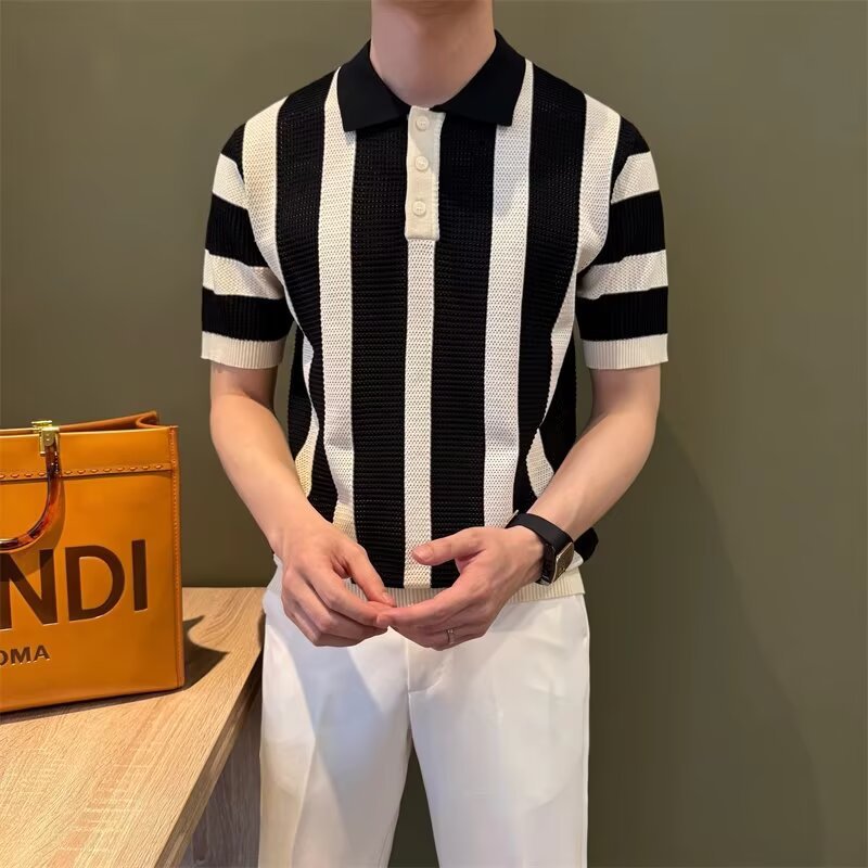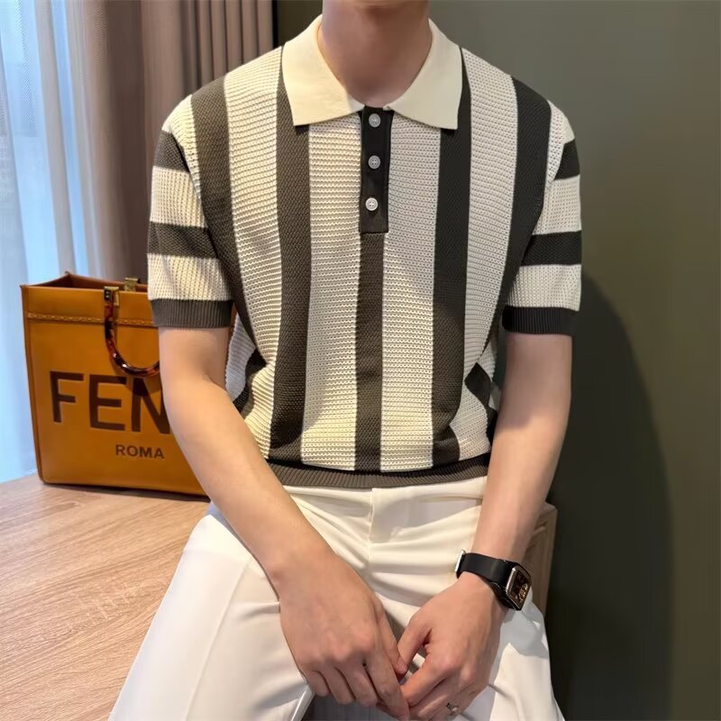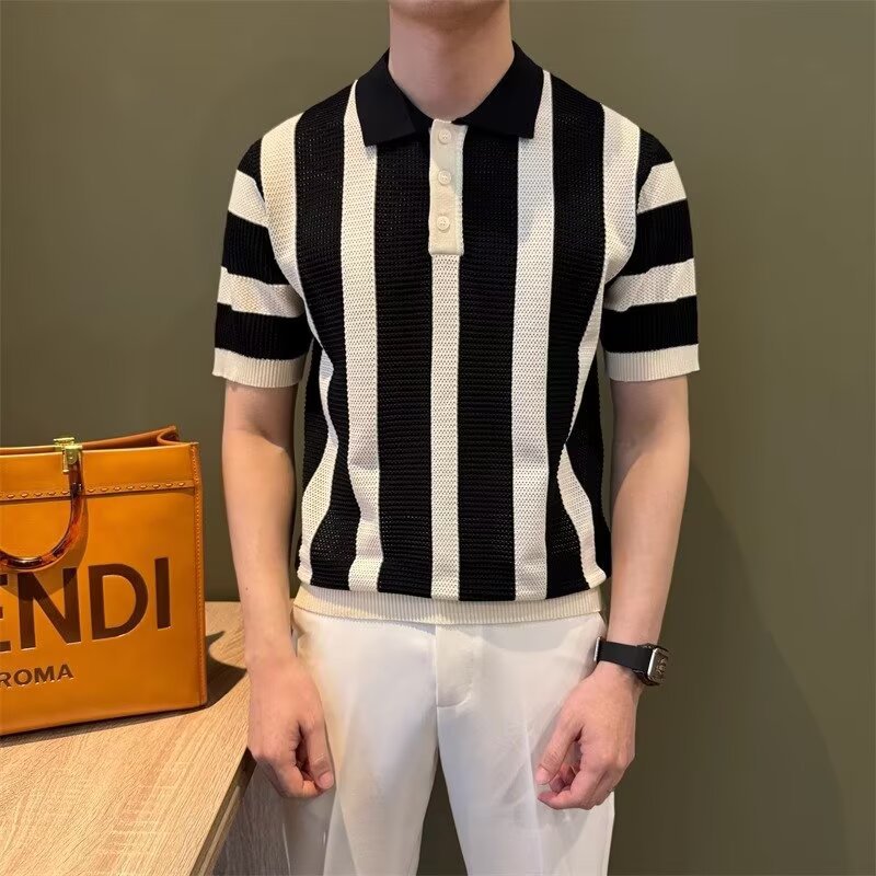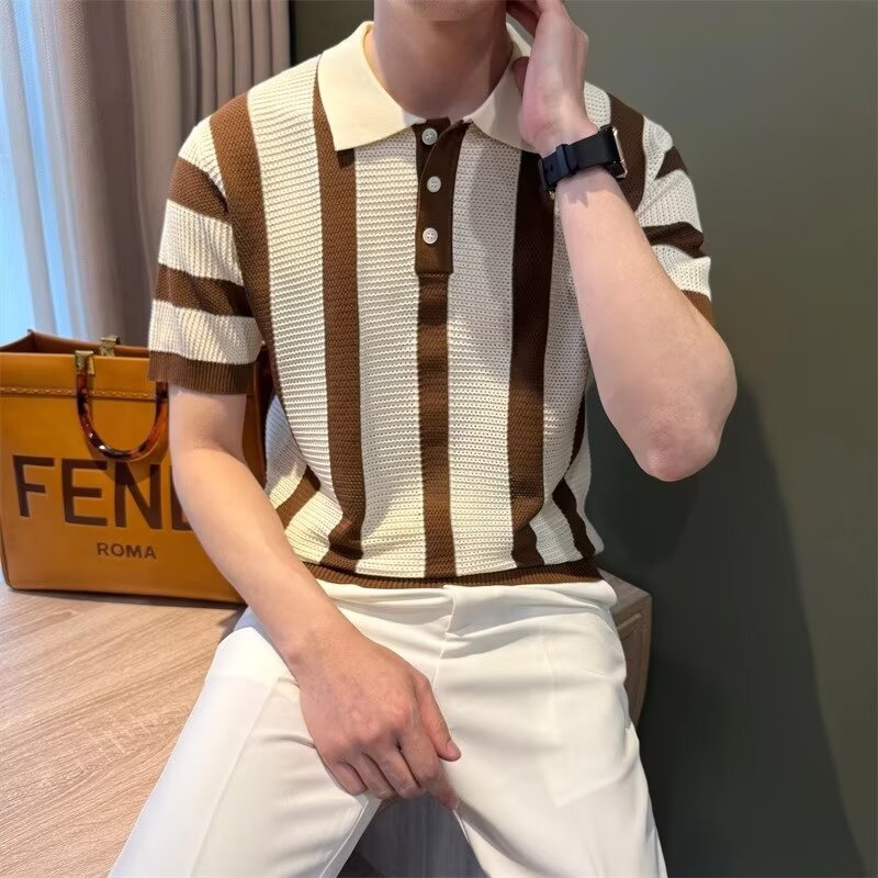 条纹针织Polo衫男士痞帅翻领T恤2025新款夏季潮流休闲半袖体恤薄t