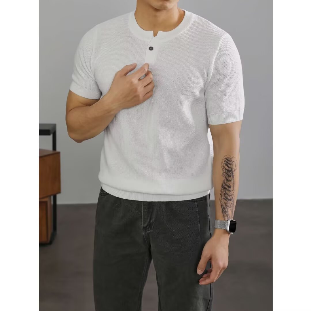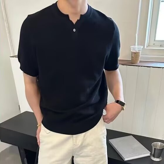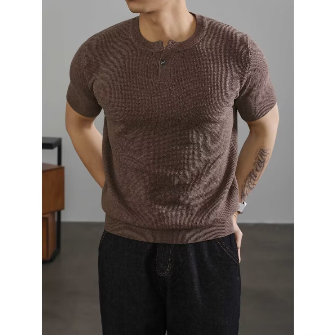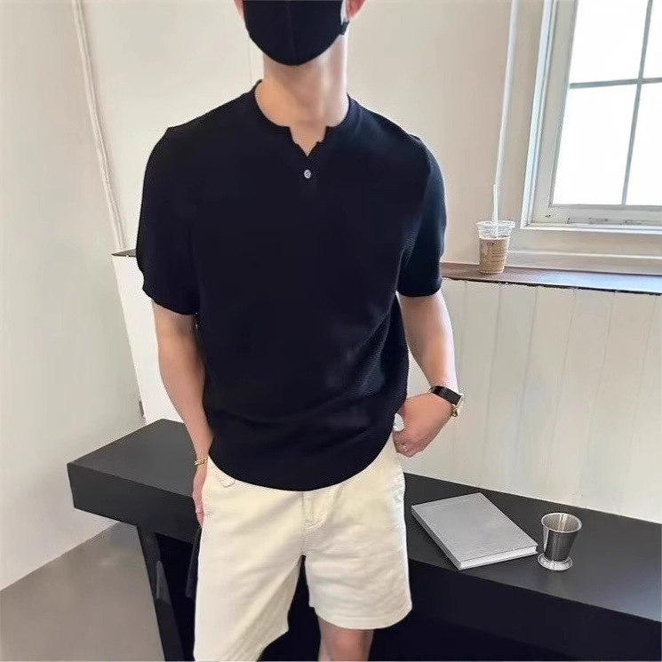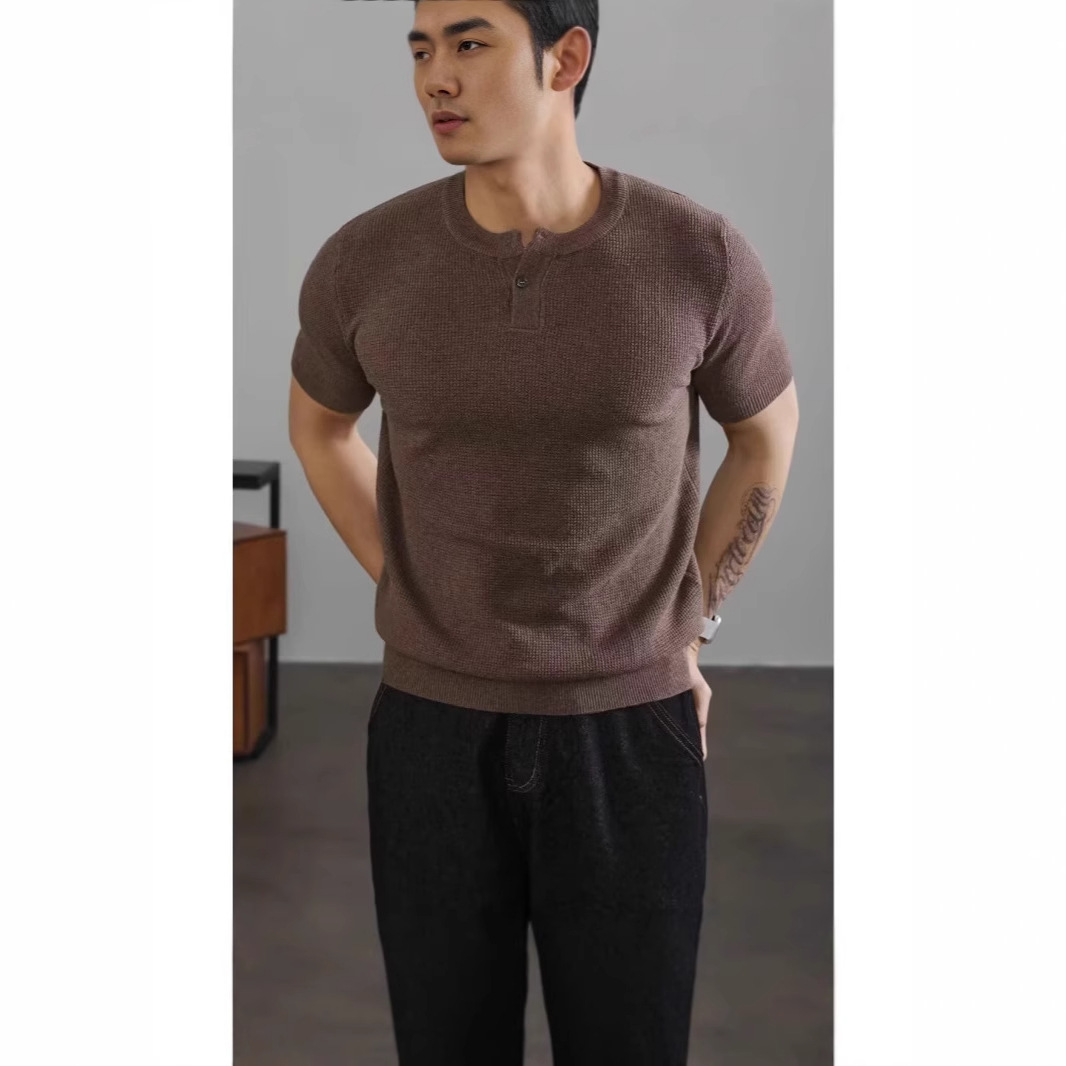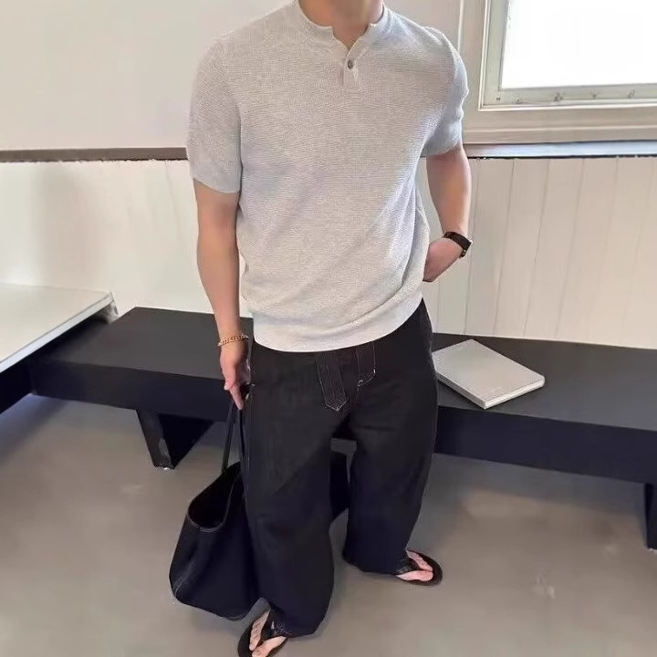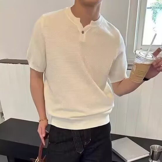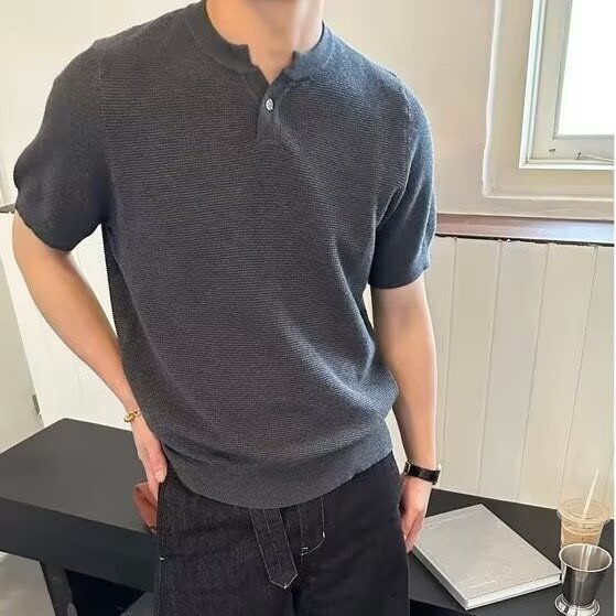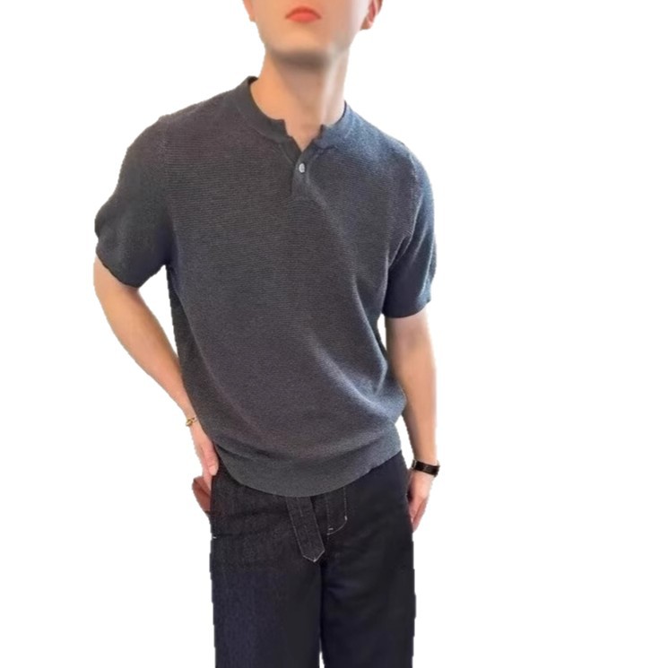 亨利领短袖针织衫男菠萝纹简约夏季冰丝透气百搭内搭