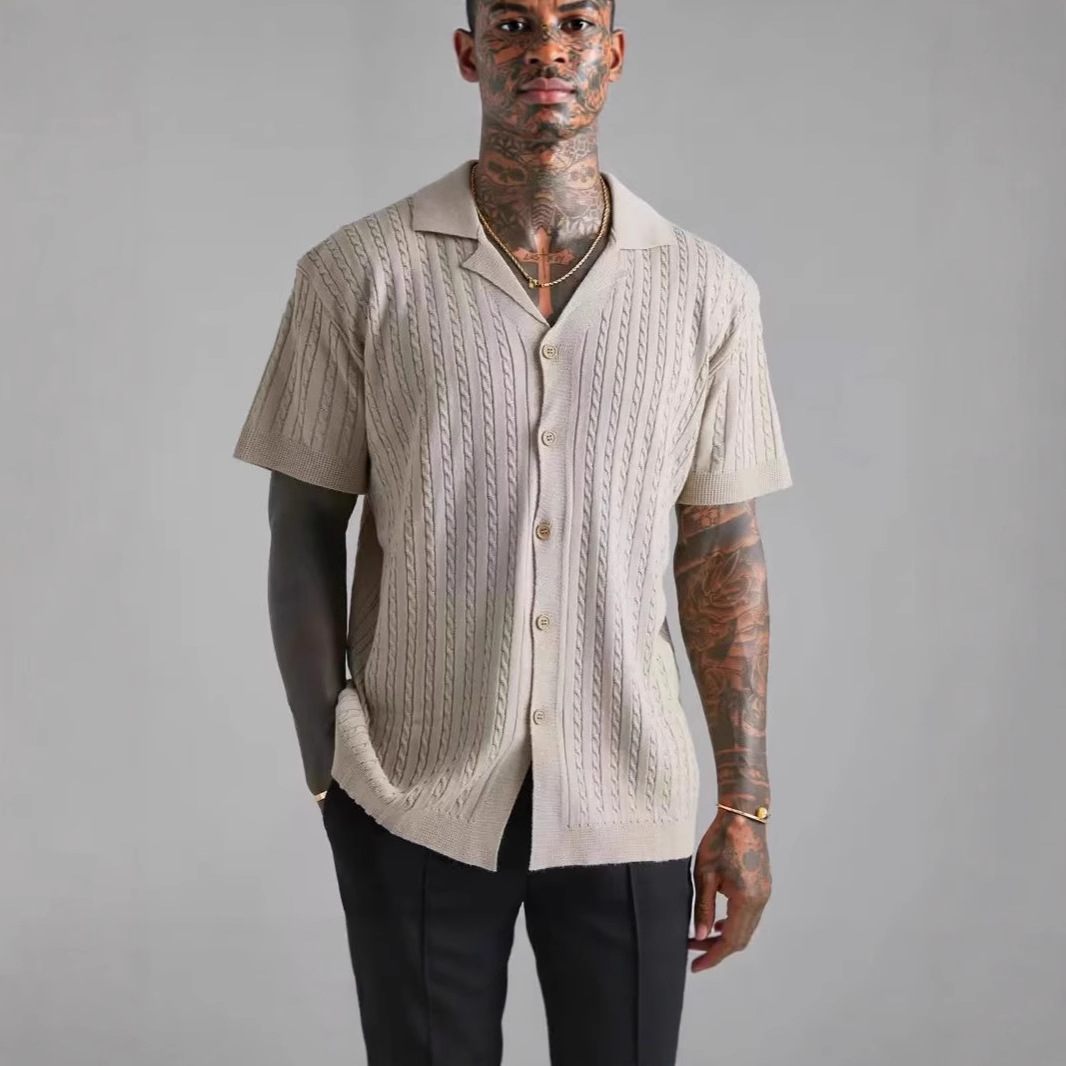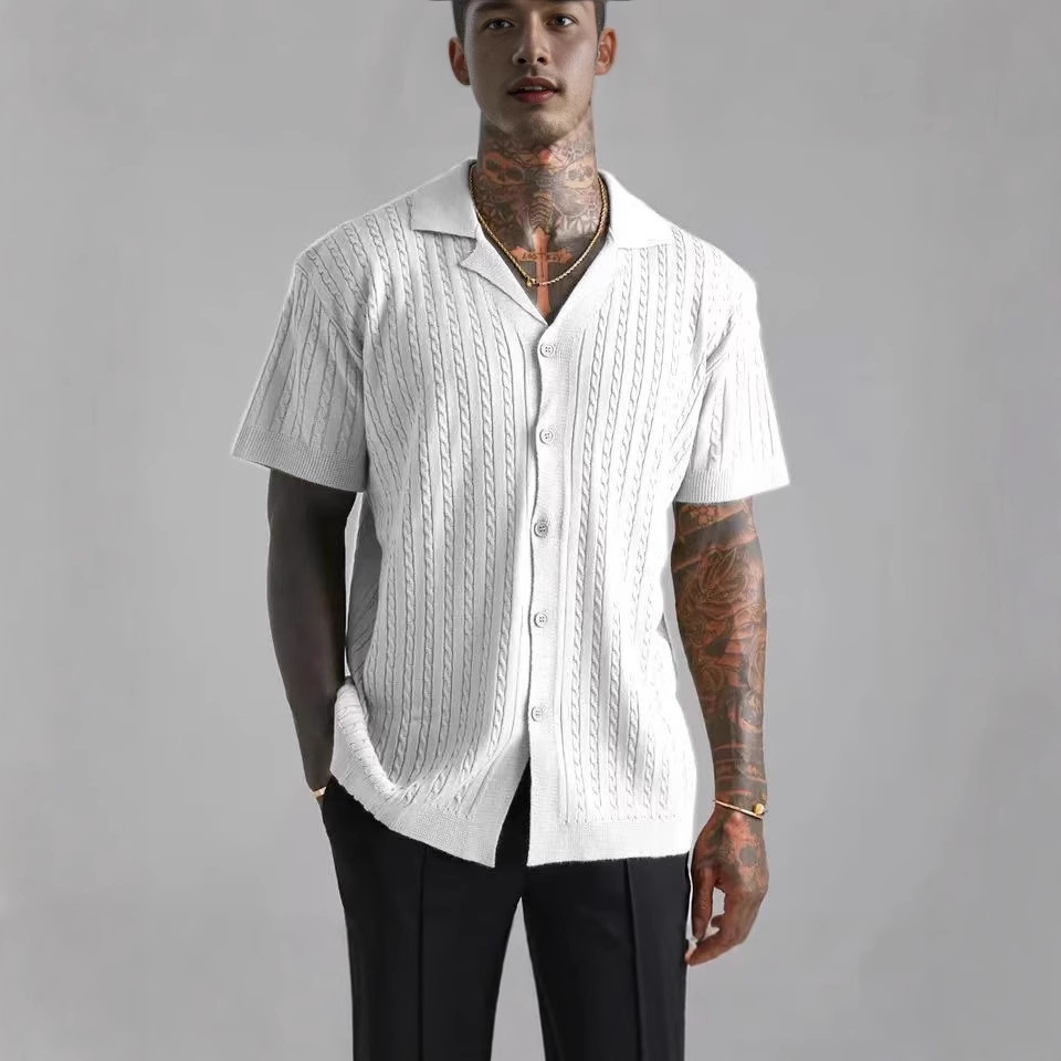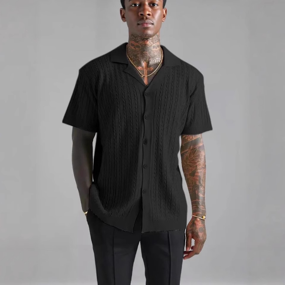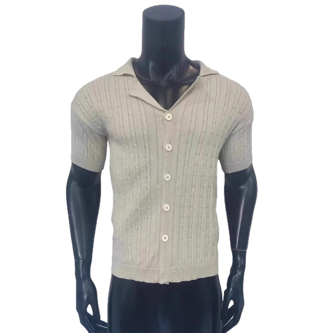 夏季外贸男士慵懒风纽花纯色开衫纽扣宽松休闲翻领针织短袖Polo衫