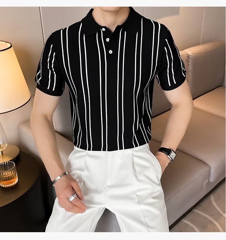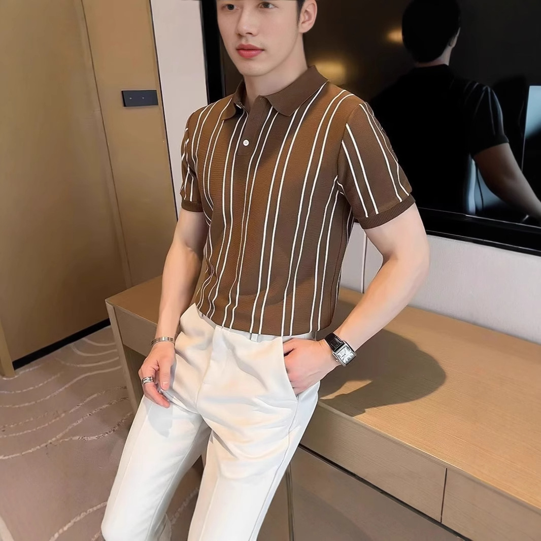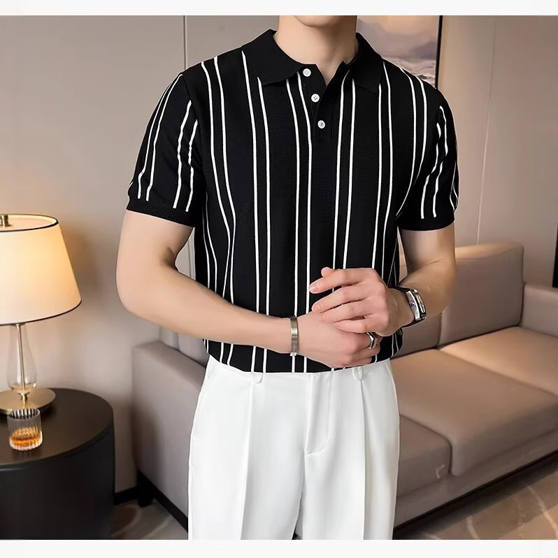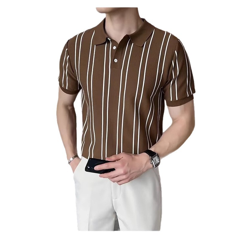 夏季新款韩版条纹翻领冰丝T恤修身针织短袖Polo衫痞帅出街男上衣