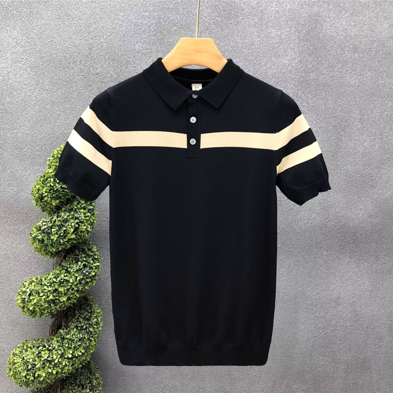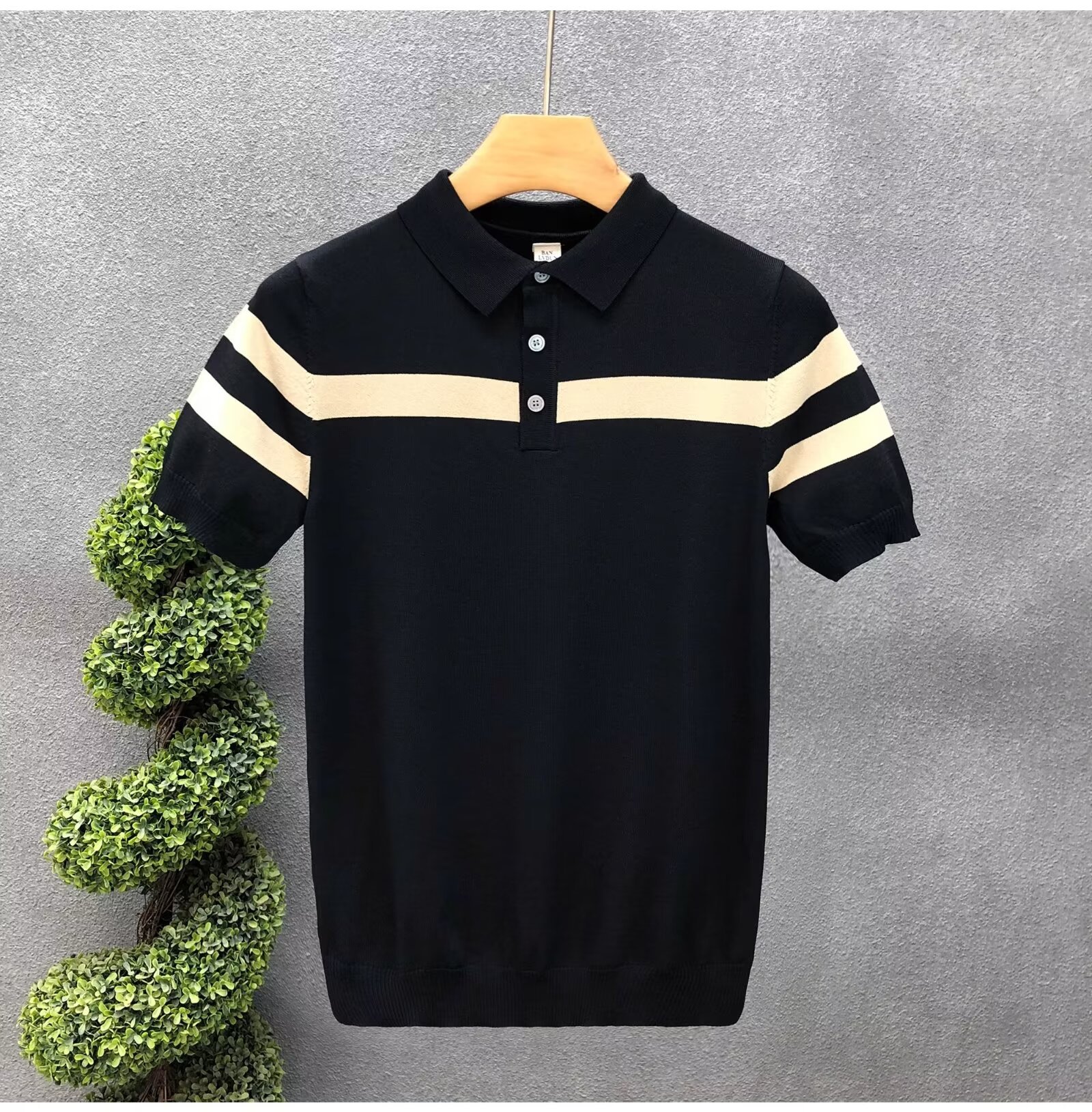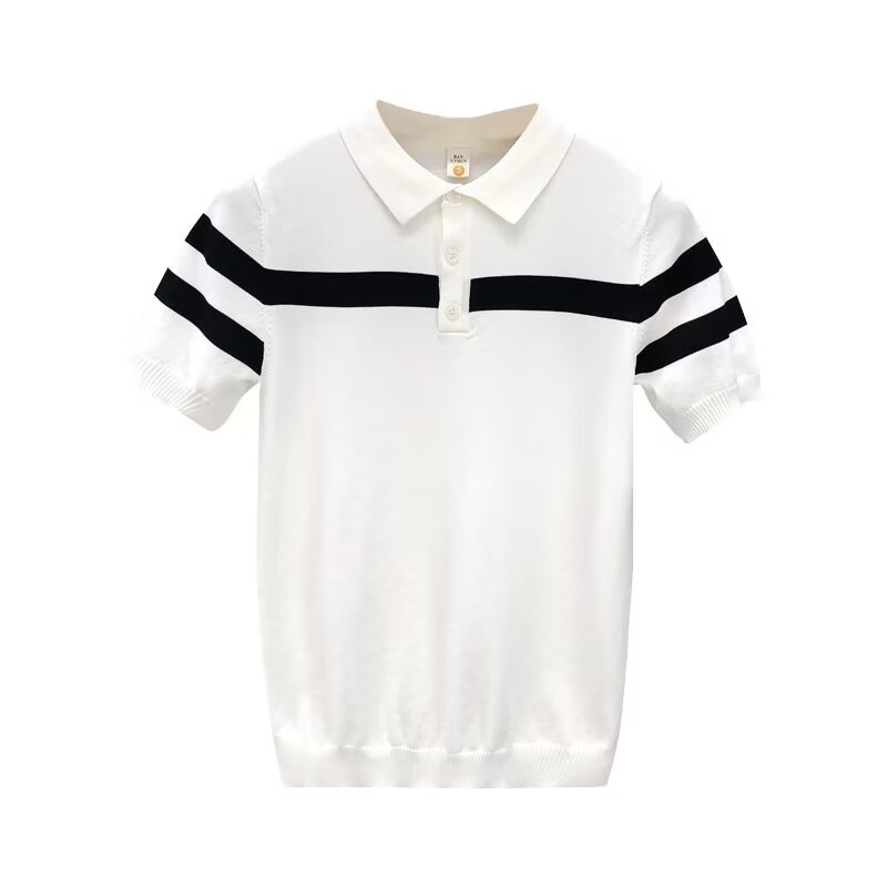 2025简约条纹撞色针织T恤冰丝POLO衫男休闲百搭弹力透气带领体恤